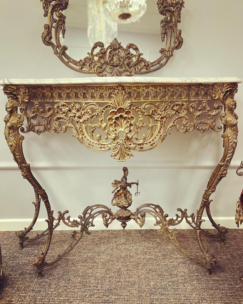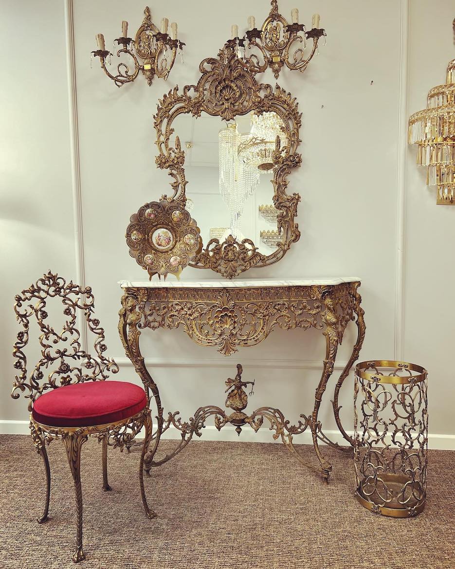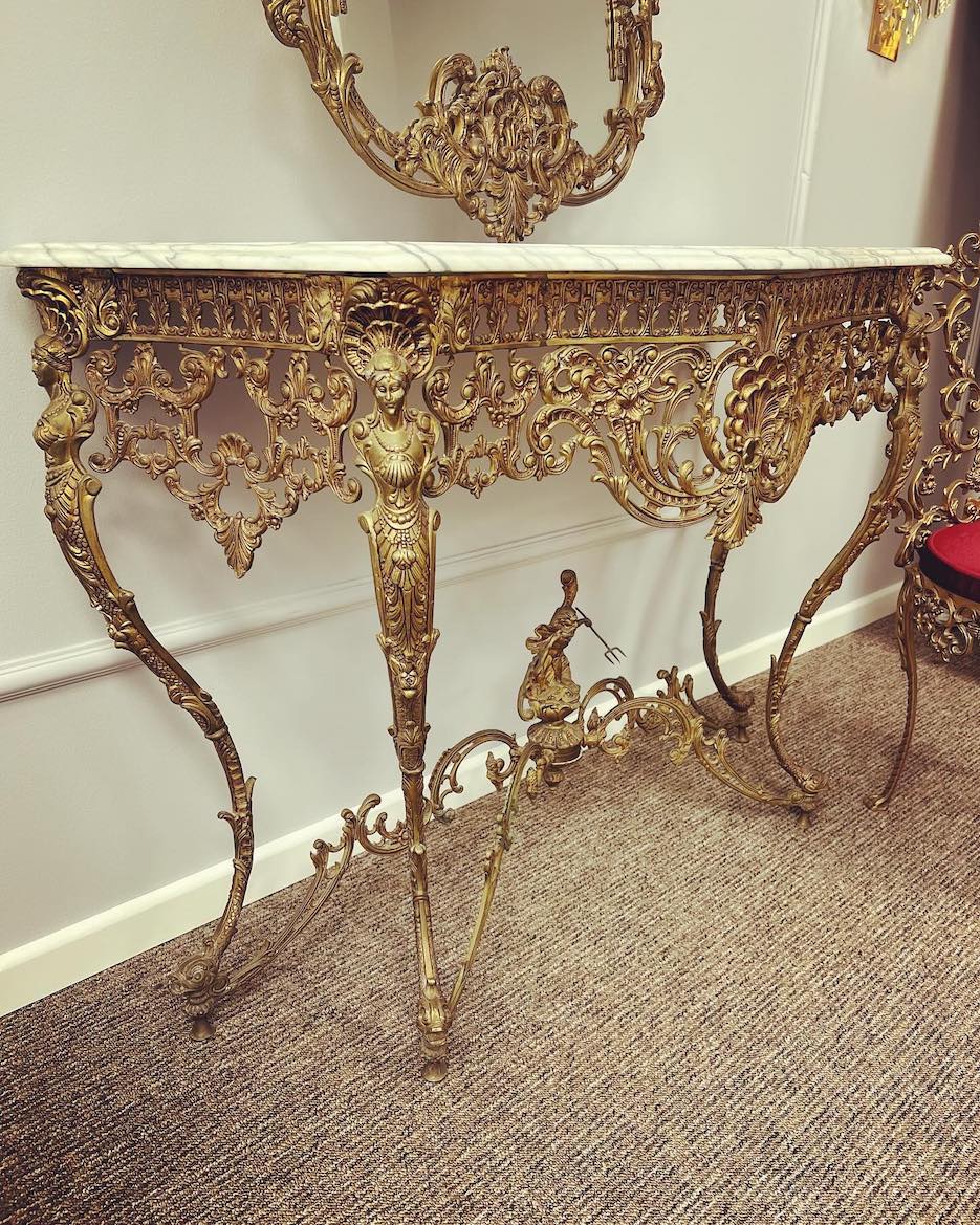 Išskirtinis ankstyvojo XX a. pradžios Rococo Revival stiliaus interjero komplektas – ažūriškai dekoruota bronzinė konsolė su natūralaus akmens stalviršiu ir masyvus, puošnus veidrodis. Šie baldai buvo gaminami laikotarpiu, kai Europoje vėl atgimė praeities aristokratiniai stiliai – šiandien jie vertinami dėl savo išliekamosios meninės ir kolekcinės vertės.