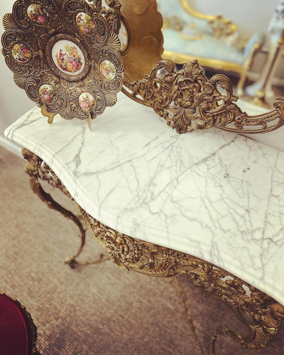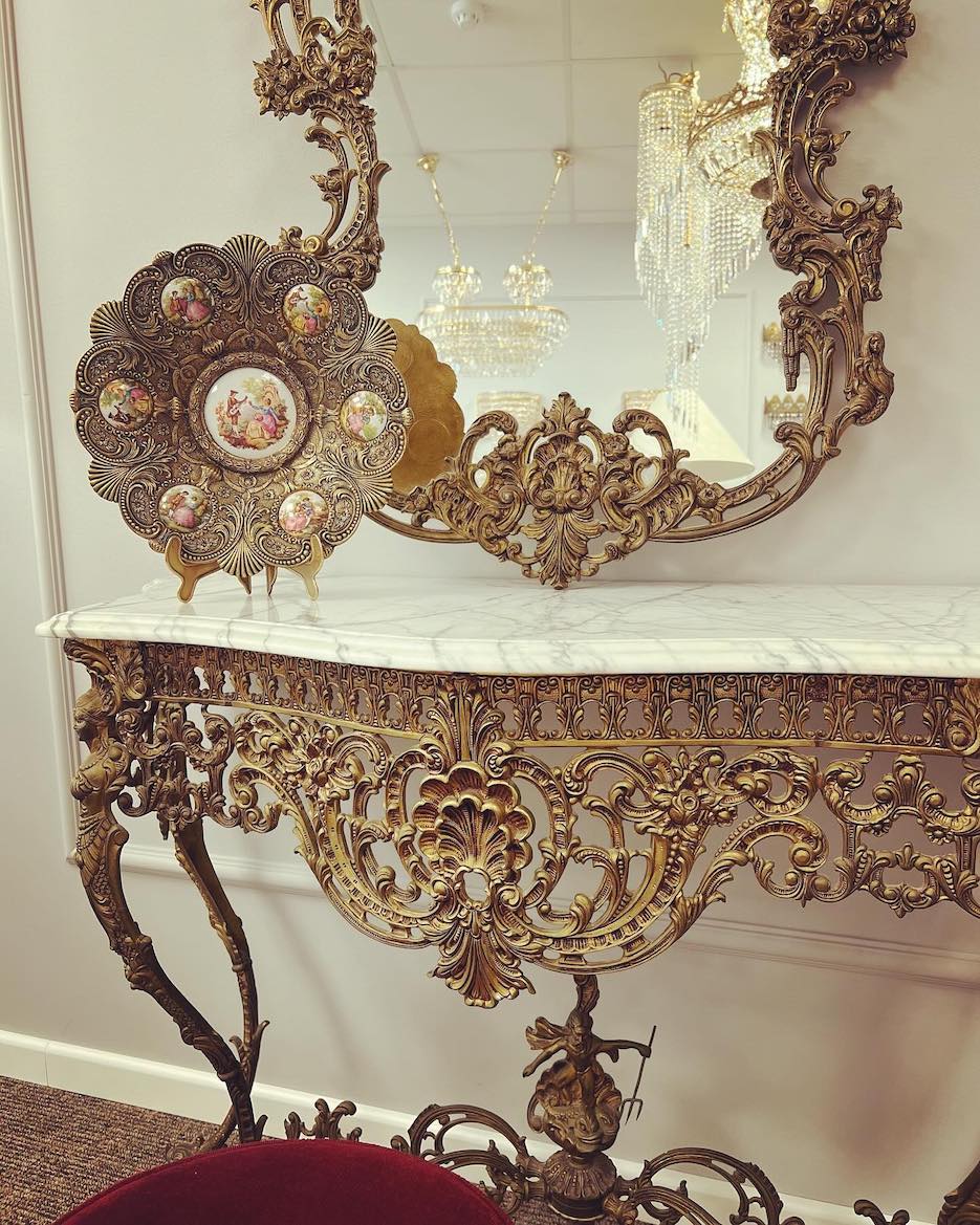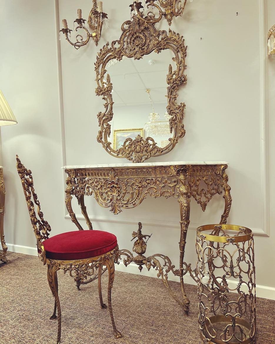 Išskirtinis ankstyvojo XX a. pradžios Rococo Revival stiliaus interjero komplektas – ažūriškai dekoruota bronzinė konsolė su natūralaus akmens stalviršiu ir masyvus, puošnus veidrodis. Šie baldai buvo gaminami laikotarpiu, kai Europoje vėl atgimė praeities aristokratiniai stiliai – šiandien jie vertinami dėl savo išliekamosios meninės ir kolekcinės vertės.