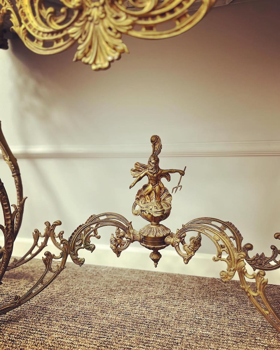 ♦ Komplektas pagamintas iš sunkios, liejimo būdu formuotos bronzos. Konsolės stalviršis marmuras, o ornamentai gausūs: kriauklės, lapų motyvai, sirenos ir Poseidonas.