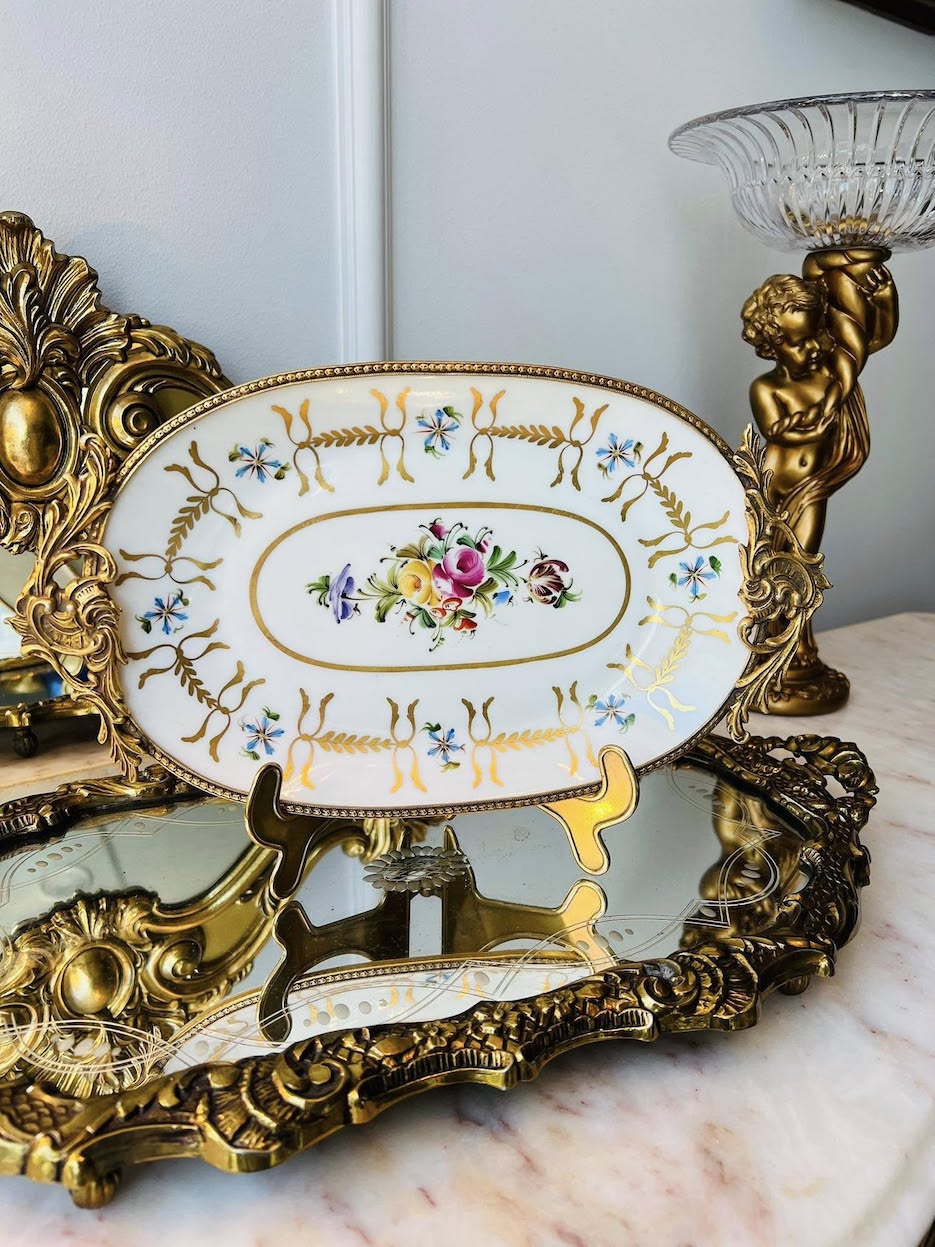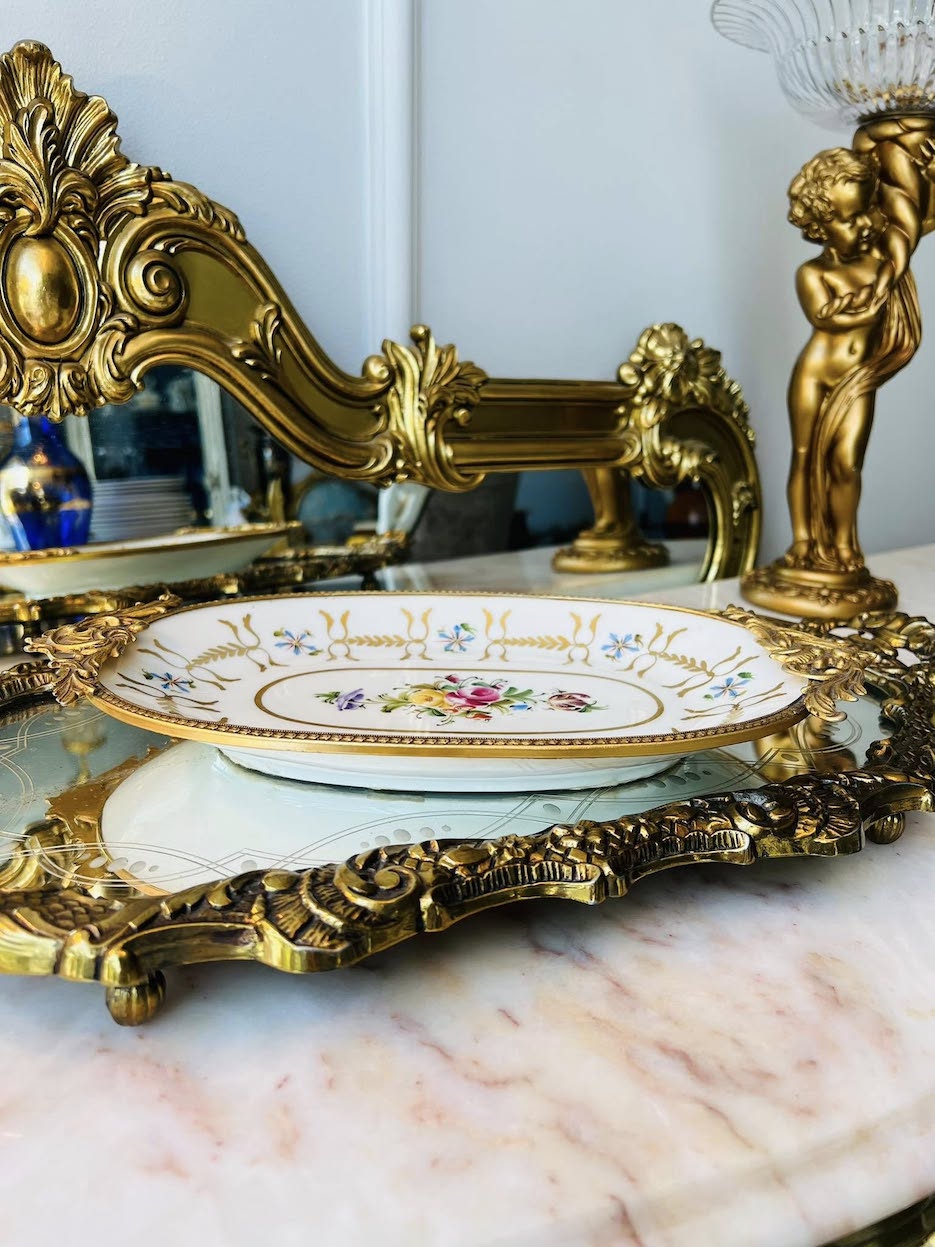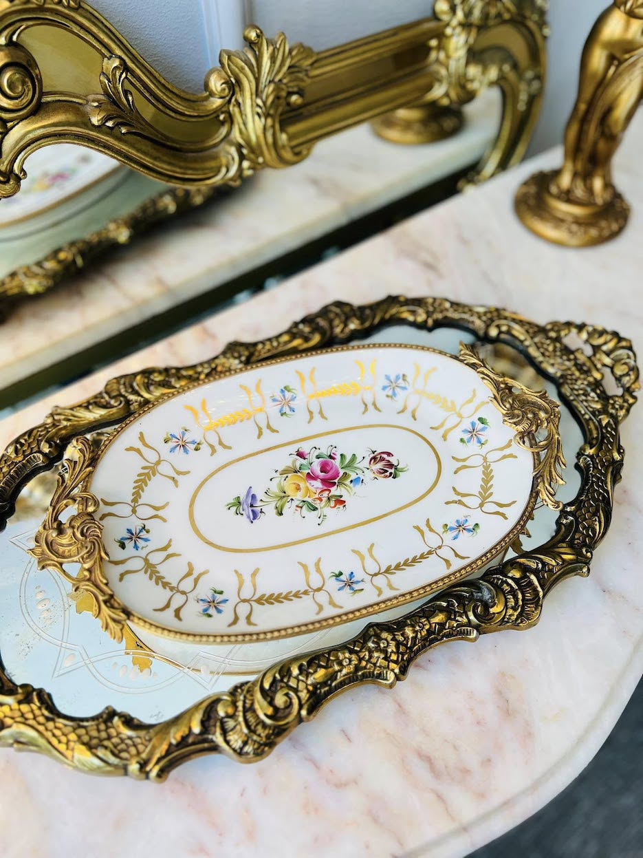 Subtilios rankomis tapytos gėlių girliandos derinamos su puošniomis žalvario detalėmis, kuriančiomis prabangos ir laikmečio dvelksmą. Ši lėkštė ne tik puošia, bet ir pasakoja istoriją.