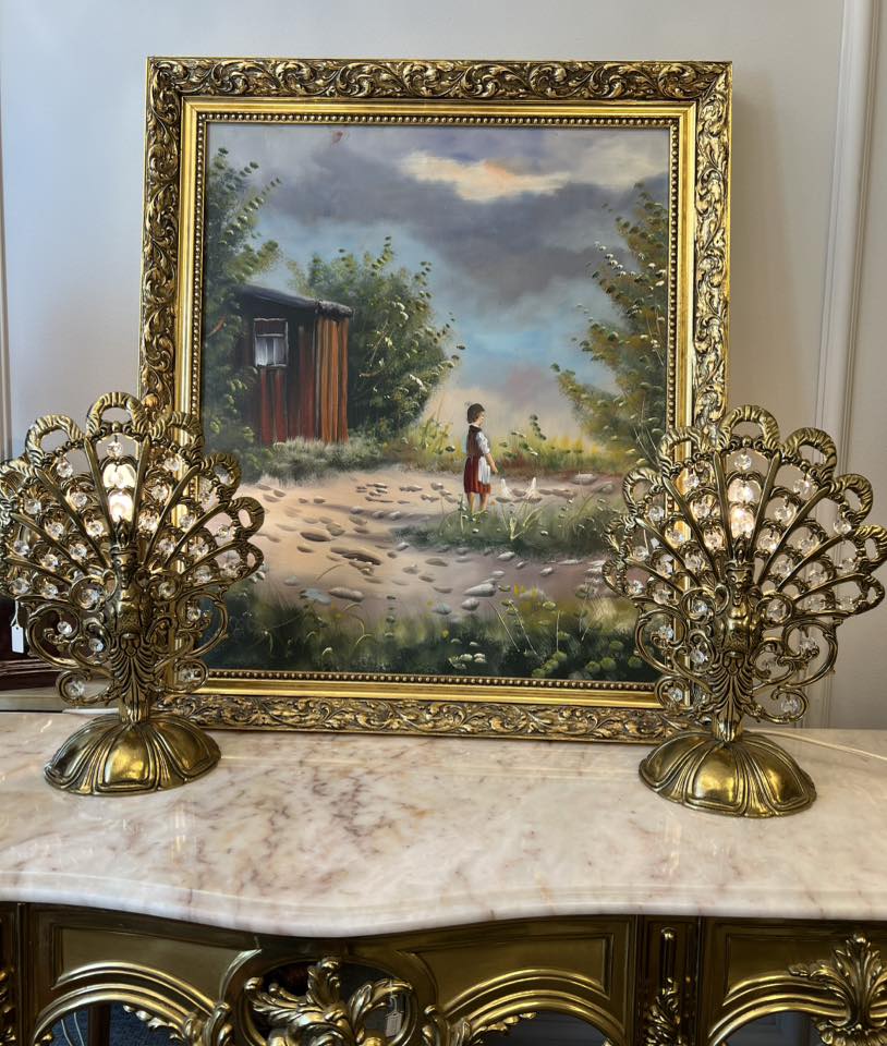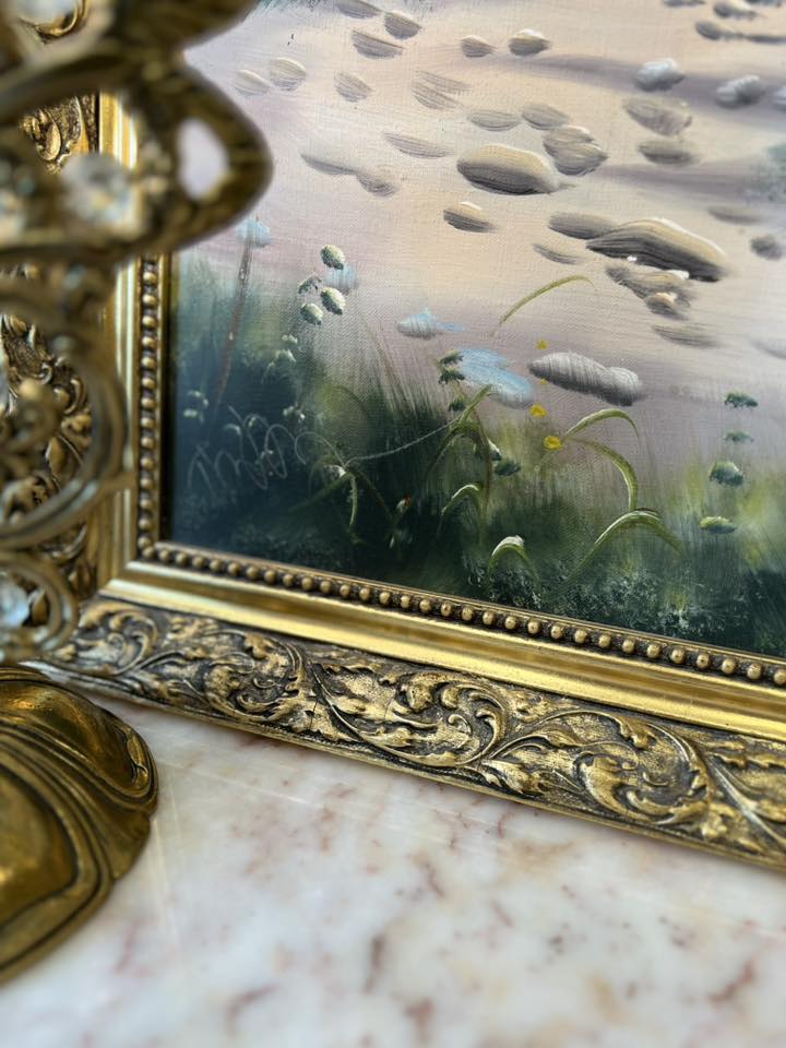 Autentiškas, rankomis tapytas vintažinis paveikslas ant drobės, įrėmintas mediniame aukso spalvos rėme.