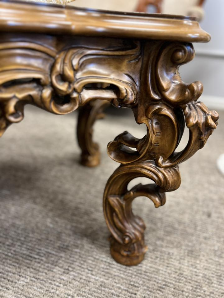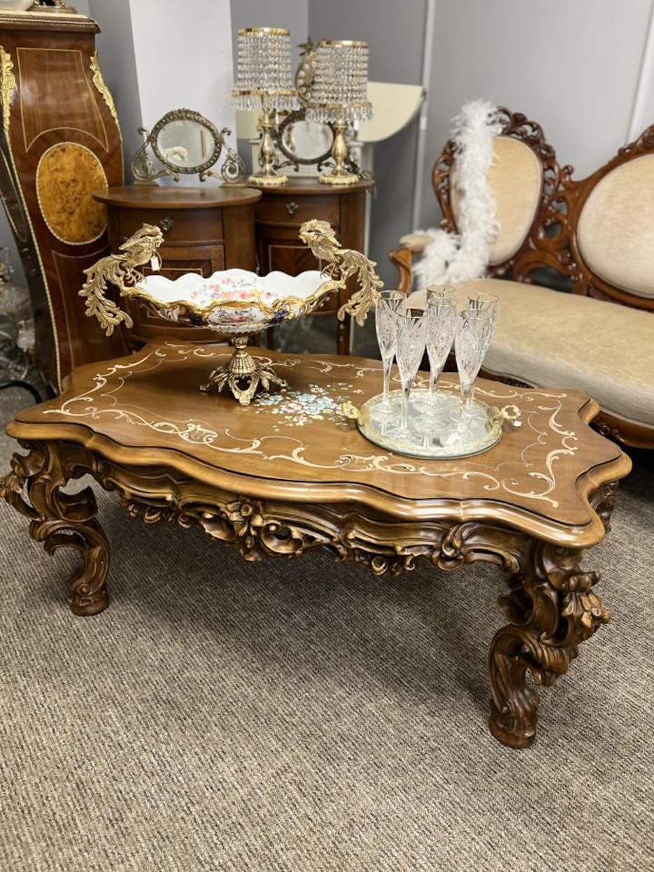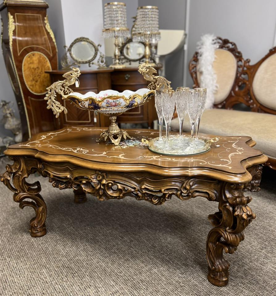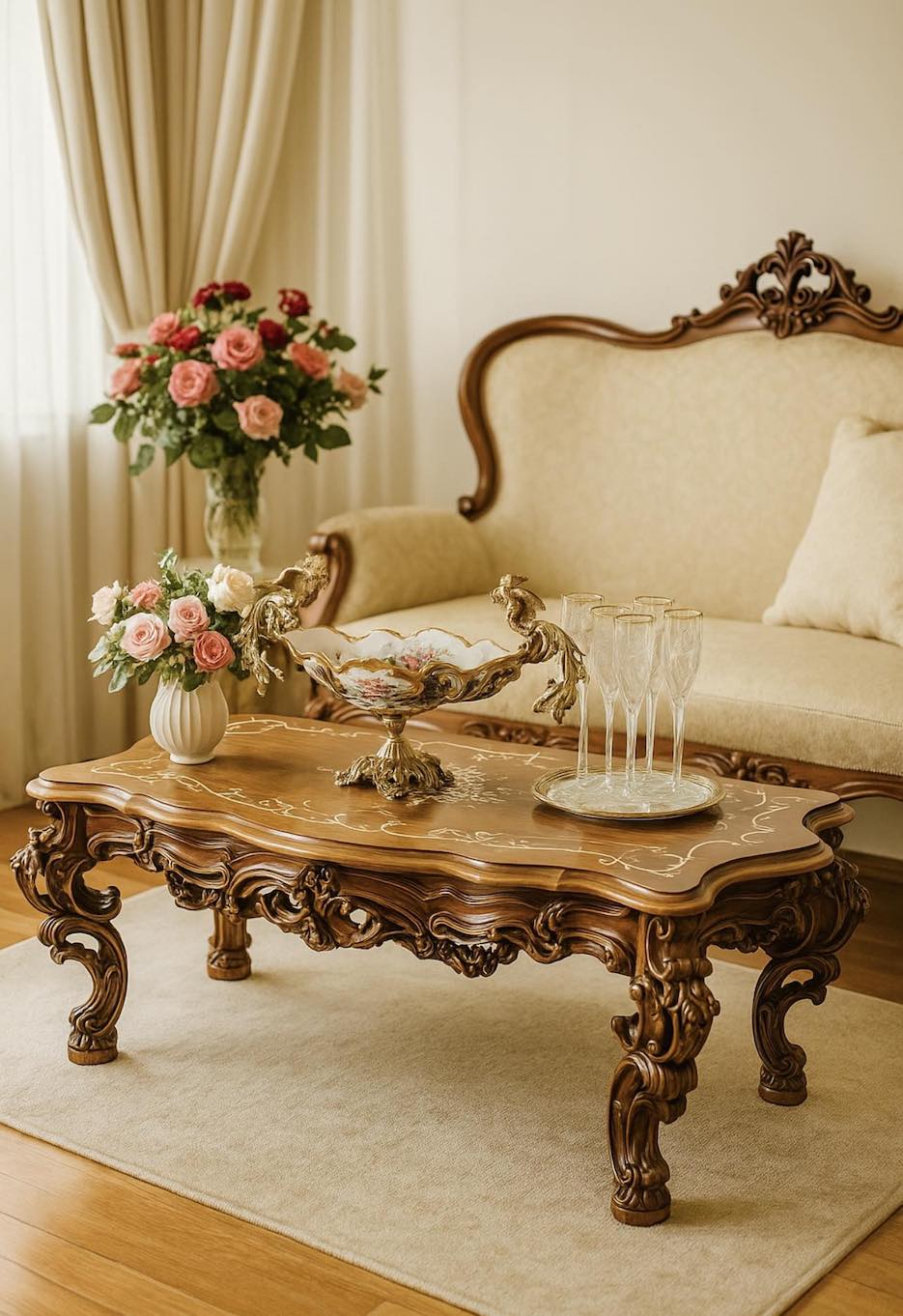 ♦ Raižytos kojos, augaliniai motyvai ir lengvai banguotas stalviršio kontūras atspindi baroko laikotarpio formas bei meistrystę.