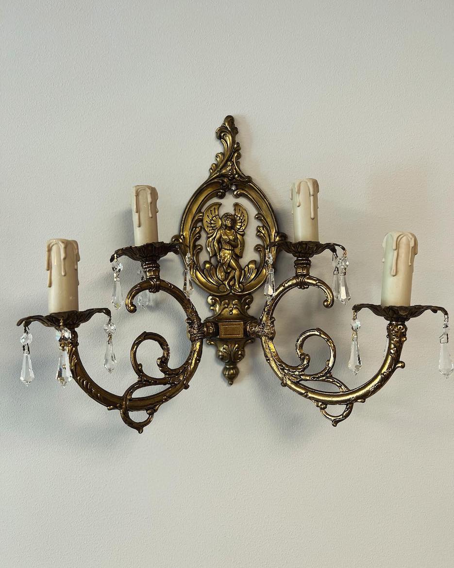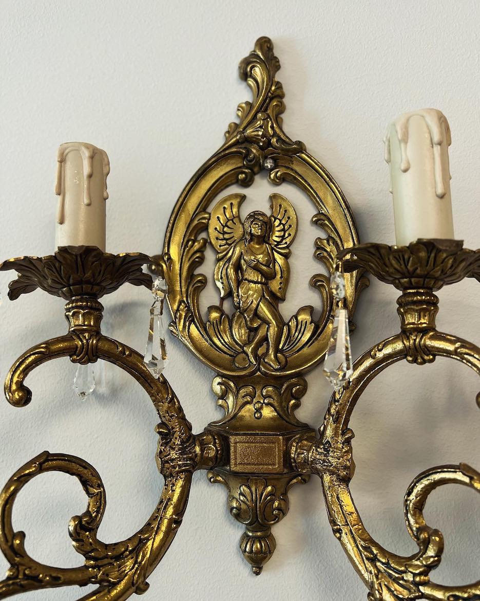 Du masyvūs, vintažiniai sieniniai šviestuvai, pagaminti iš bronzos, dekoruoti išraiškingu reljefu ir klasikine skulptūrine kompozicija.