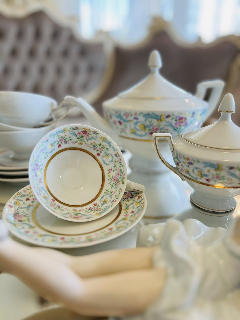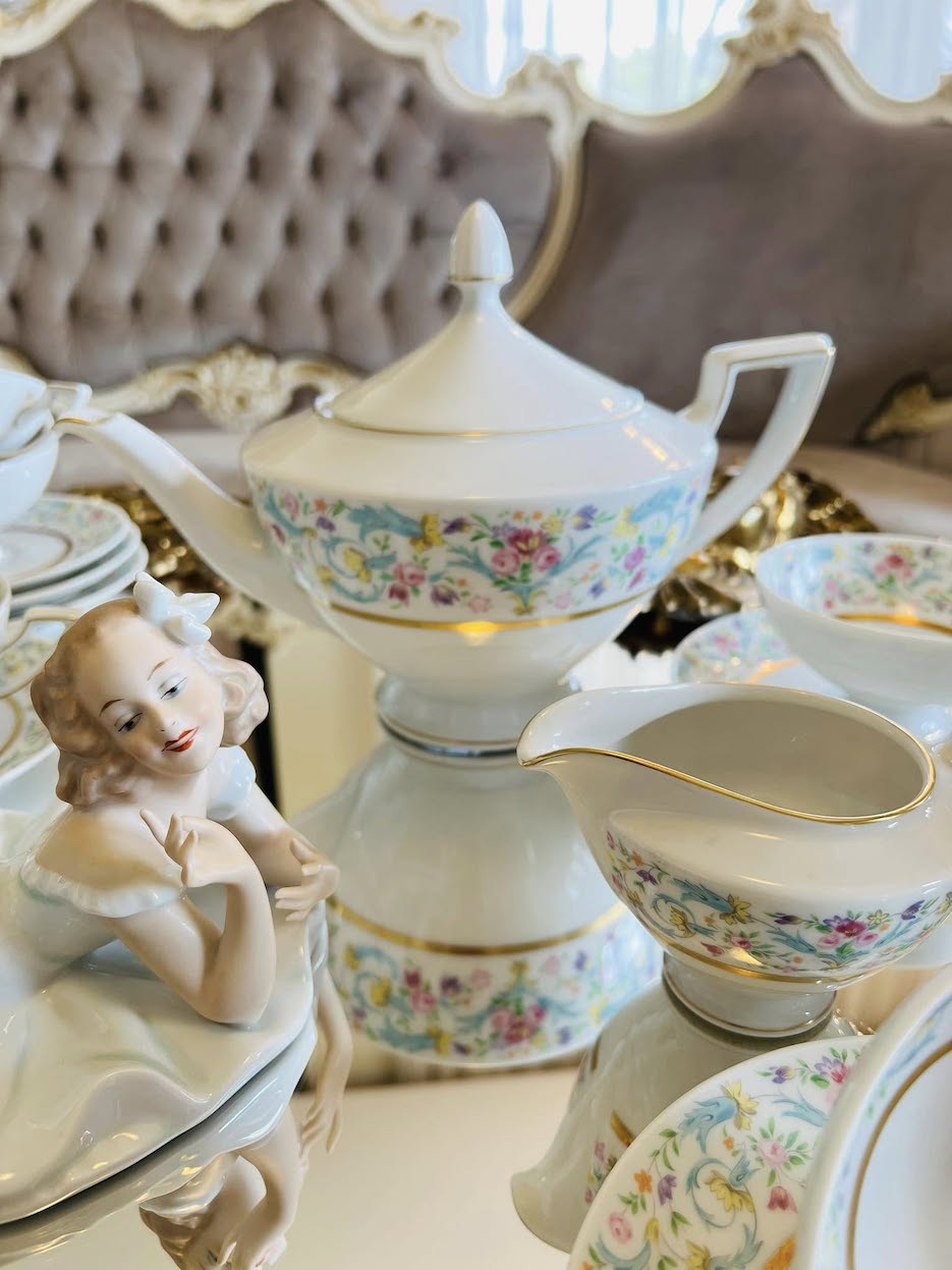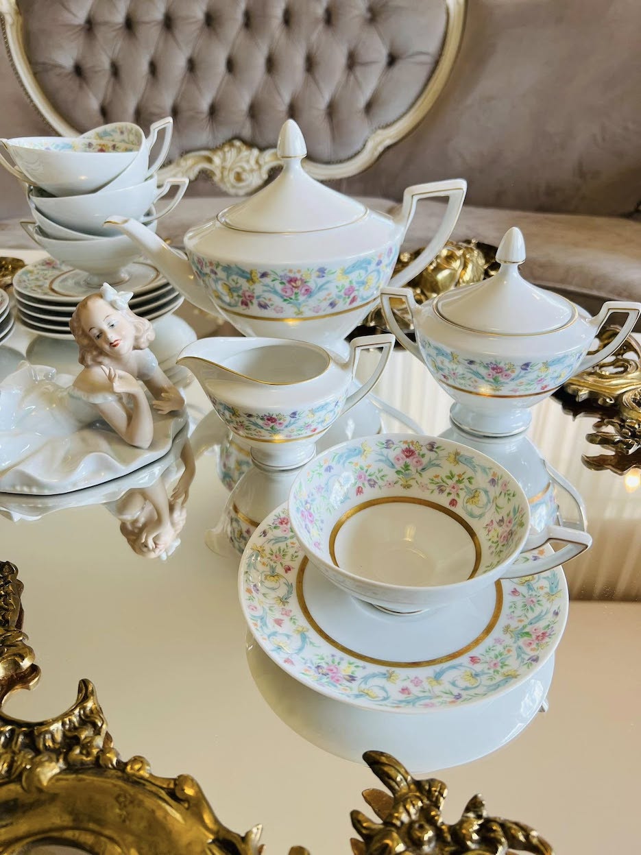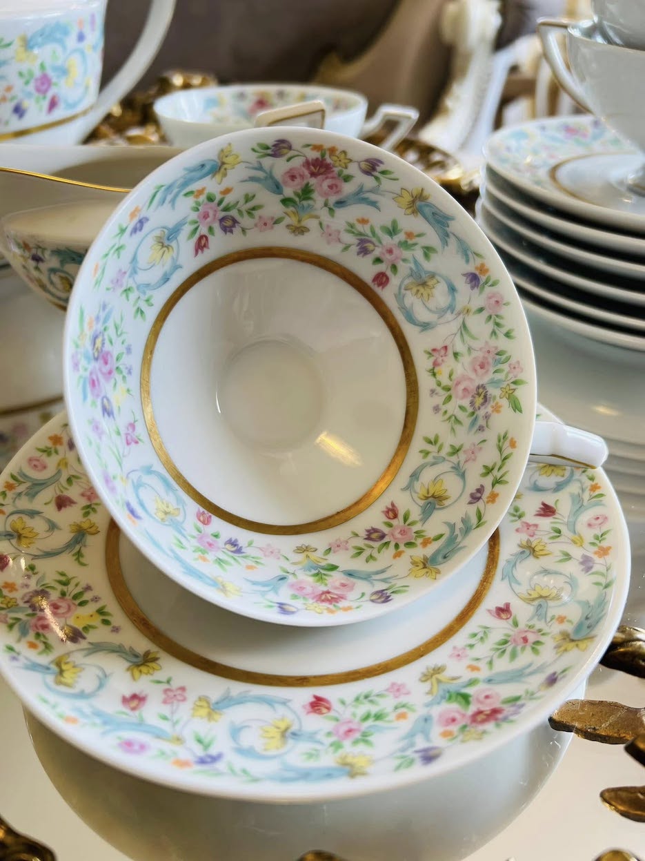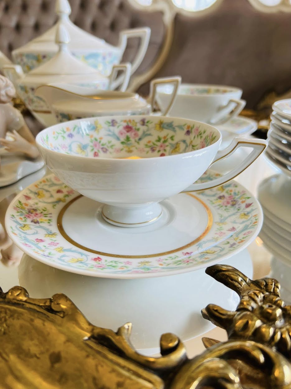 Išskirtinio subtilumo vintažinis porceliano servizas, sukurtas apie 1950–1960 m. garsios Heinrich H&Co., Selb Bavaria manufaktūros. Pagamintas iš balto porceliano, dekoruotas pastelinių gėlių juostomis ir elegantišku aukso apvadu.