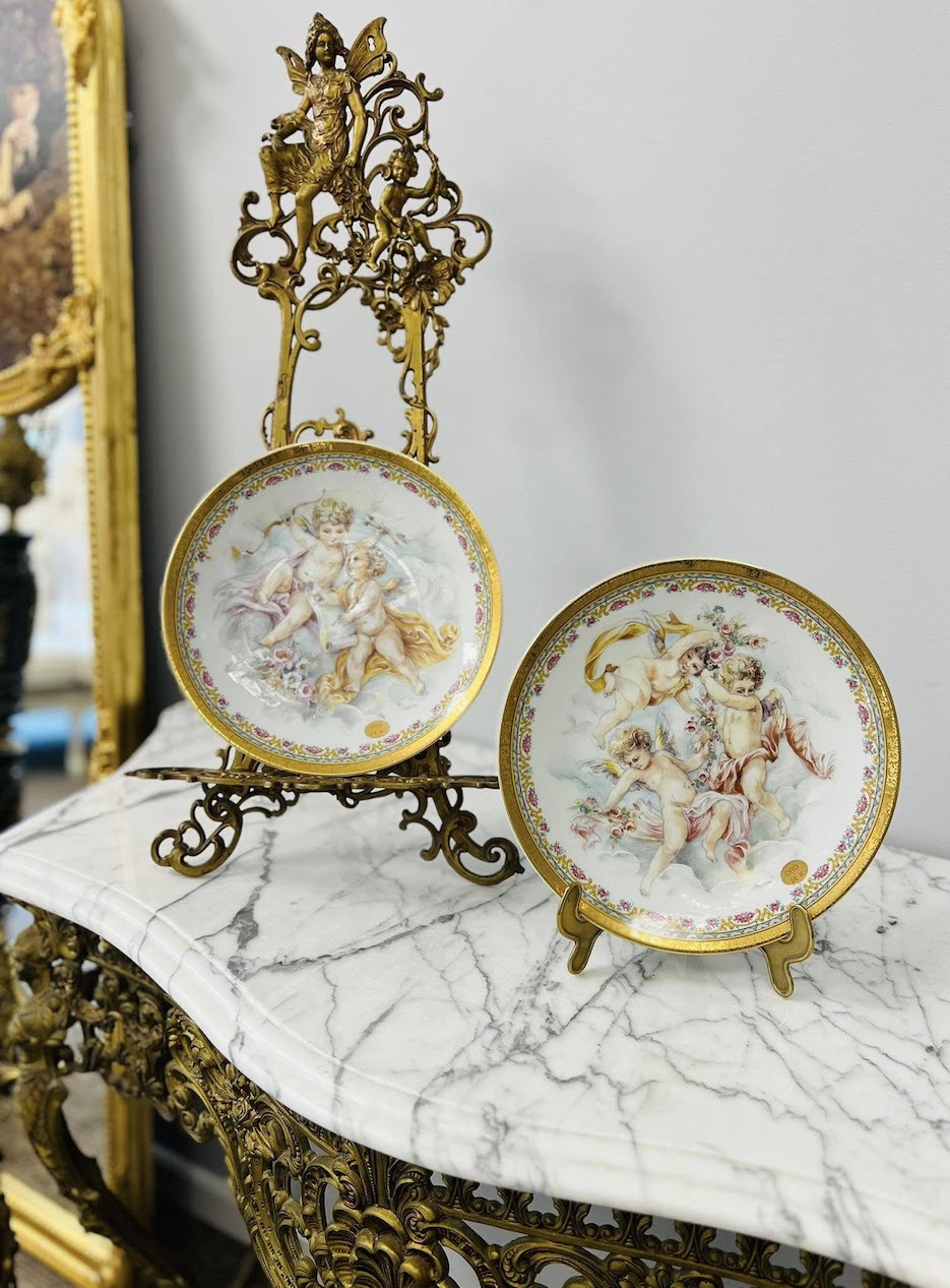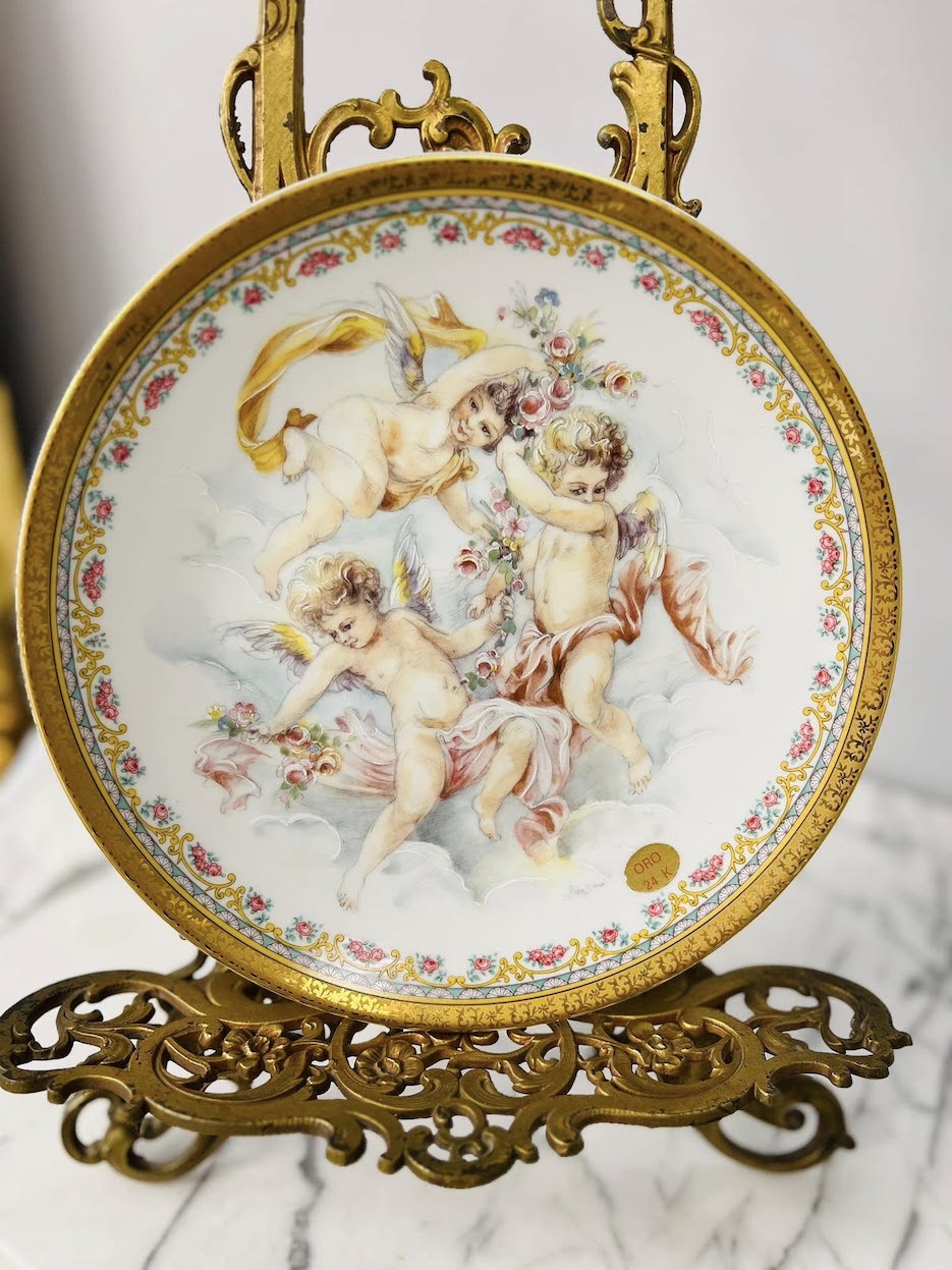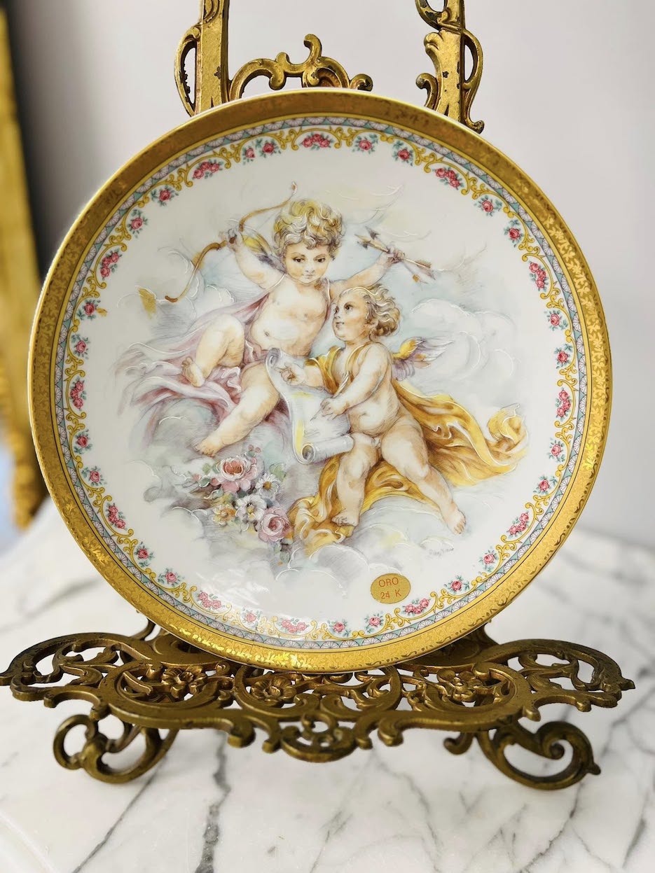 ⚜️ Elegantiškas, romantiško stiliaus porceliano lėkščių duetas, puoštas išraiškingomis angeliukų scenomis debesyse. Švelnių pastelinių spalvų tapyba, aukso apvadas ir puošnus gėlių ornamentas – primena rokoko estetiką ir Limoges dekoro tradiciją. Lėkščių kraštai dekoruoti 24K auksu, pažymėta originaliu lipduku. ⚜️