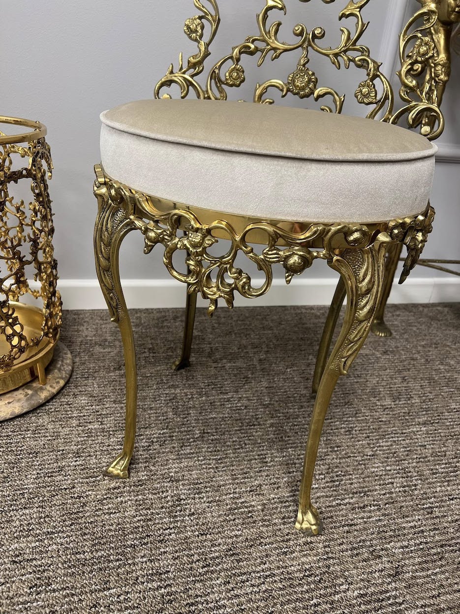 Ilgaamžė, elegantiška bronzinė kėdutė su ažūriniu atlošu – graži, stilinga ir dekoratyvi. Naujai aptraukta minkšta sėdimoji dalis suteikia komforto.