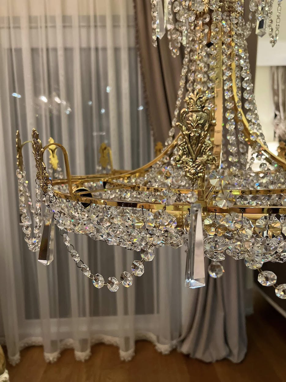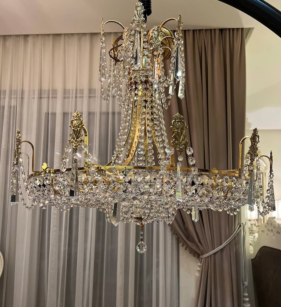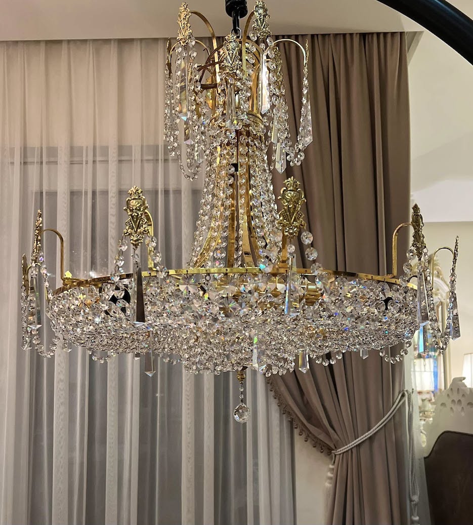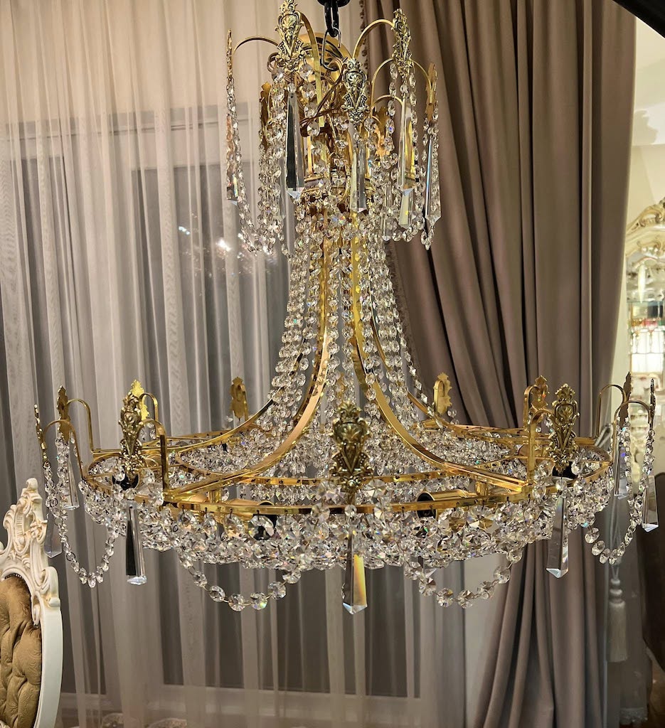 ♦ Tvirta auksuoto metalo konstrukcija, gausiai dekoruotas kristolo girliandomis ir ilgesniais pakabukais.