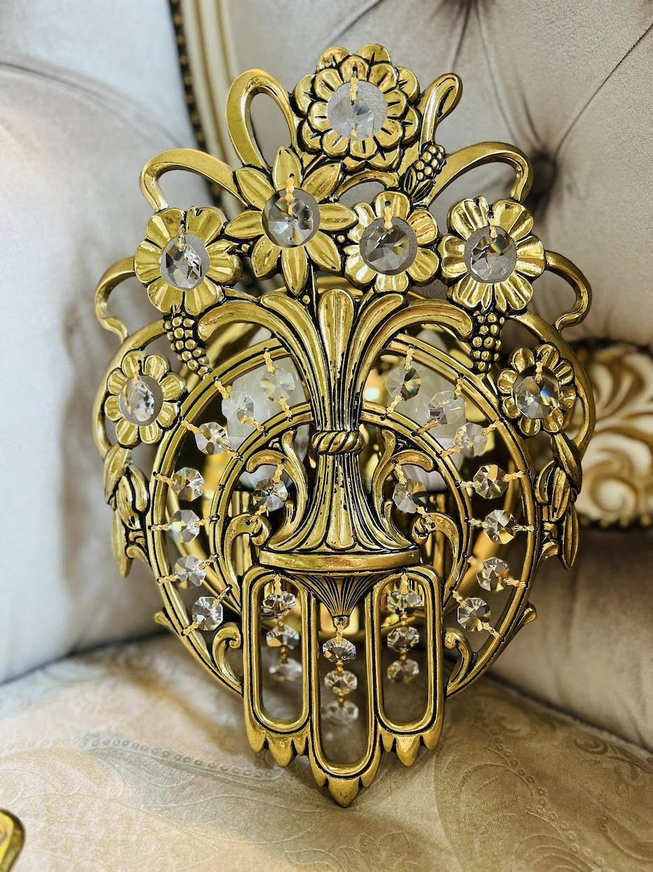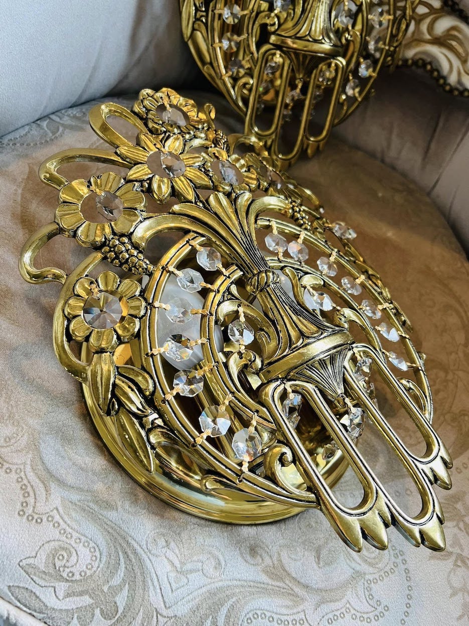 Išskirtinio dizaino pora vintažinių sieninių šviestuvų, pagamintų iš bronzos ir dekoruoti krištolu.