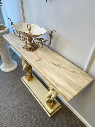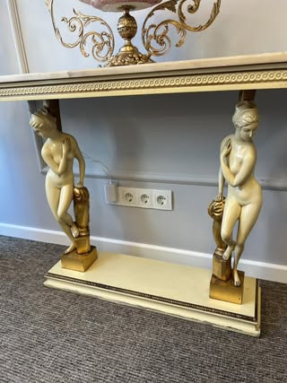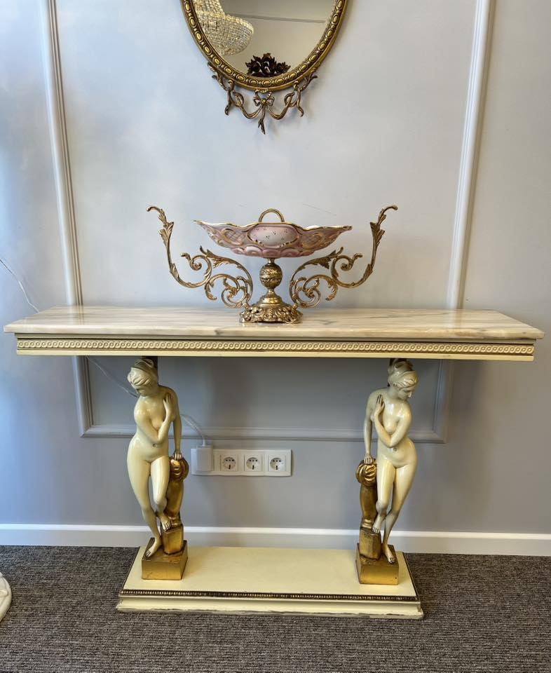 Išskirtinio dizaino vintažinė medinė konsolė – sieninis staliukas, dekoruotas elegantiškomis moterų skulptūromis.