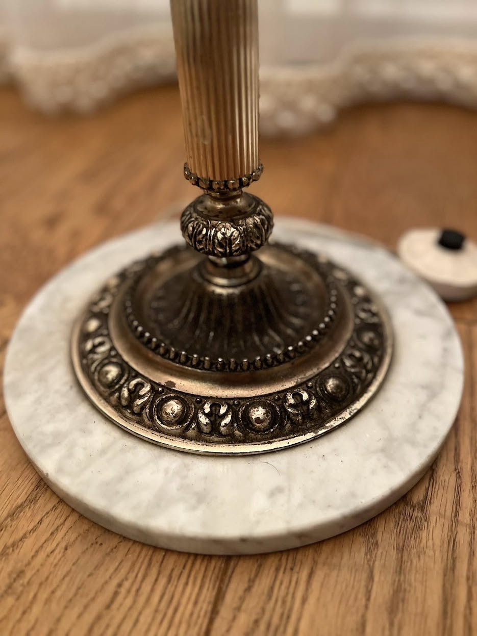 Originalus vintažinis krištolo toršeras. Tvirtas, masyvus stovas su marmurine baze ir bronzos detalėmis. Gražus klasikinis siluetas, karūnos formos viršus ir krištolo grandinėlės.