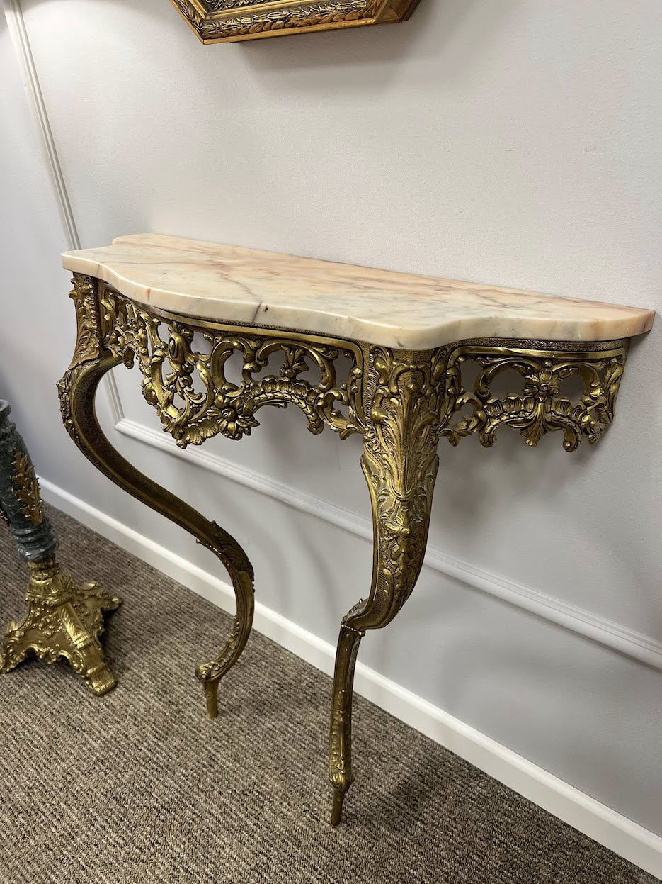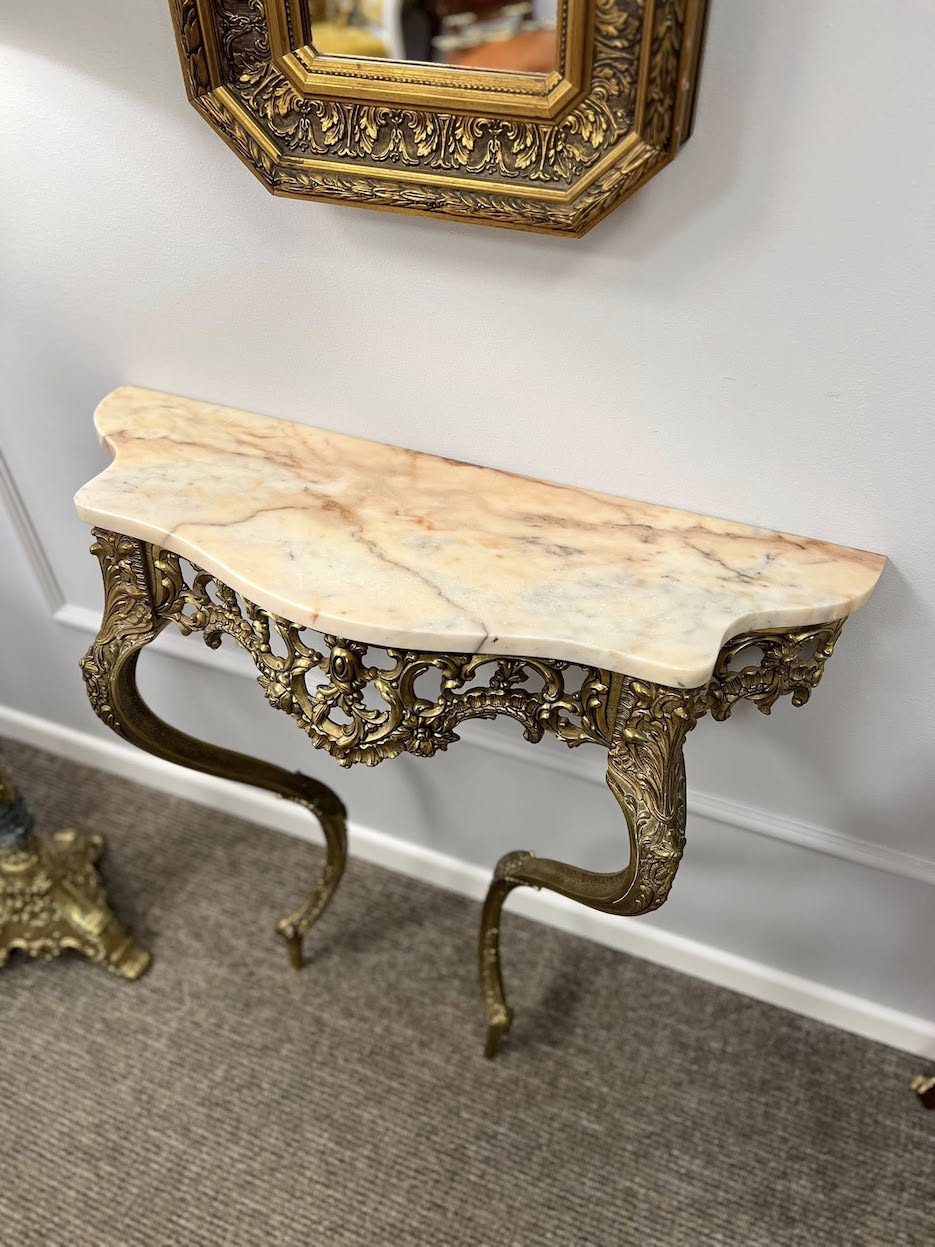 Naudota vintažinė bronzinė konsolė su marmuro stalviršiu „Rosabella Console”Prieinamumas: Liko 1