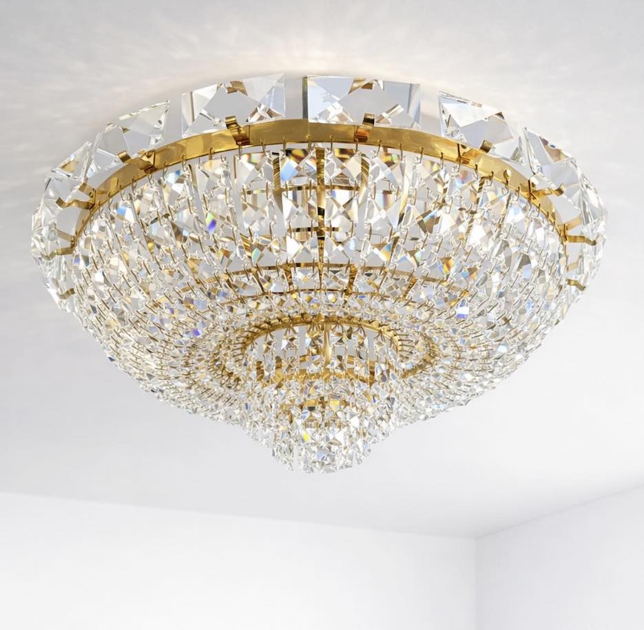 Naudotas kalnų krištolo šviestuvas – spindintis ir dekoratyvus akcentas stilingam namų interjerui.