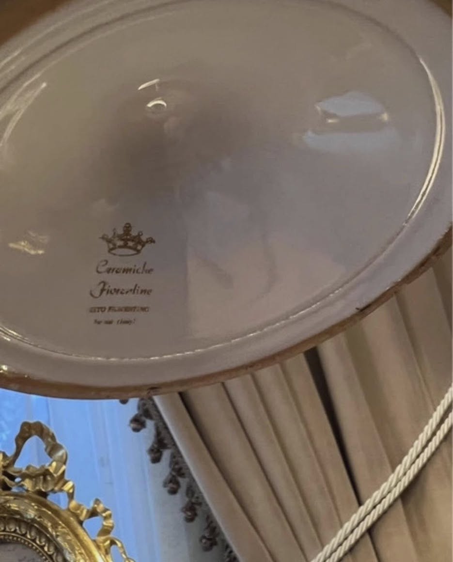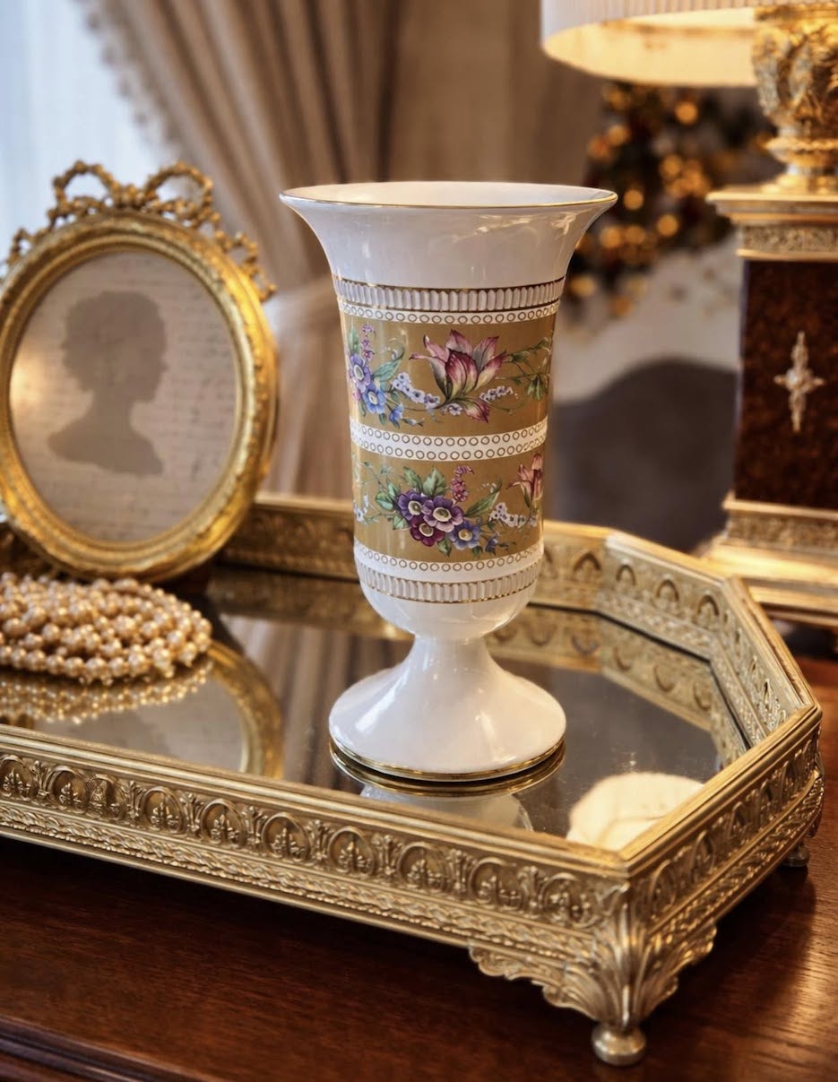 Klasikinė, subtiliai dekoruota itališka porcelianinė vaza su švelniais floristiniais motyvais ir aukso spalvos akcentais.