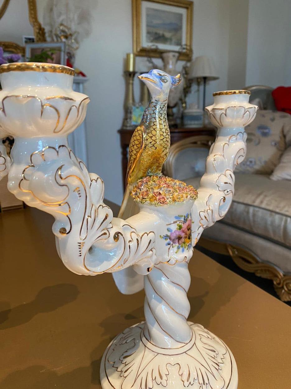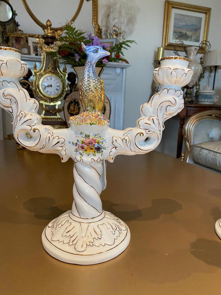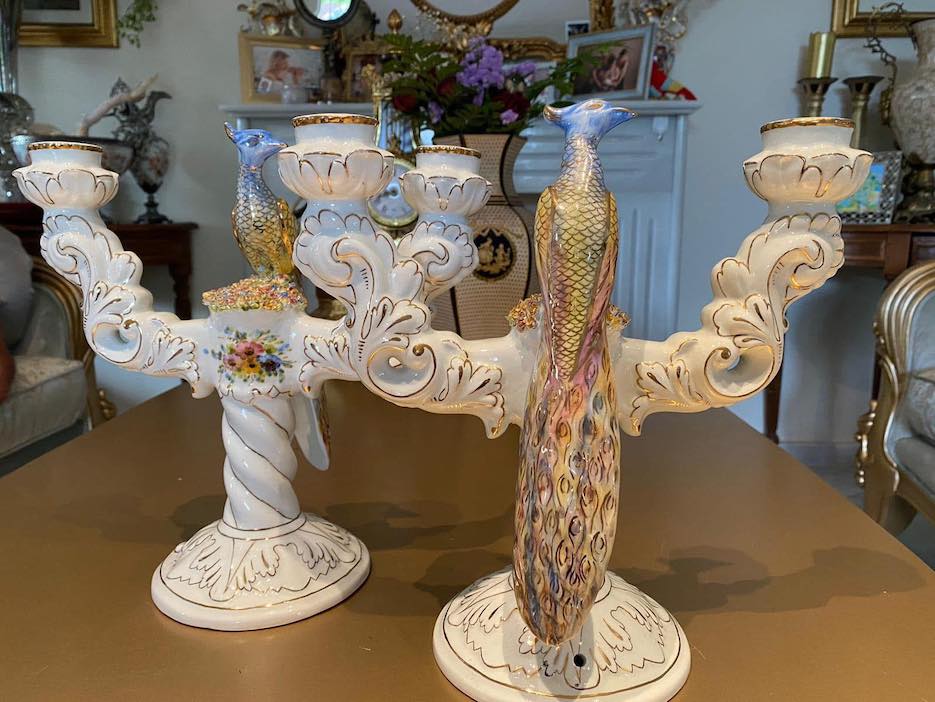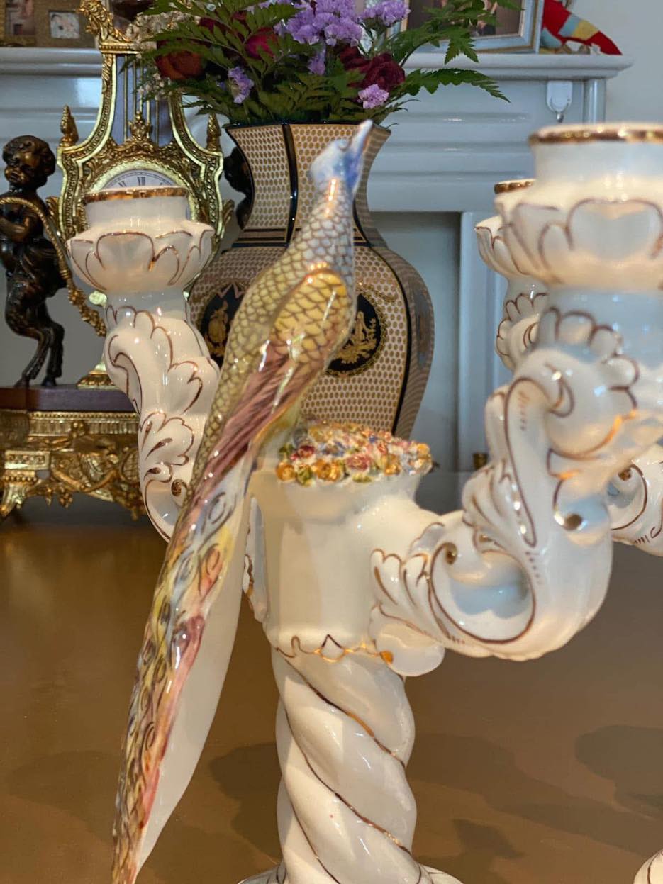 dvi išskirtinio grožio porcelianinės žvakidės, dekoruotos elegantiškomis povų figūromis. Kiekviena žvakidė subtiliai dekoruota aukso spalvos akcentais ir gėlių motyvais.