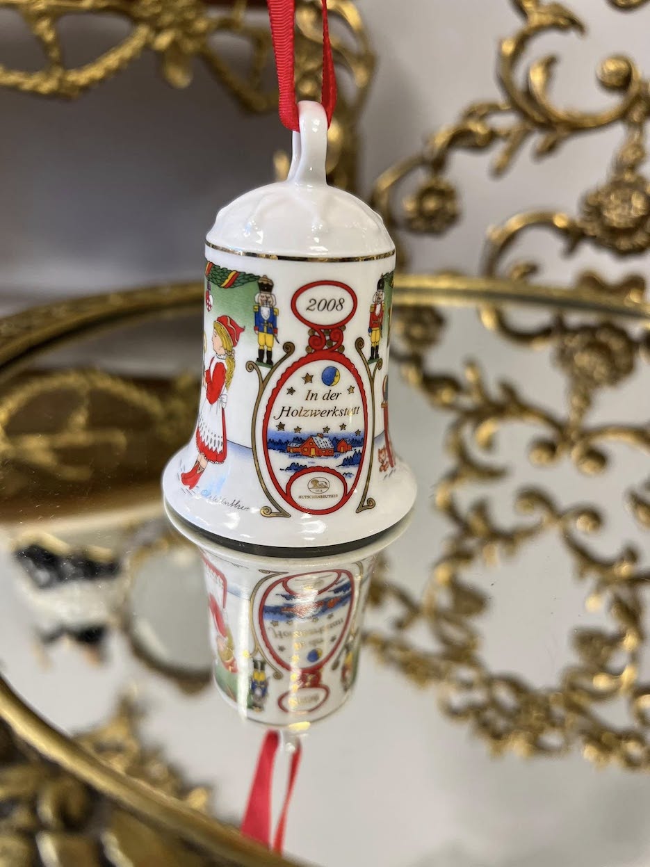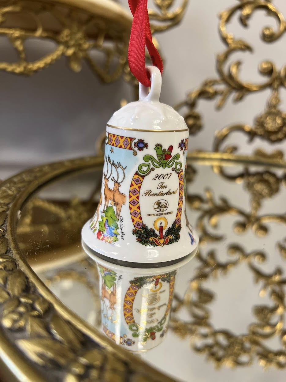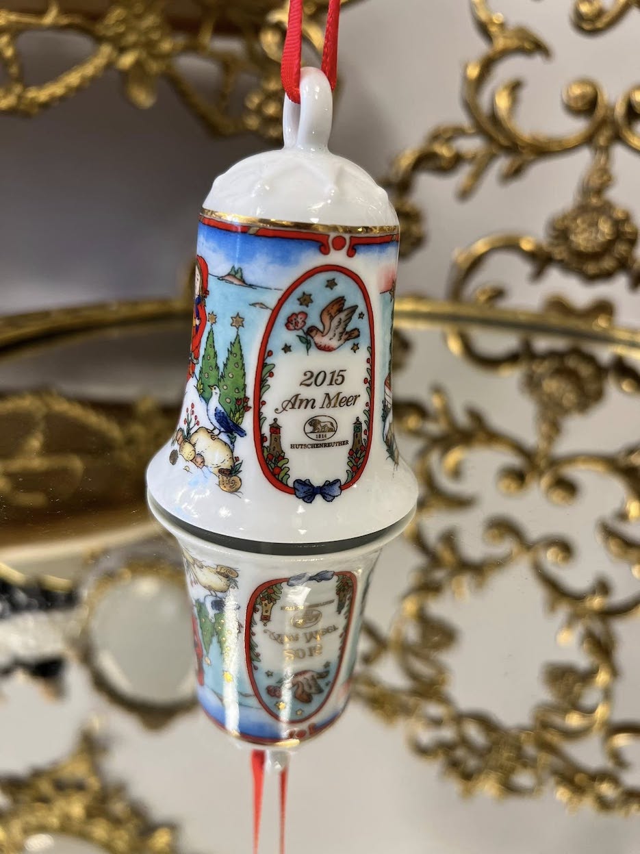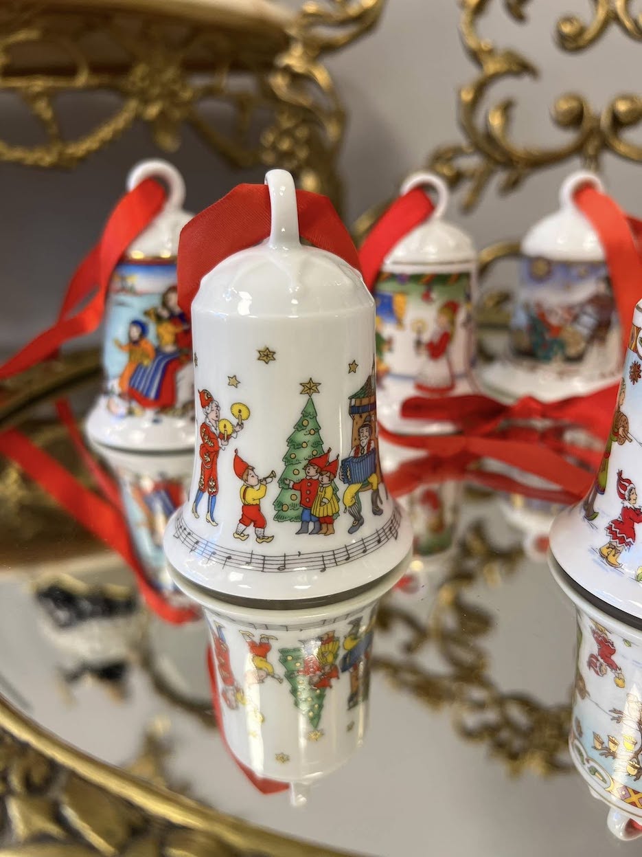 ♦   Originalūs Hutschenreuther porceliano varpeliai – kiekvienas iš skirtingų metų kolekcijų, dekoruotas ranka pieštos estetikos kalėdinėmis scenomis.