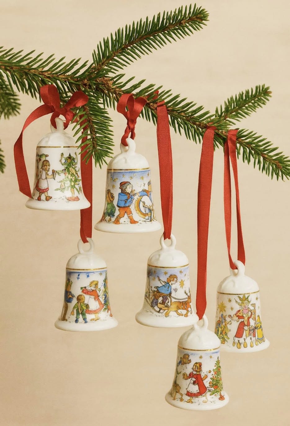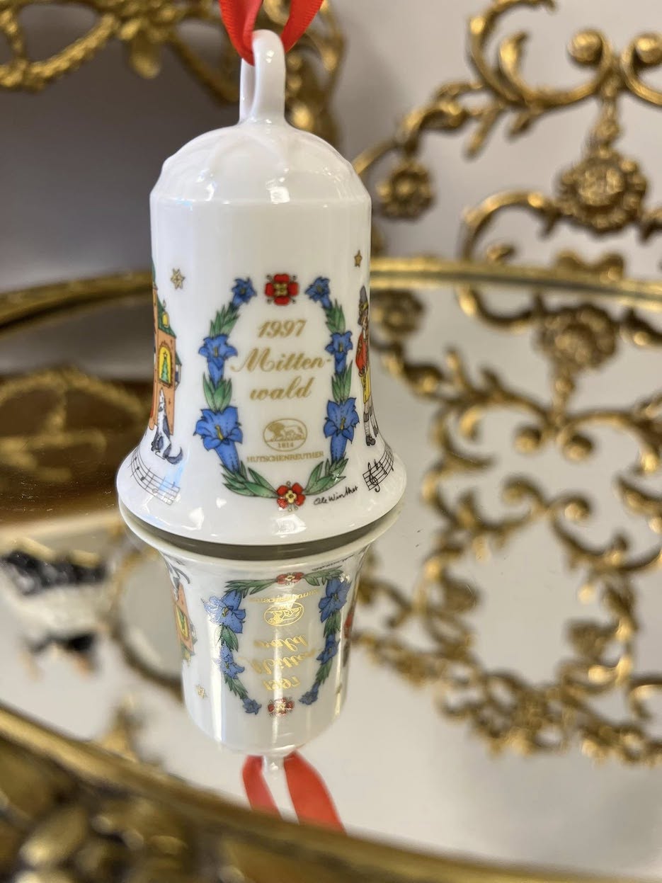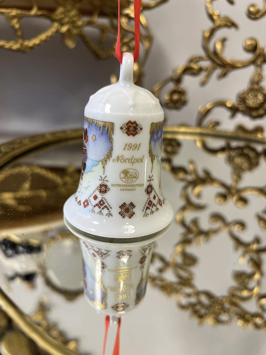 ♦   Originalūs Hutschenreuther porceliano varpeliai – kiekvienas iš skirtingų metų kolekcijų, dekoruotas ranka pieštos estetikos kalėdinėmis scenomis.