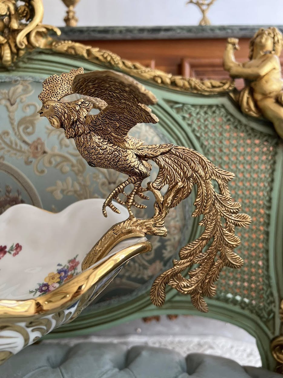 - Balto porceliano dubuo dekoruotas rankomis, sodriomis gėlių aplikacijomis, mėlynais intarpais ir auksavimu. Šonus puošia dvi didelės ažūrinės bronzos figūros – paukščiai.
