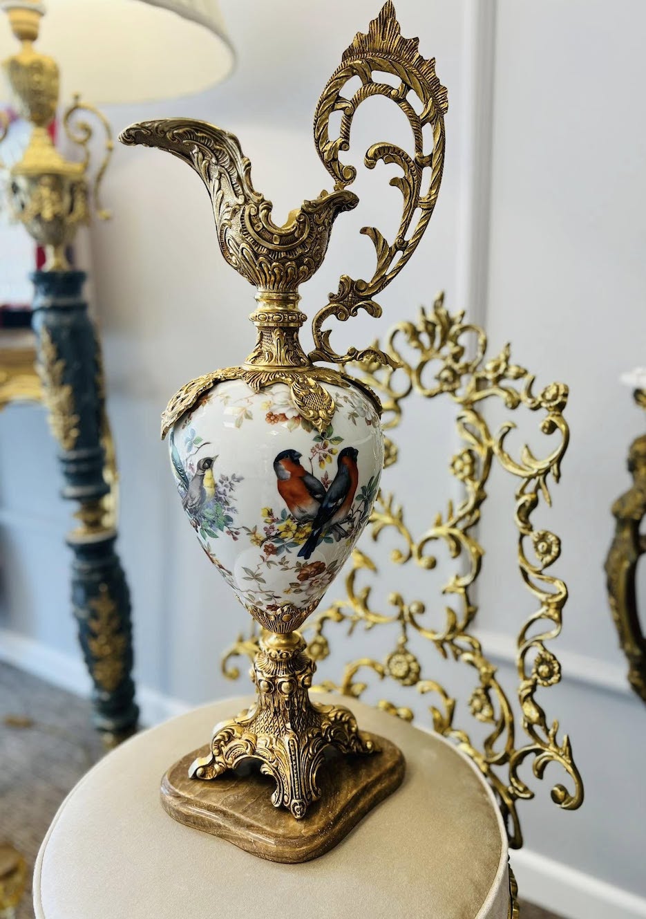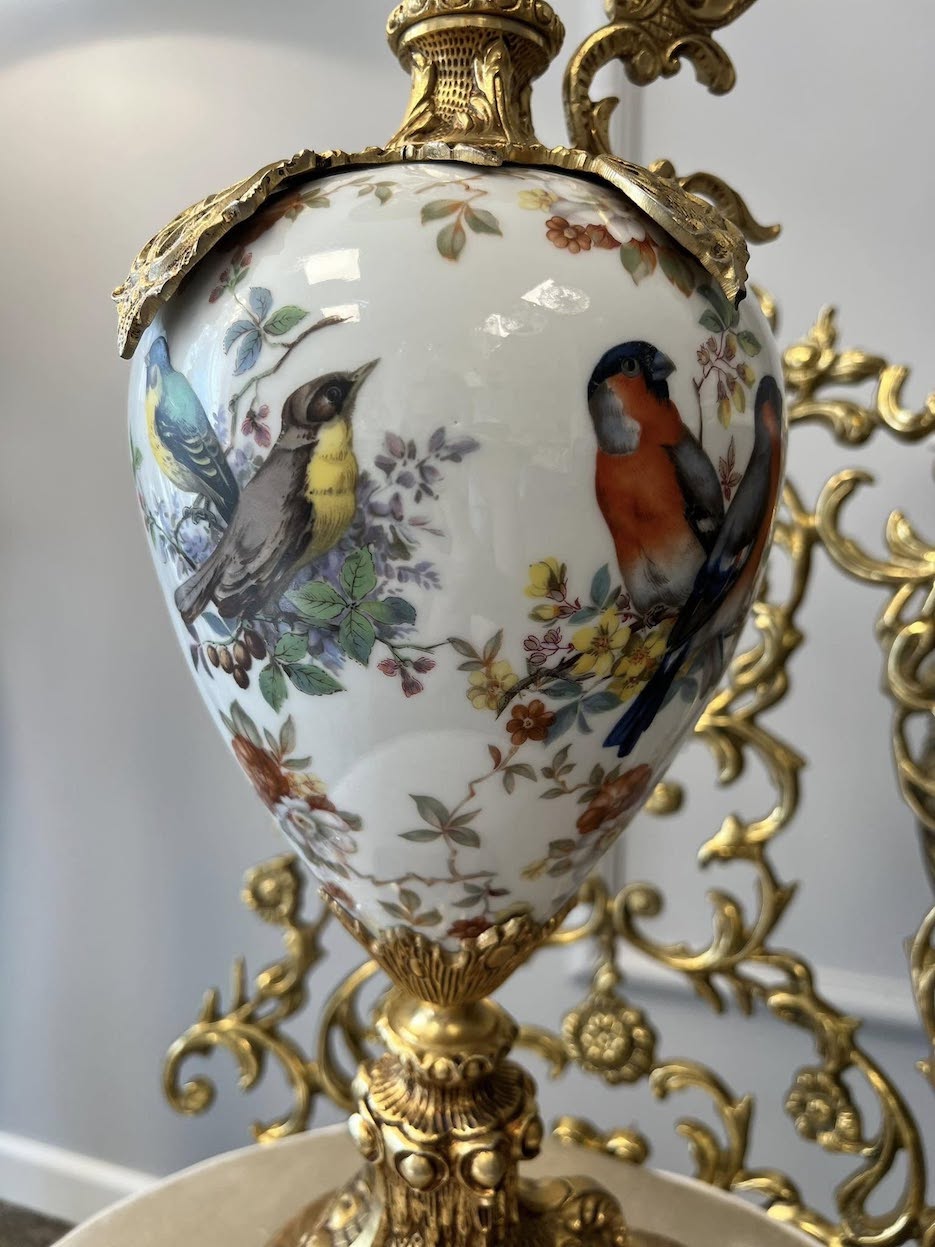 Prabangi išraiškingo dizaino vaza suformuota ant masyvios ornamentuotos bronzinės kojelės, puošta ažūrine rankena ir dekoratyvinėmis detalėmis. Kūginis indas pagamintas iš porceliano, kruopščiai dekoruotas rankų darbo gėlių motyvais ir paukščiais.