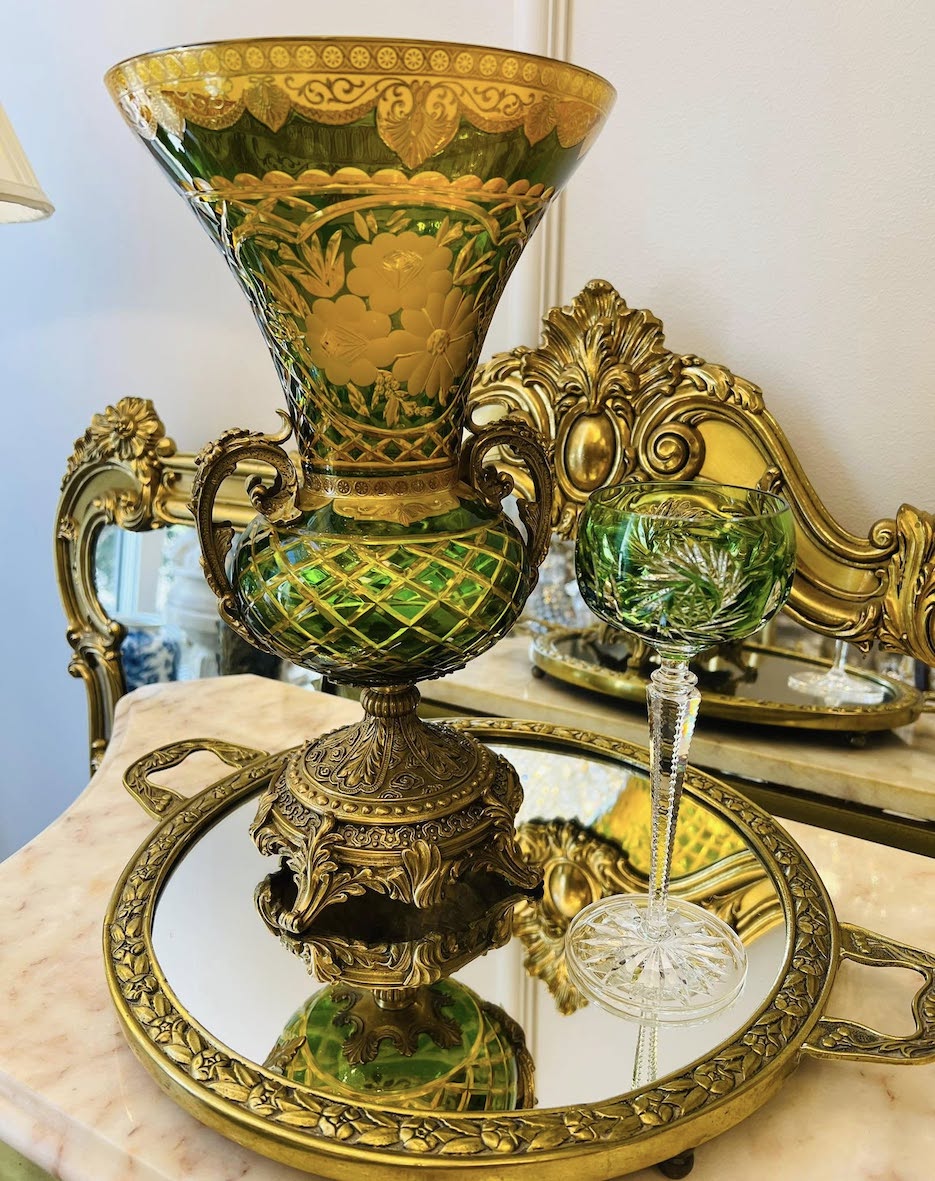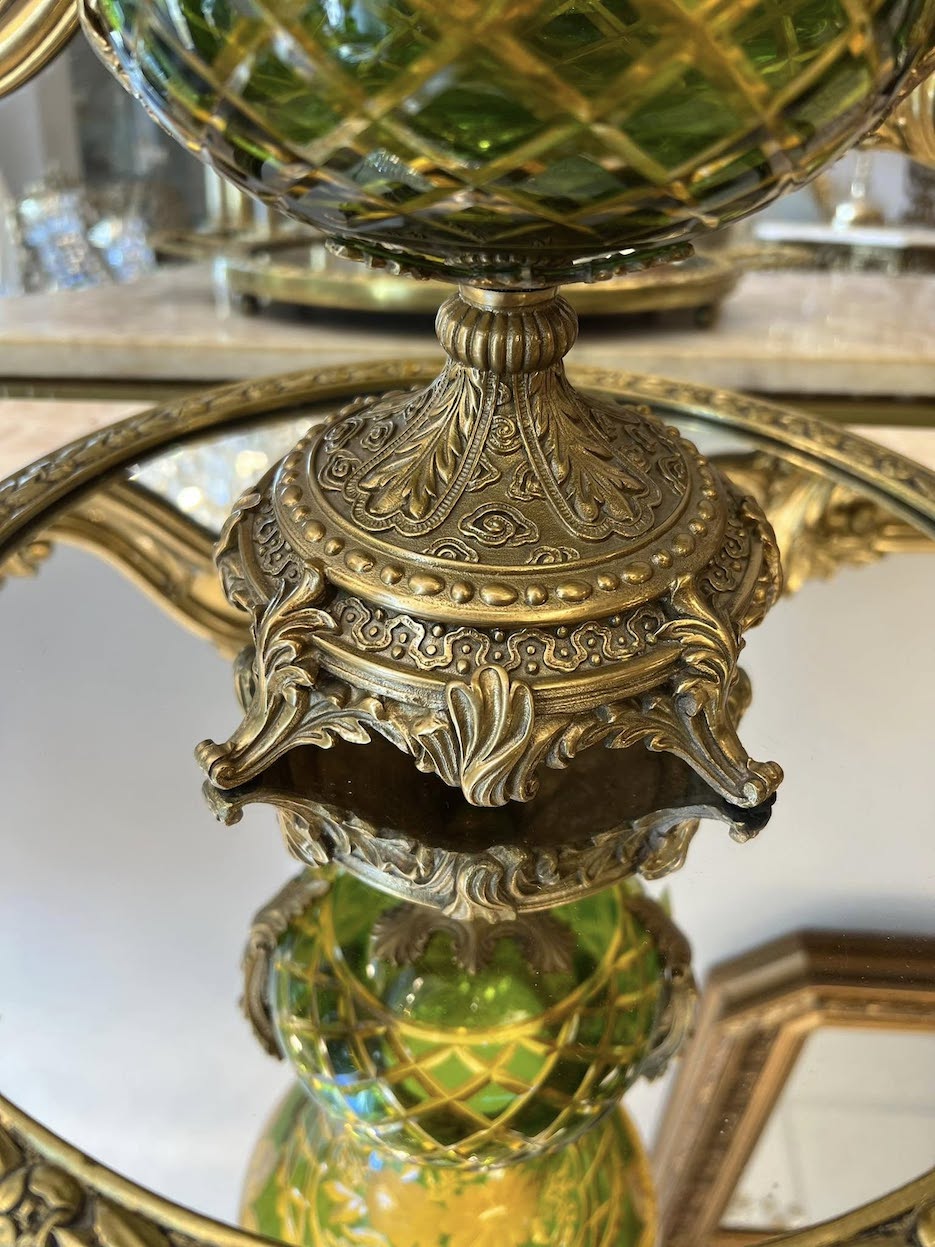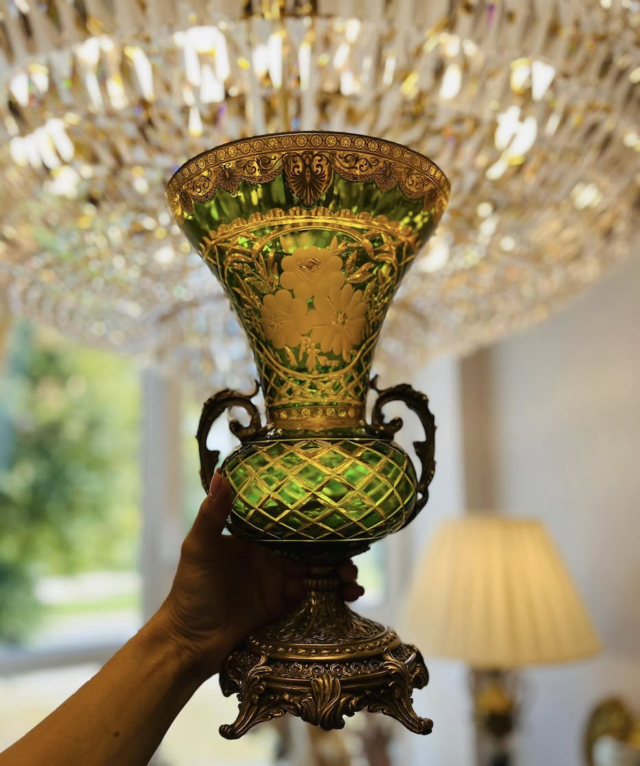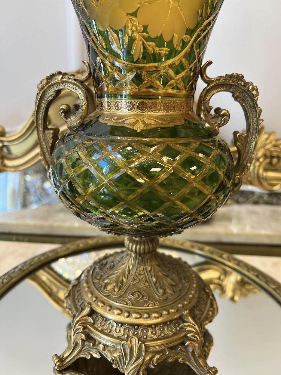 Labai puošni, Bohemios stilistikos, krištolo vaza, kuriai neįmanoma likti abejingam. Amforos tipo siluetas su masyvia bronzine kojelė ir rankenėlėmis primena baroko bei rokoko vazų interpretacijas.