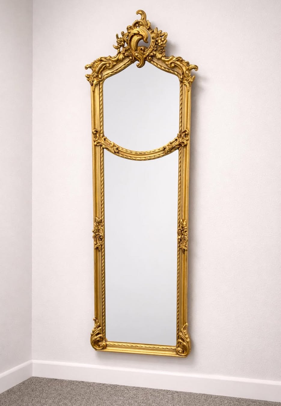 Dailus aukso spalvos rėmo veidrodis, galima statyti atrėmus, galima pakabinti.