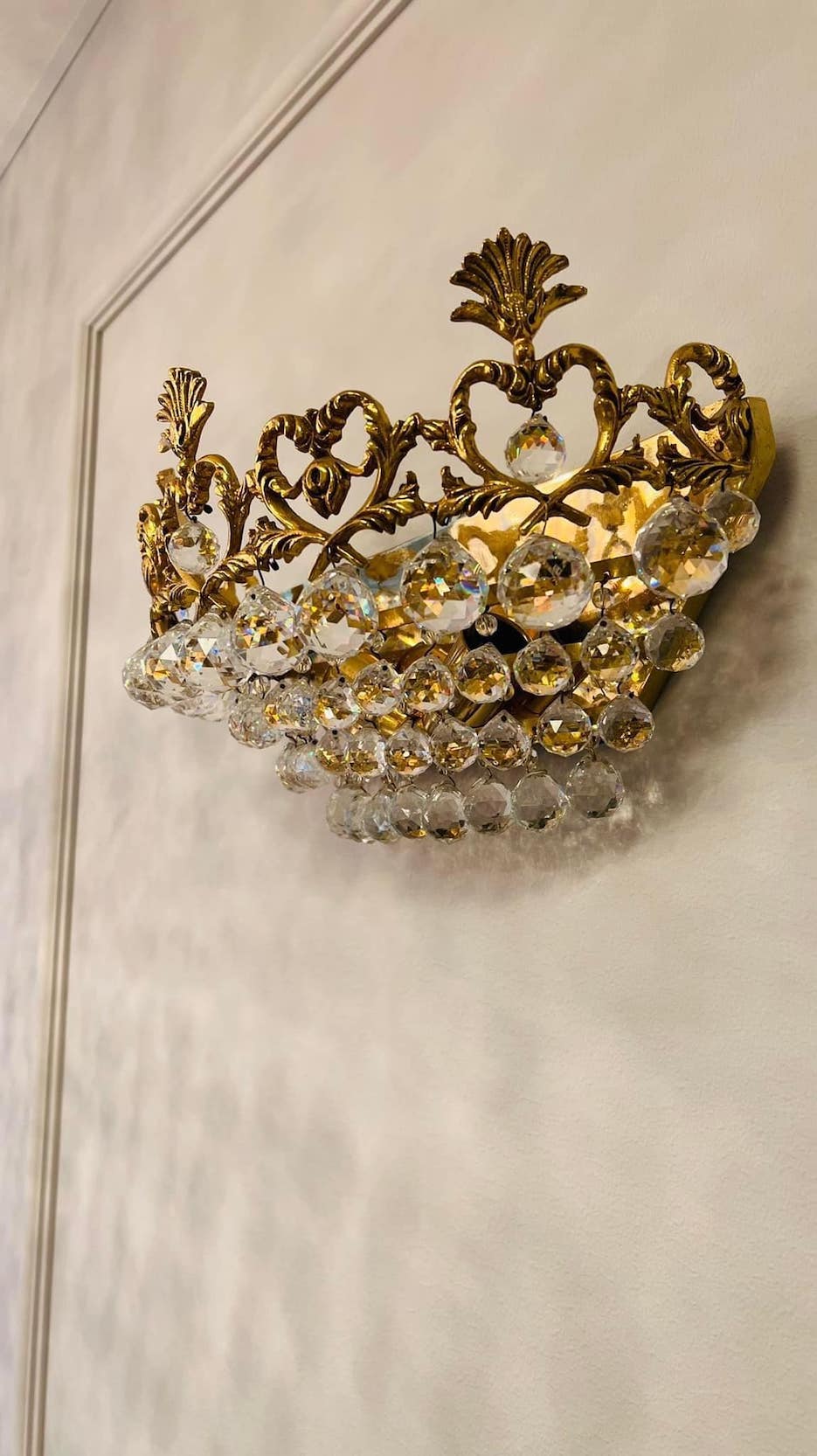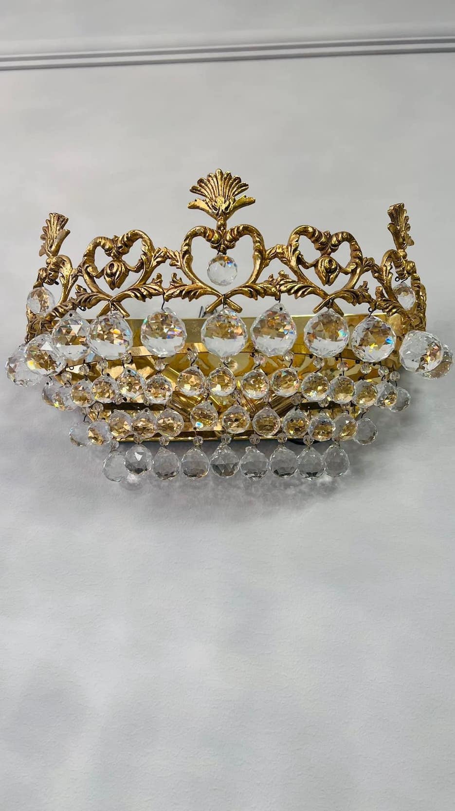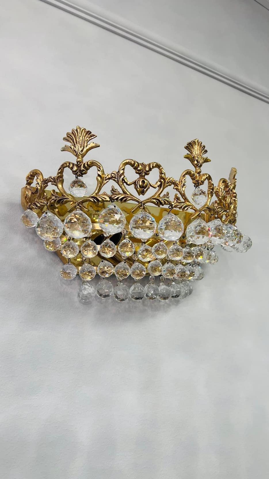 Išskirtinis, karūnos formos sieninis šviestuvas, pagamintas iš bronzos ir dekoruotas krištolo pakabukais. Dekoratyvi, banguota viršutinė dalis su augaliniais motyvais suteikia jam aristokratiškos prabangos įspūdį.