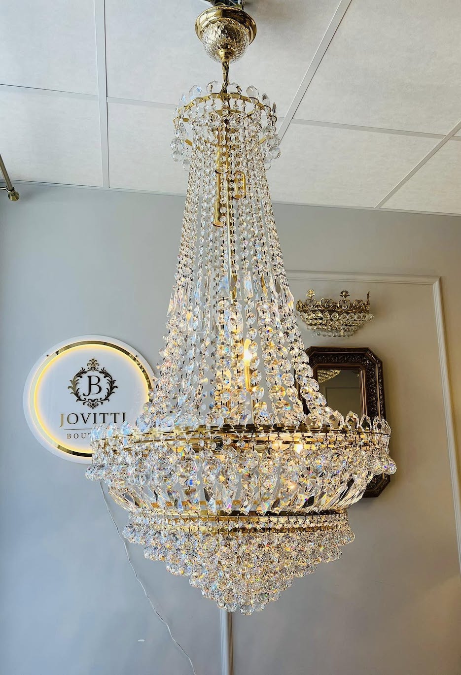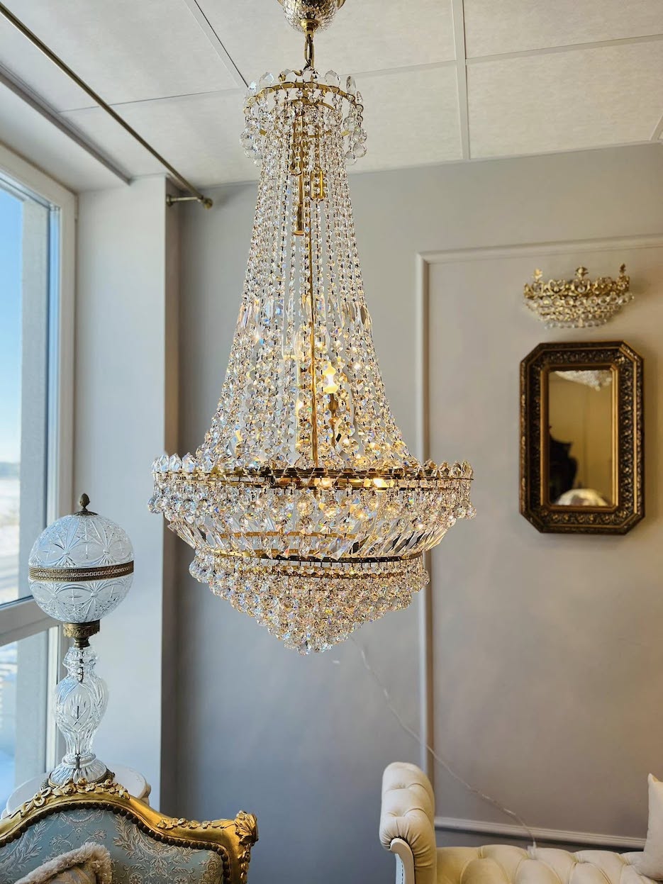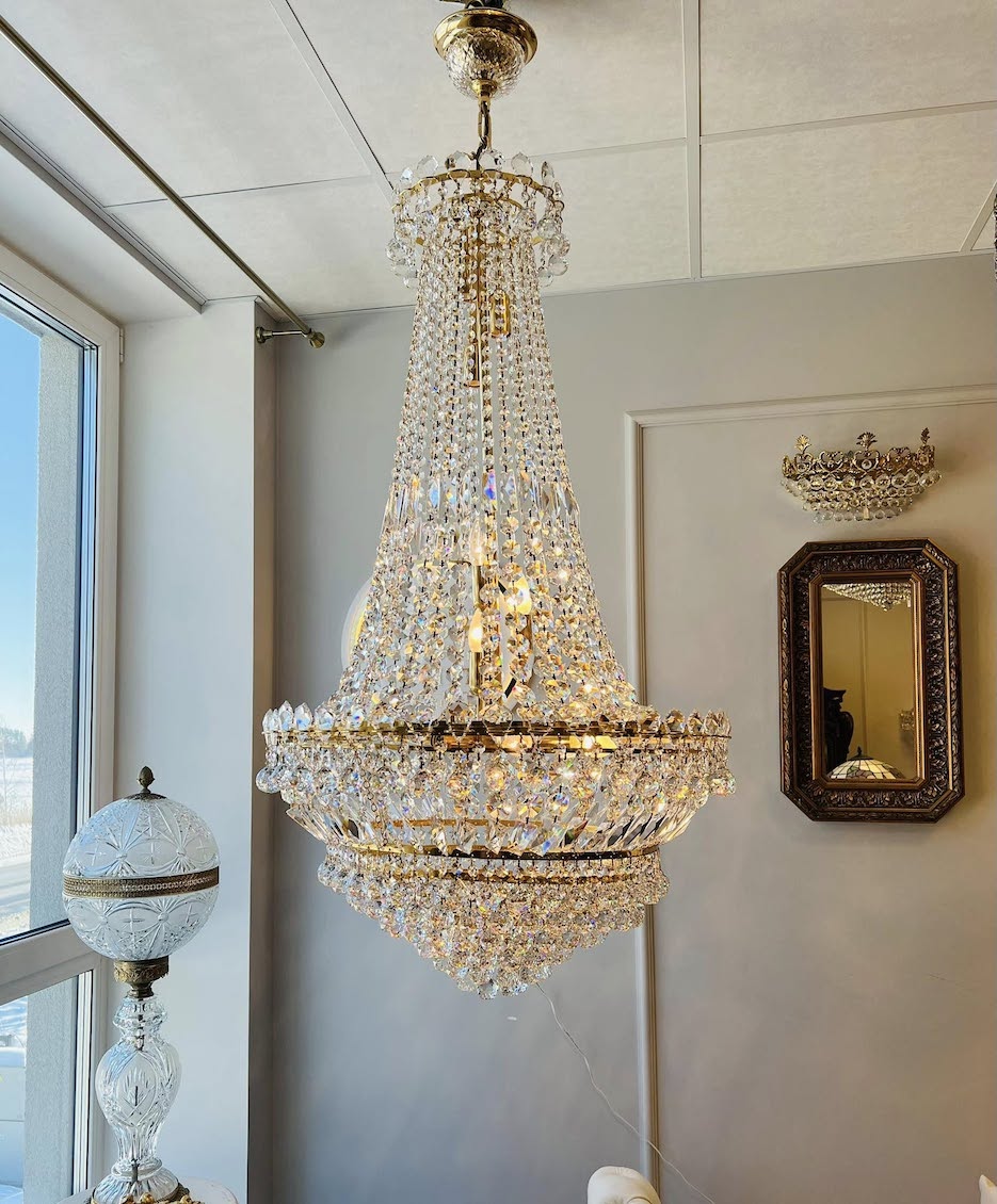 Naudotas, įspūdingo dydžio kalnų krištolo sietynas aukštoms luboms.