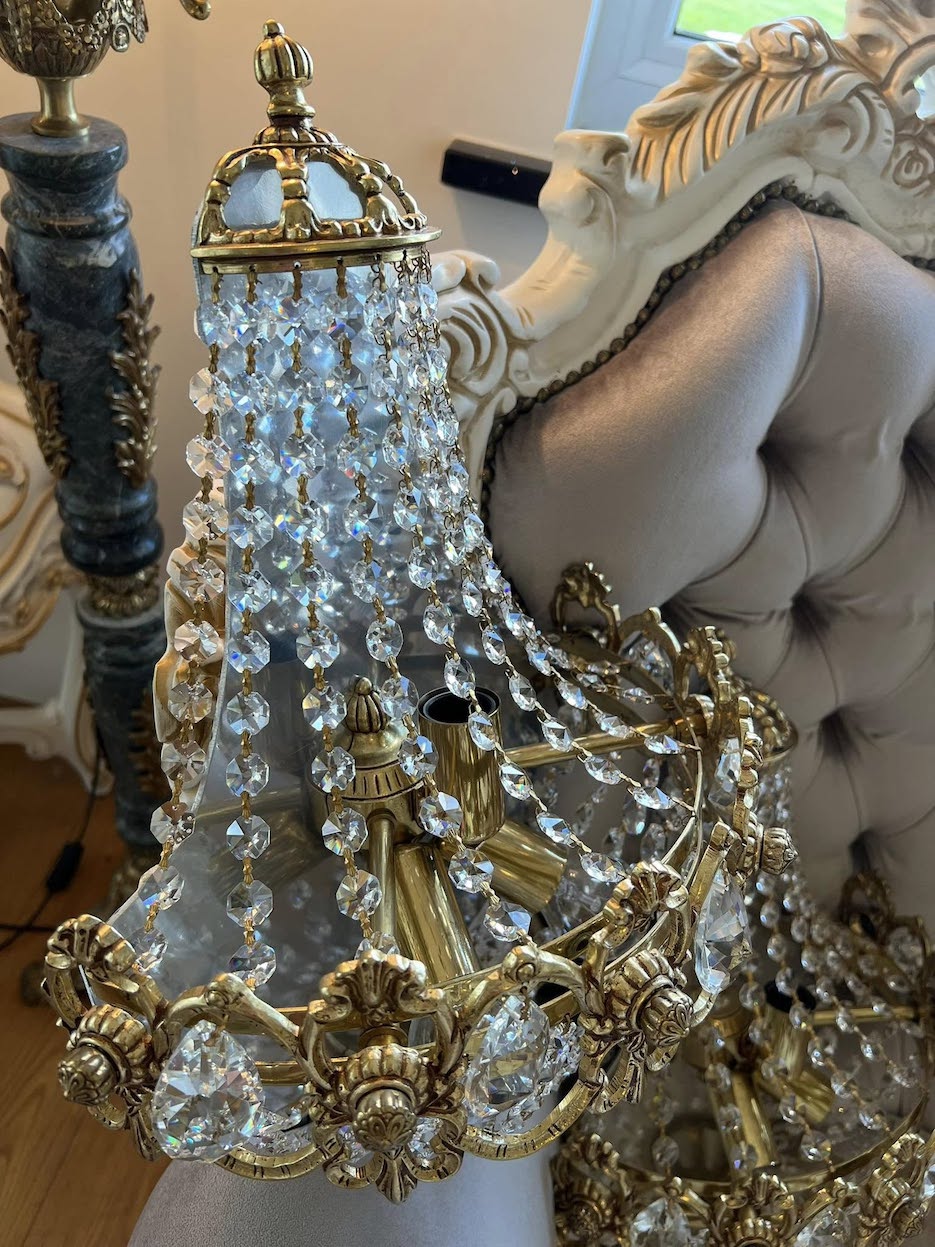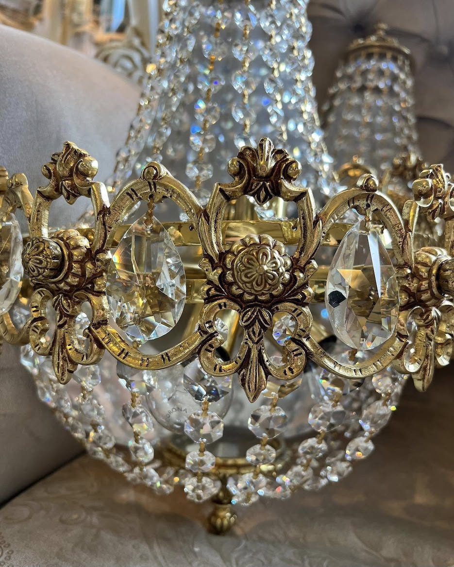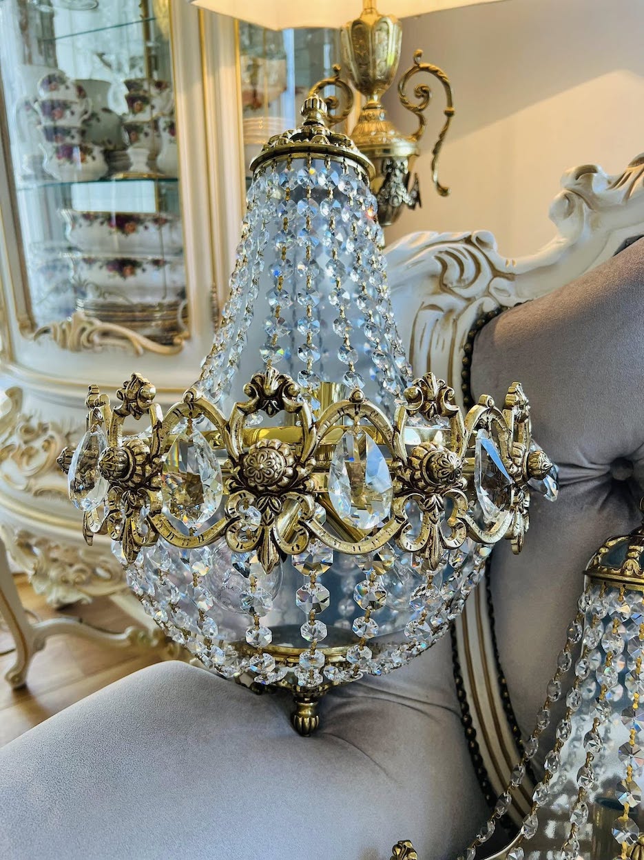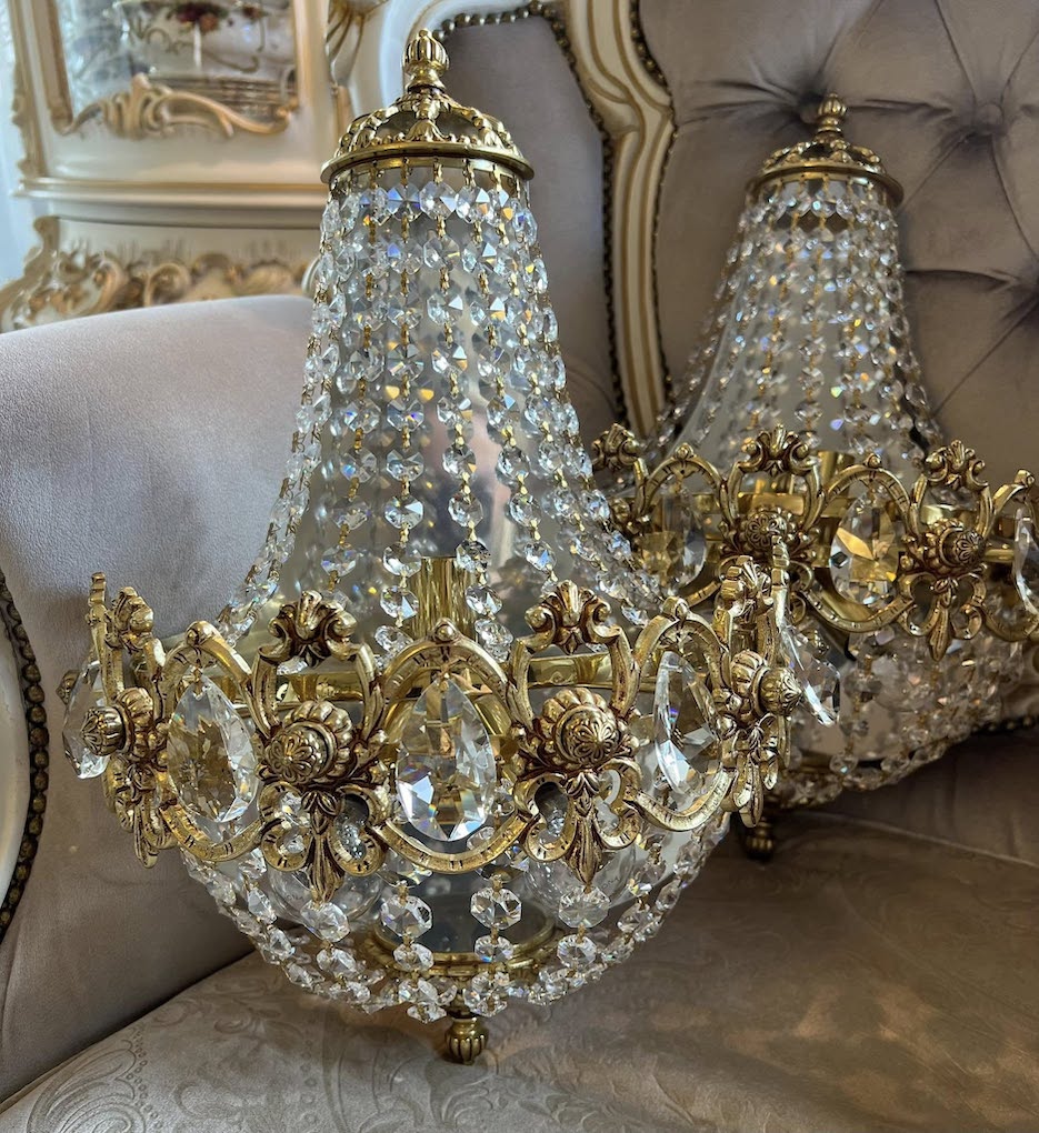 Nuostabūs, išskirtinai prabangūs sieniniai šviestuvai, spinduliuojantys klasikinę prabangą ir karališką rafinuotumą. Gausiai dekoruoti aukštos kokybės krištolo pakabukais. Tvirtas rėmas iš masyvios bronzos dekoruotas reljefinėmis gėlių rozetėmis, o viršūnė vainikuota karūną primenančiu elementu – subtilus akcentas, pabrėžiantis išskirtinį dizainą.
