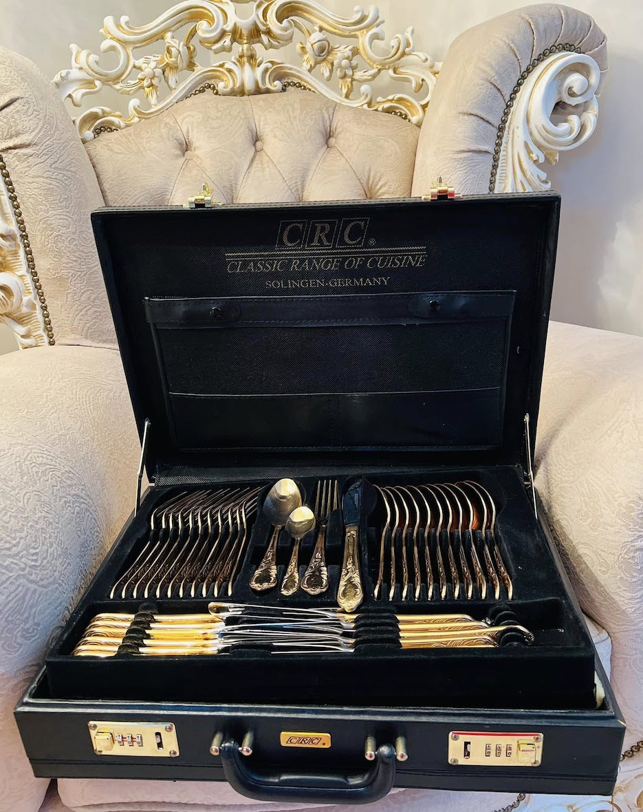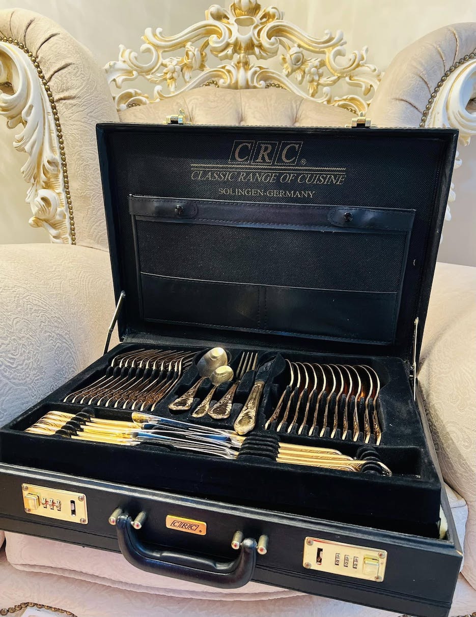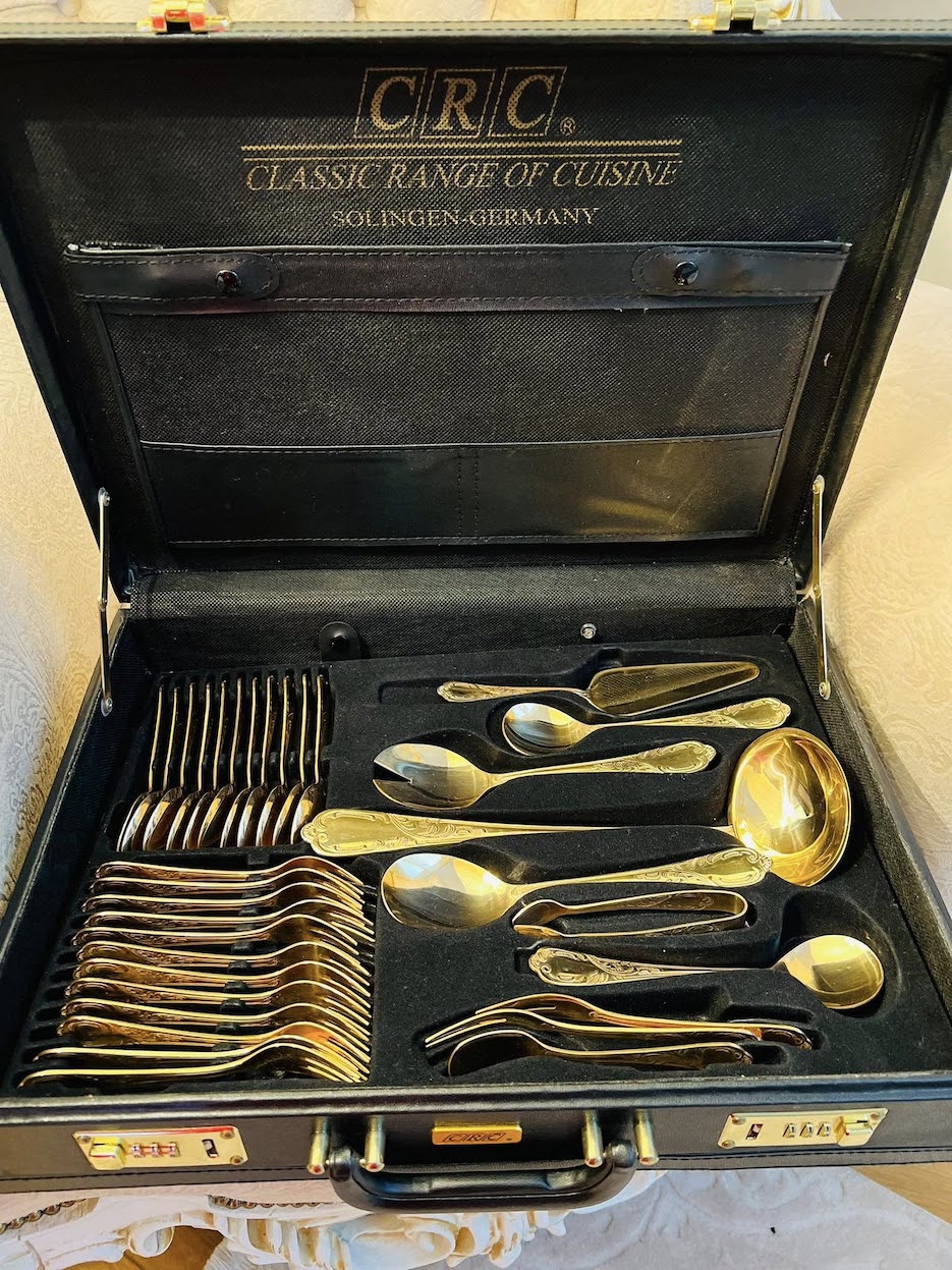 Prabangus Solingen Germany auksuotas stalo įrankių komplektas, skirtas 12-ai asmenų, 70 dalių.
