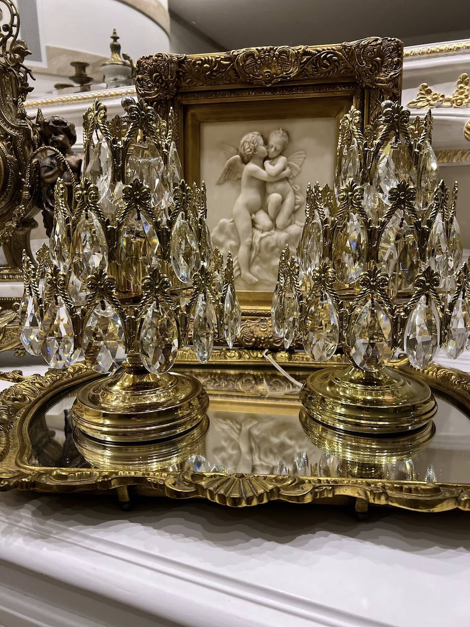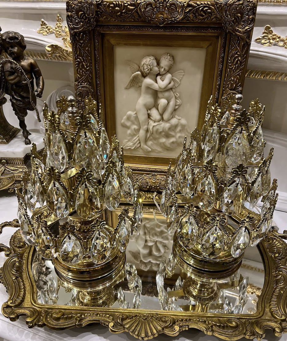 ♦ Prabangūs, su daug bronzos ir spindinčio krištolo girliandomis
