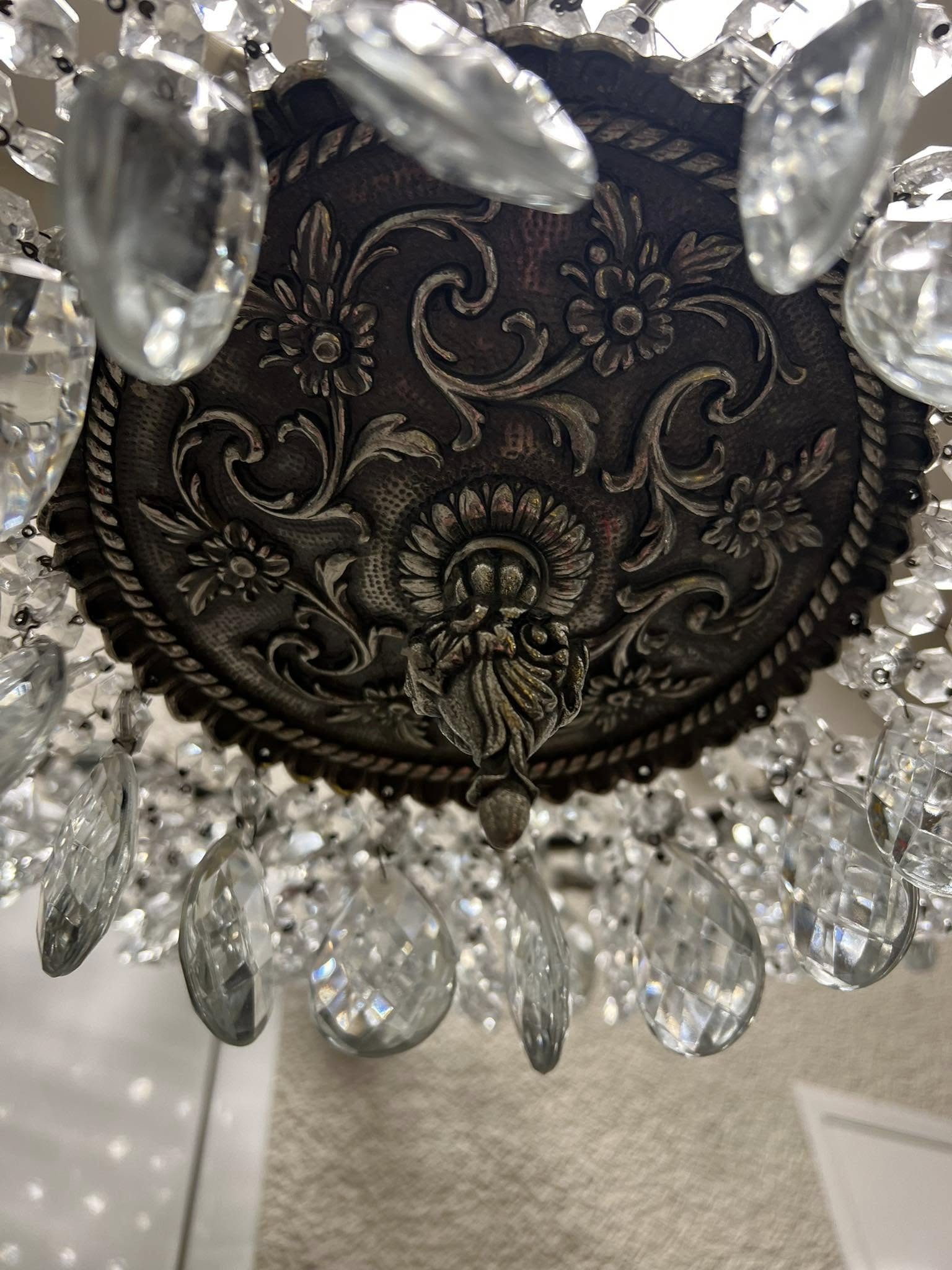 Ažūrinis, naudotas, sidabro spalvos šviestuvo rėmas, dekoruotas subtiliais gėlių raštais, puošnus vintažinis šviestuvas.
