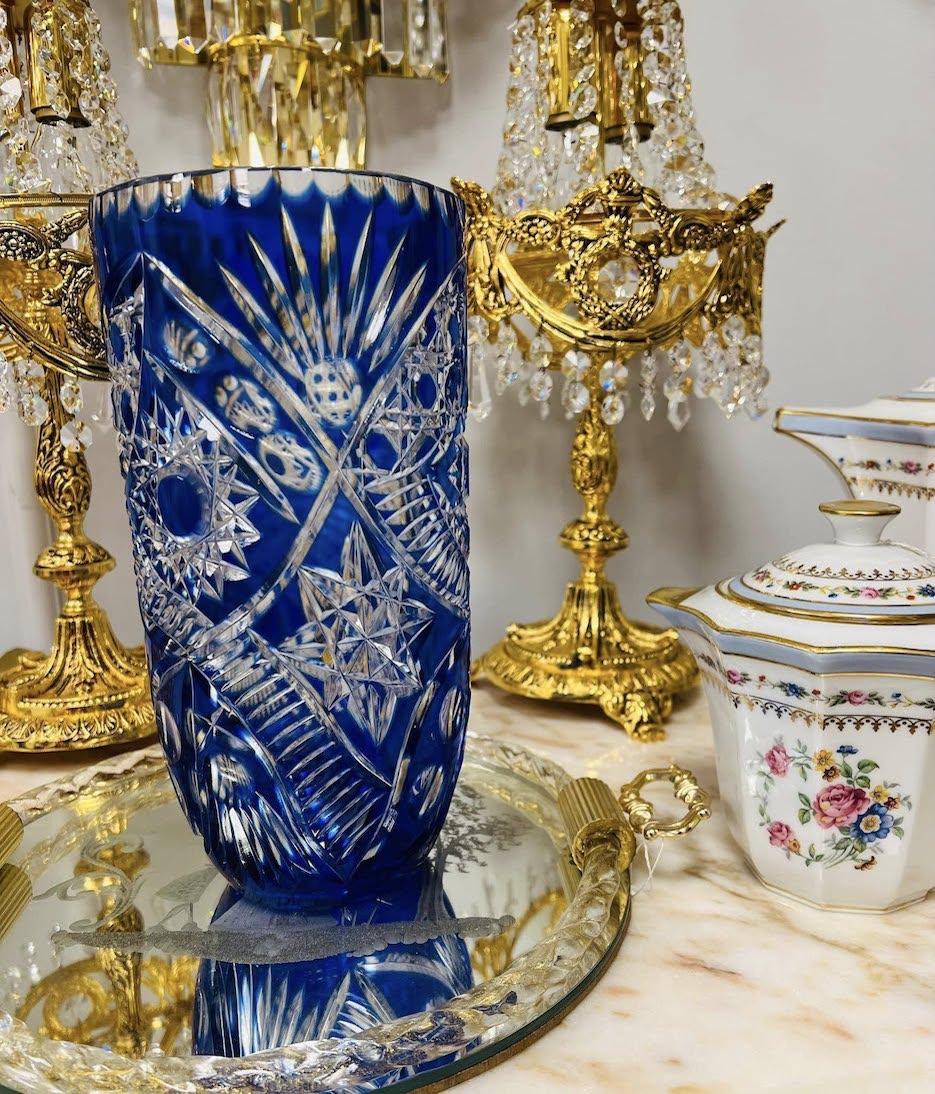 Puošni, vintažinė, sodriai mėlyno krištolo vaza gėlėms.