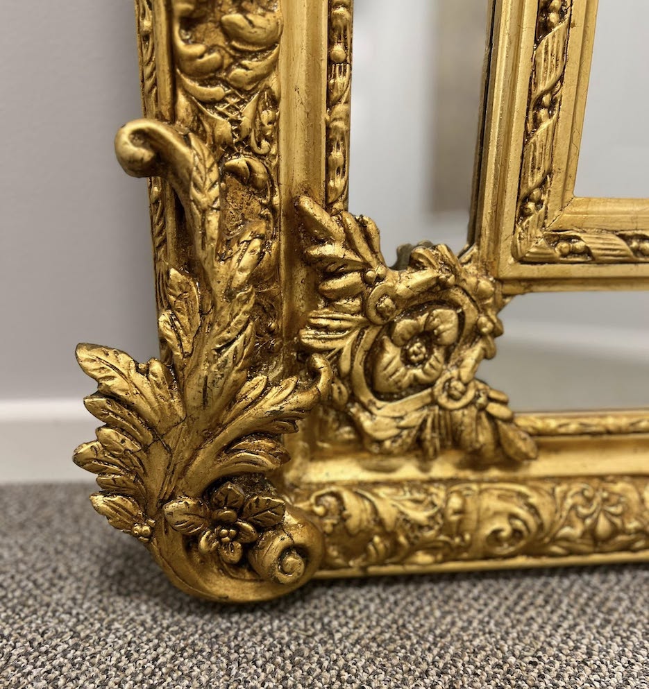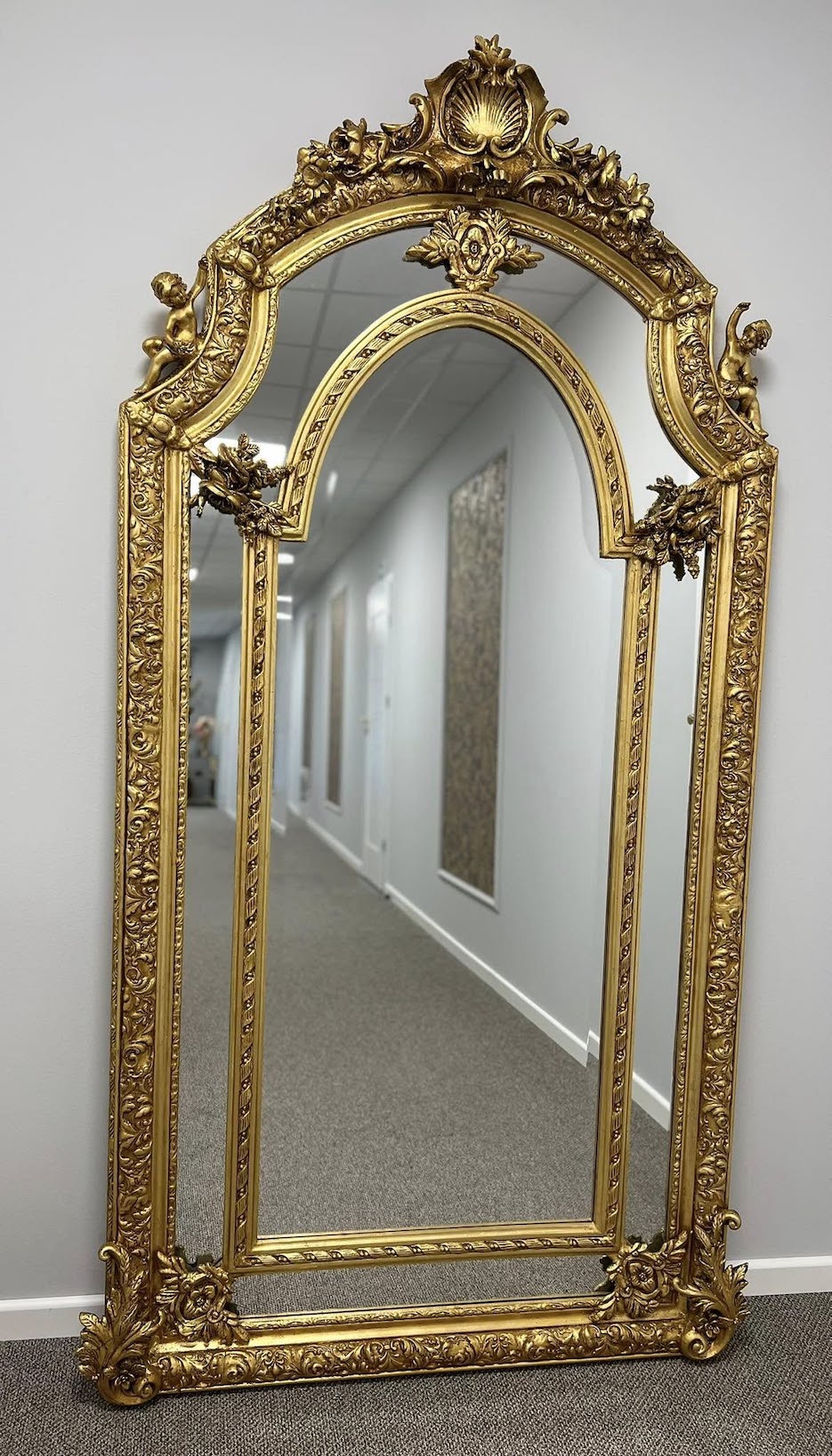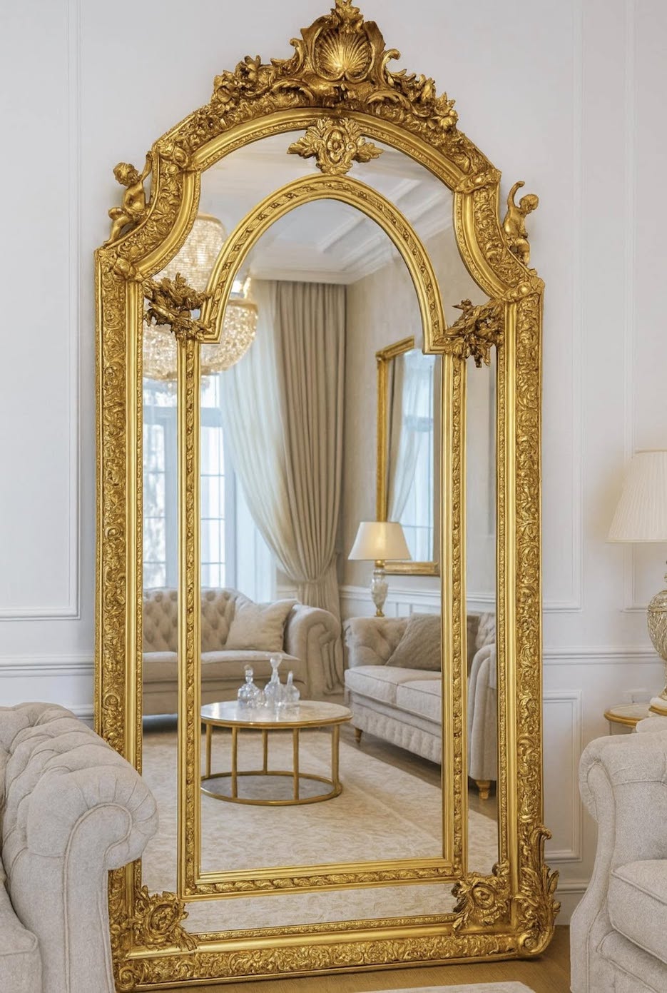 Didelis, dekoratyvus pakabinamas veidrodis su aukso spalvos rėmu, gausiai puoštas barokinio stiliaus įkvėptais ornamentais – kriaukle, cherubinų figūrėlėmis, gėlių girliandomis bei kitomis smulkiomis detalėmis. Šis veidrodis spinduliuoja išskirtine prabanga ir elegancija