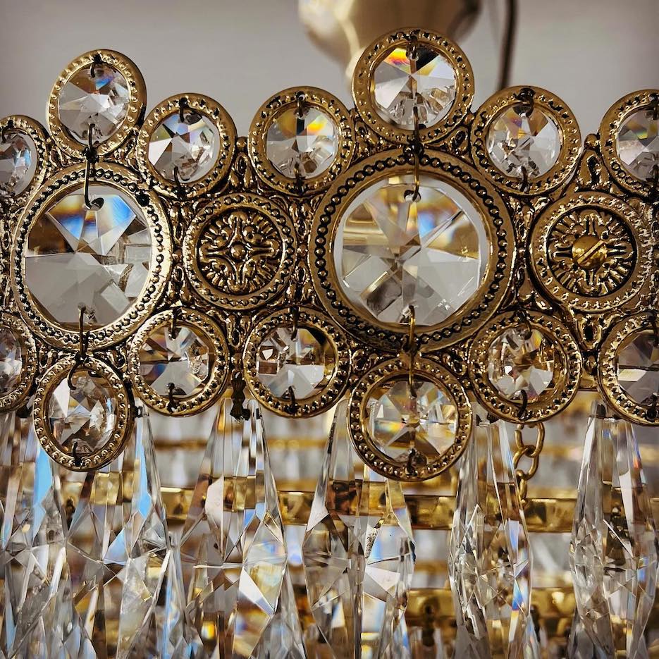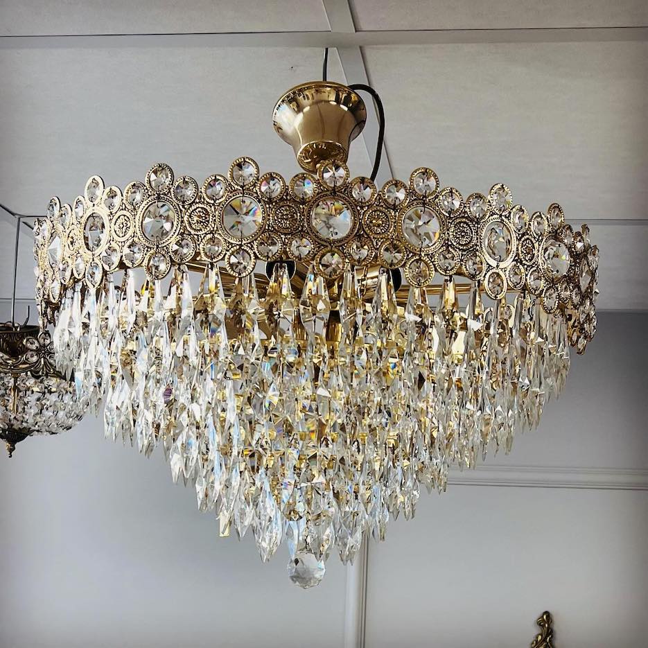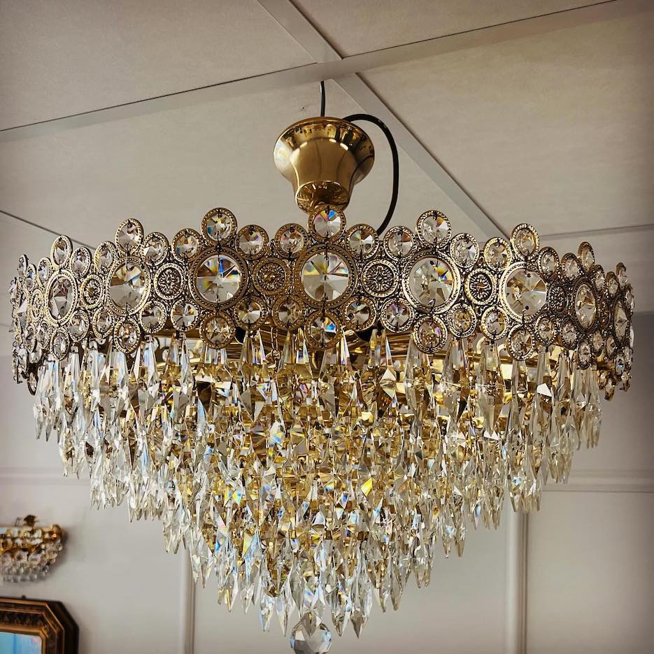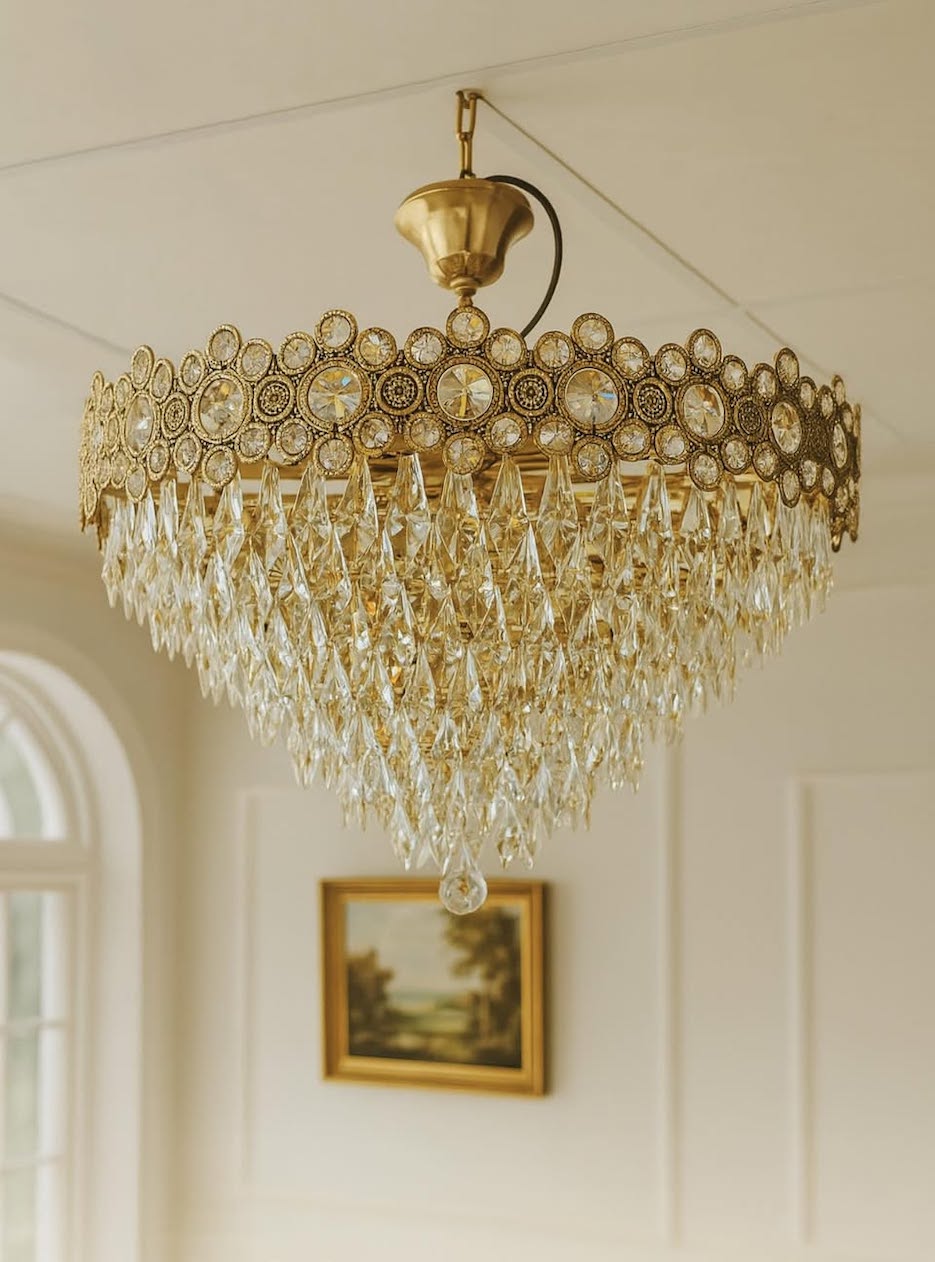 Išraiškingas, detaliai ornamentuotas sietynas, puoštas tankiai sukabintais krištolo lašais, kurie įspūdingai sklaido šviesą ir kuria rafinuotą atmosferą. Apvali forma, gausus krištolų kiekis bei auksu tviskantis rėmas – tai klasikinės elegancijos ir spindesio derinys.