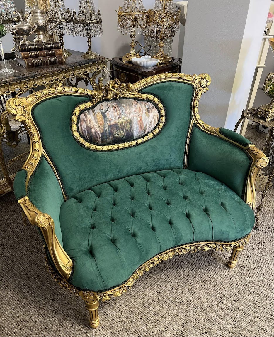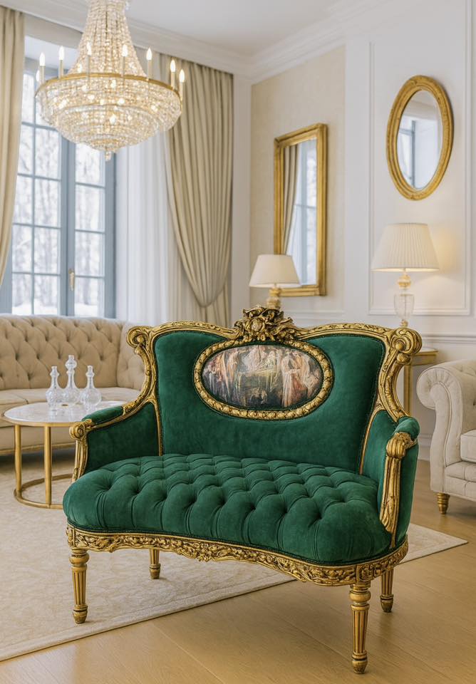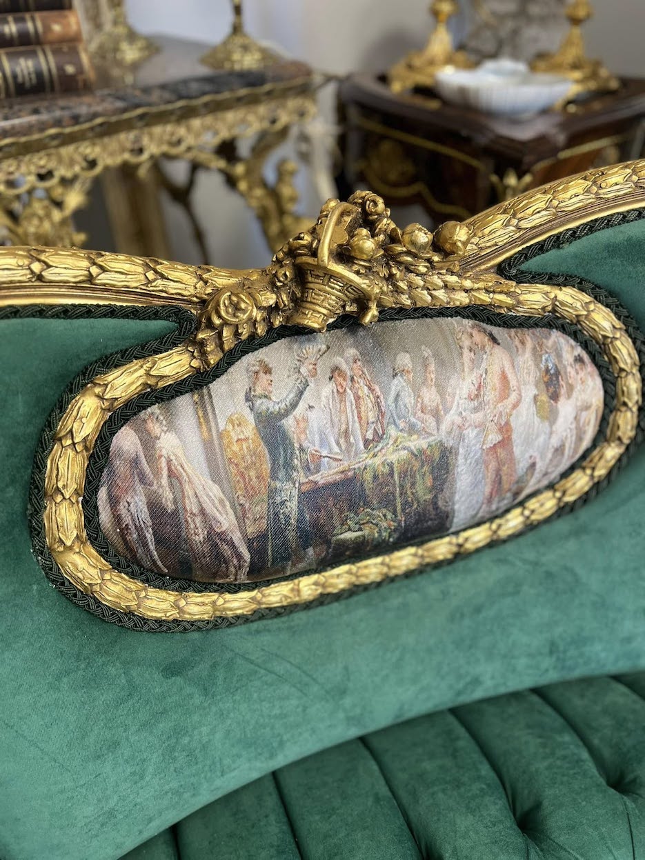 Išskirtinio grožio, dekoratyvus foteliukas su masyviu auksu dengtu rėmu ir sodria smaragdo spalvos veliūro apmušalu. Atlošo centre įkomponuotas audinio paveikslėlis – rūmų scenos motyvais, suteikiantis dar daugiau autentiškumo bei aristokratiško žavesio.