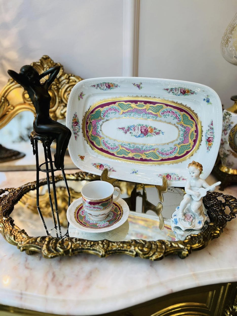 Išmatavimai: serviravimo lėkštė/padėkliukas – 31×22 cm, espresso puodelis su lėkštute – talpa 80 ml