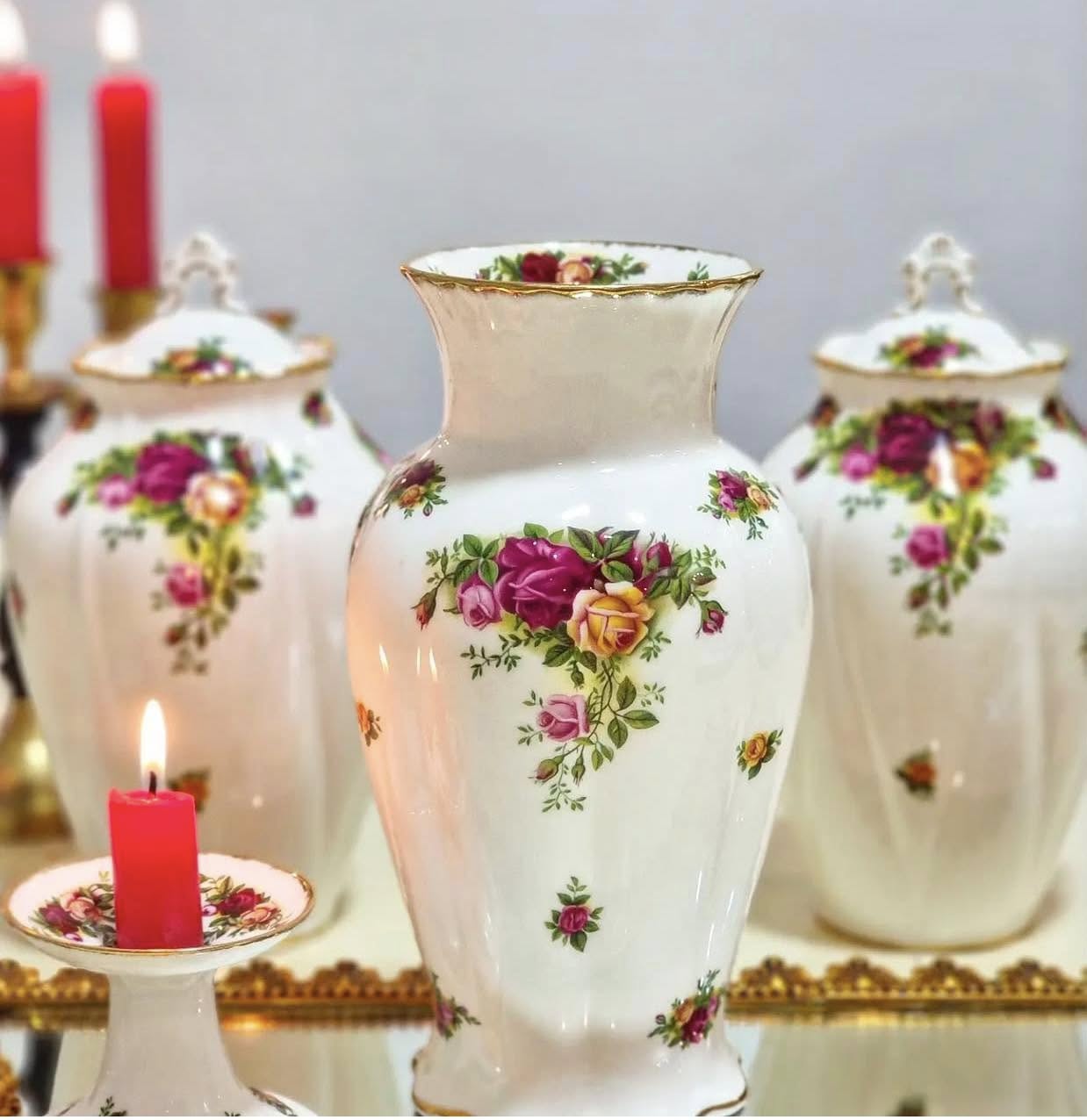 Elegantiška ir puošni vaza, skirta gėlėms, dekoruota klasikinėmis rožių puokštėmis. Tai viena žymiausių Royal Albert kolekcijų, vertinama dėl savo išskirtinio dizaino ir kokybės.