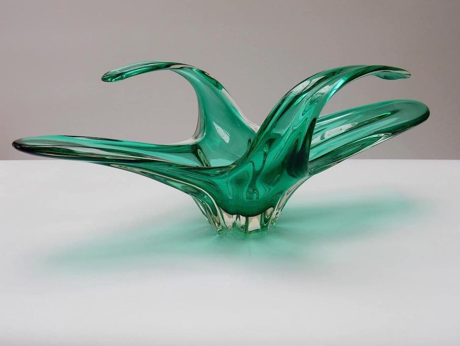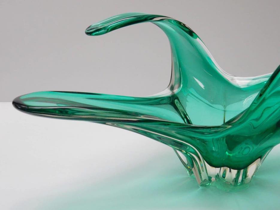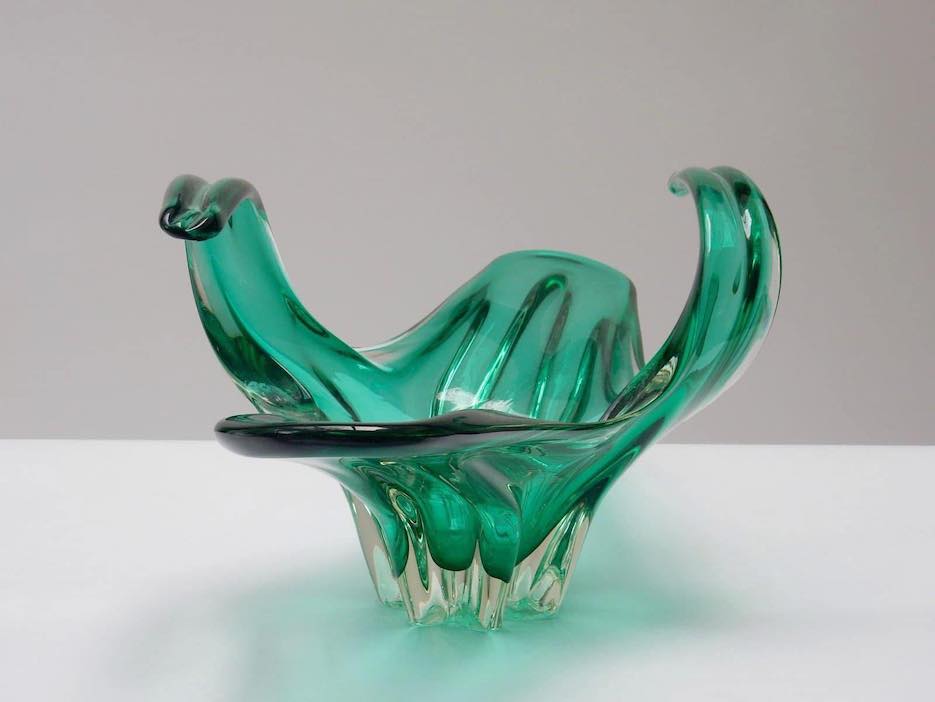 Unikali, rankų darbo pūsto stiklo dubuo–vaza, pagaminta Belgijoje apie 1970-uosius. Žaliosios bangos formos dizainas išsiskiria išraiškingomis linijomis ir lengvumu, kuris būdingas tik autentiškai „Mid-Century Modern“ estetikai.