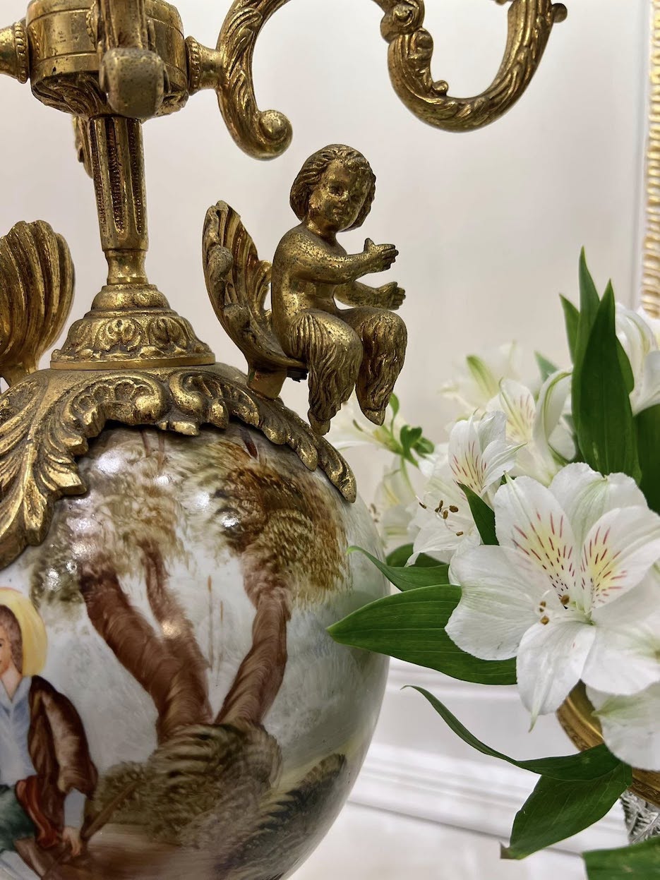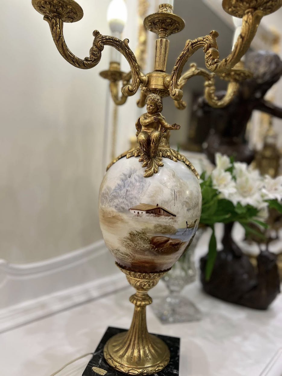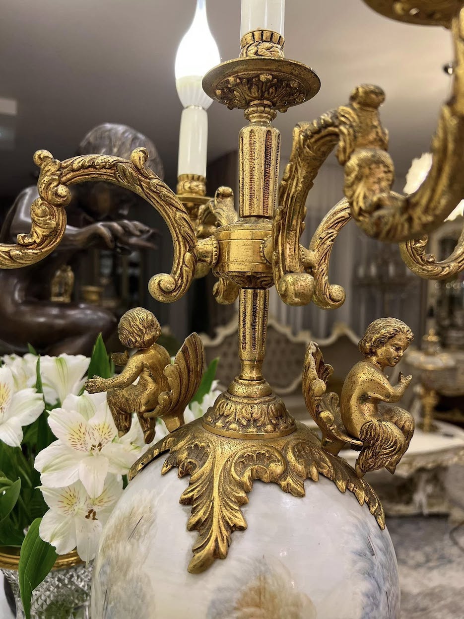 ♦ Lempos pagrindą sudaro masyvi juodo marmuro bazė, ant kurios iškelta elegantiška bronzinė konstrukcija suangelų figūromis ir penkiomis šakomis žvakidės formos. Centrinę dalį puošia didelis porcelianinis indas su rankų darbo tapyba, vaizduojančia pastoralinę sceną – subtili nuoroda į Fragonard ir rokoko dailės tradicijas.