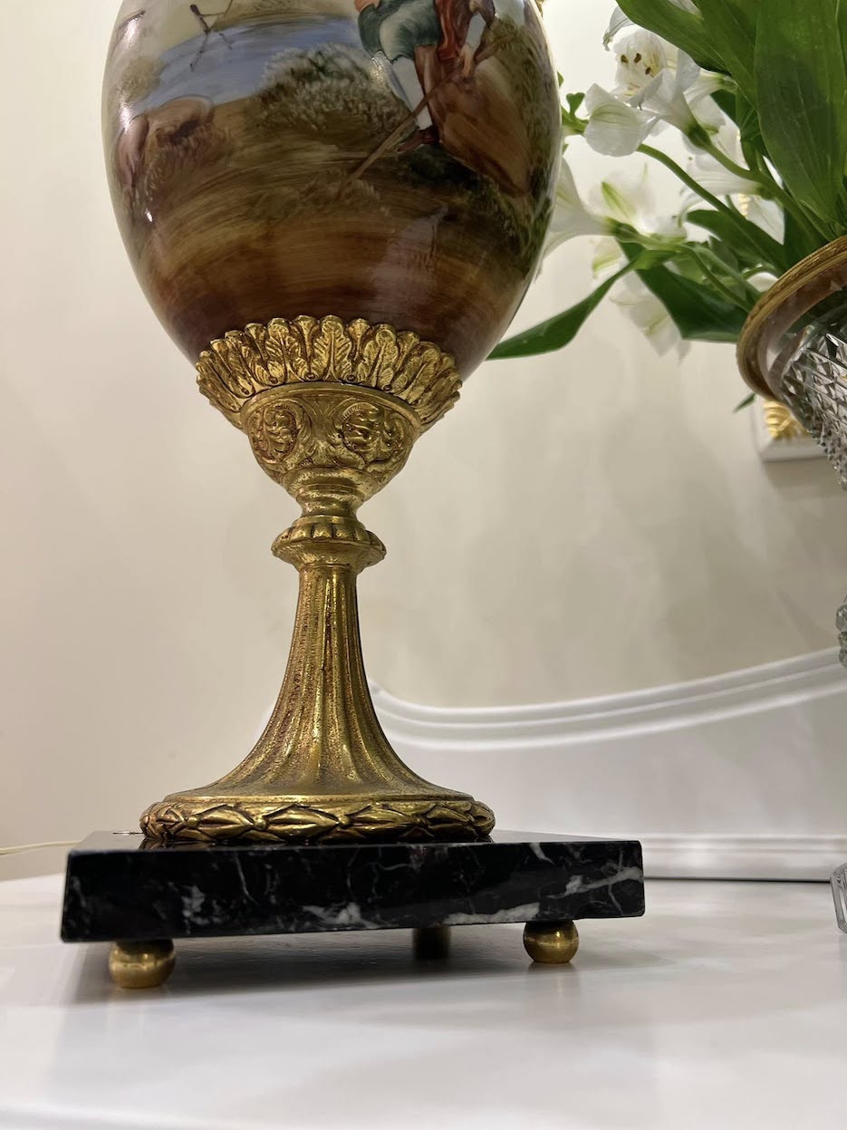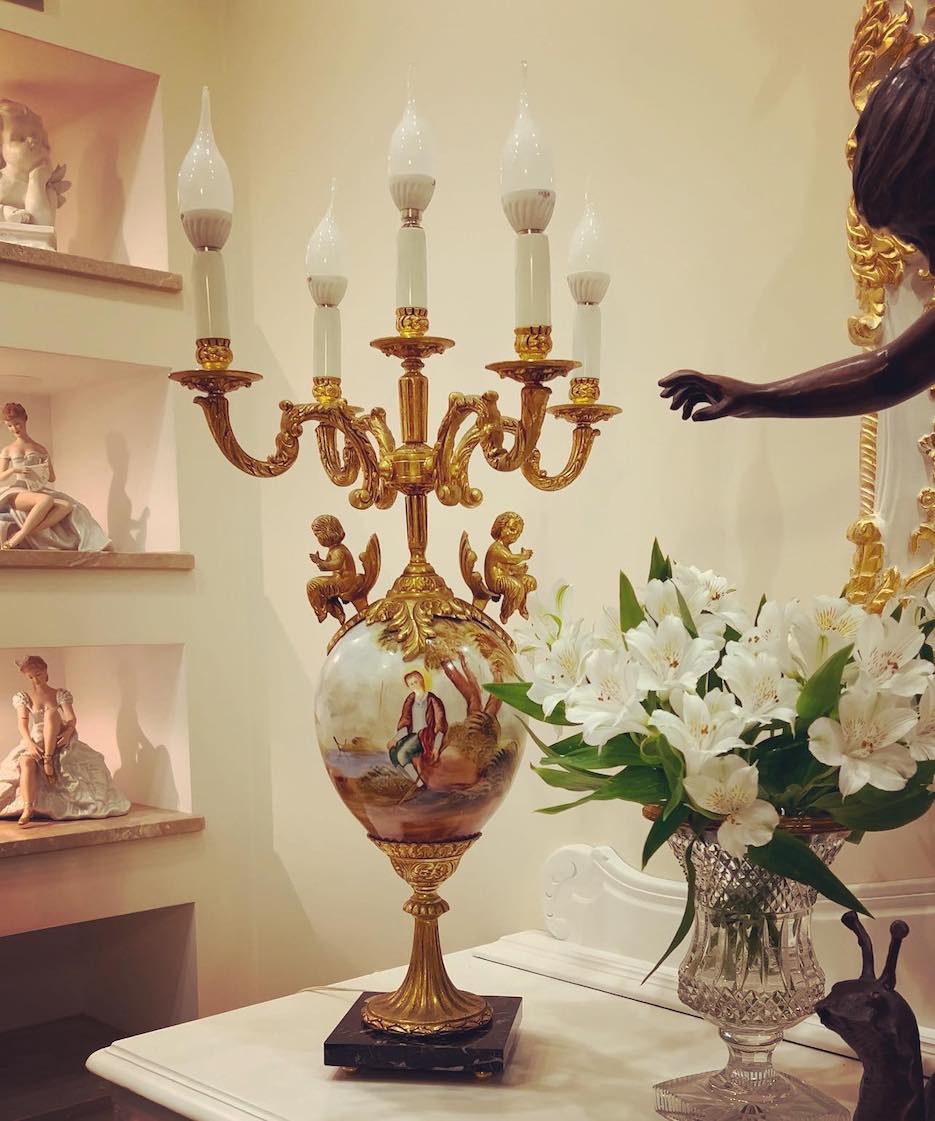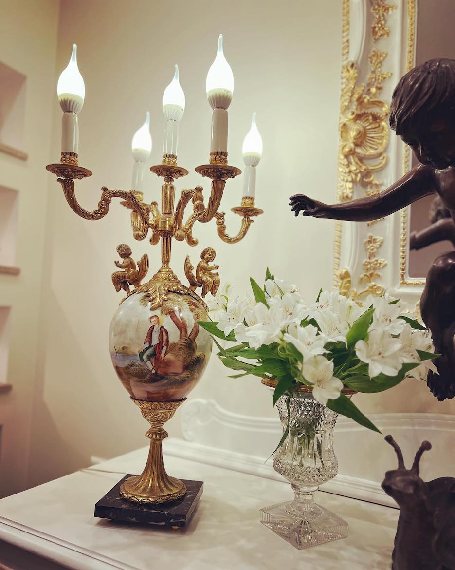 ♦ Lempos pagrindą sudaro masyvi juodo marmuro bazė, ant kurios iškelta elegantiška bronzinė konstrukcija suangelų figūromis ir penkiomis šakomis žvakidės formos. Centrinę dalį puošia didelis porcelianinis indas su rankų darbo tapyba, vaizduojančia pastoralinę sceną – subtili nuoroda į Fragonard ir rokoko dailės tradicijas.