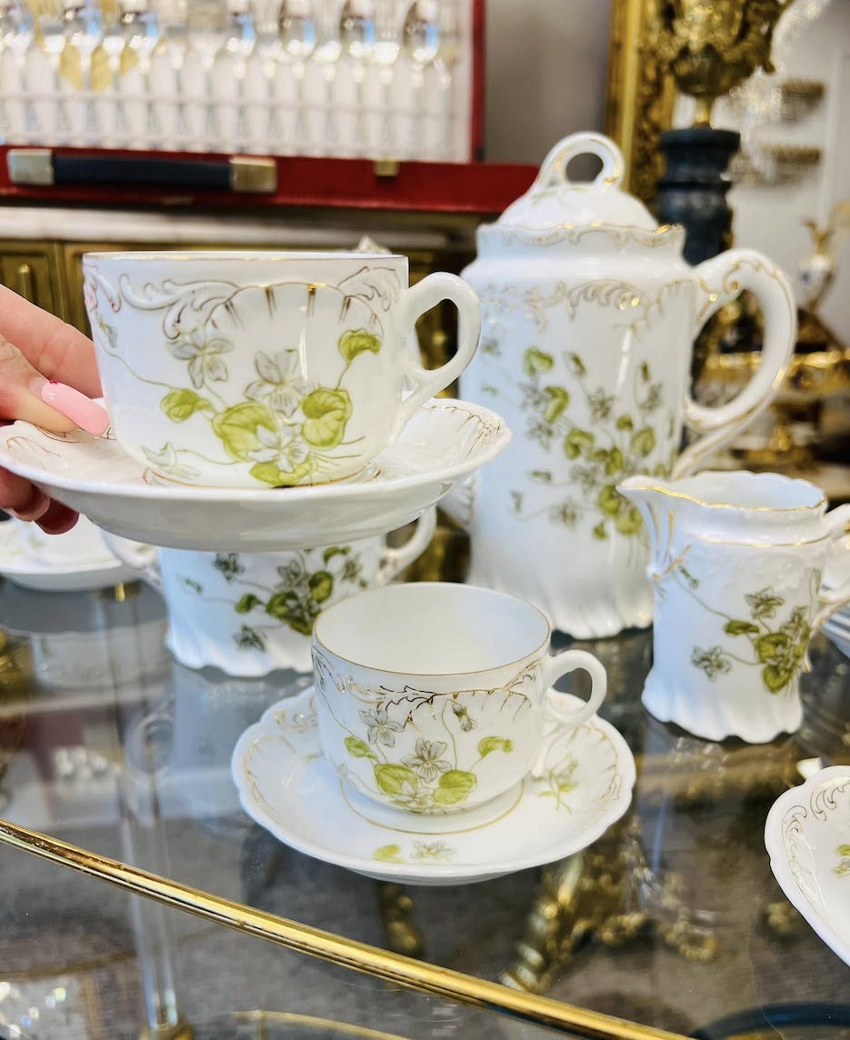 Unikalus ir elegantiškas, daugiau nei 100 metų senumo antikvarinis kaulinio porceliano servizas, pagamintas garsiojoje Porsgrunds Porselænsfabrik (Norvegija, apie 1900–1920 m.). Šis ankstyvas gamyklos darbas žavi unikalia, reljefine forma ir subtiliu ranka pieštu žalsvų gėlių dekoru su paauksavimu – būdingu jugendo (Art Nouveau) epochai.