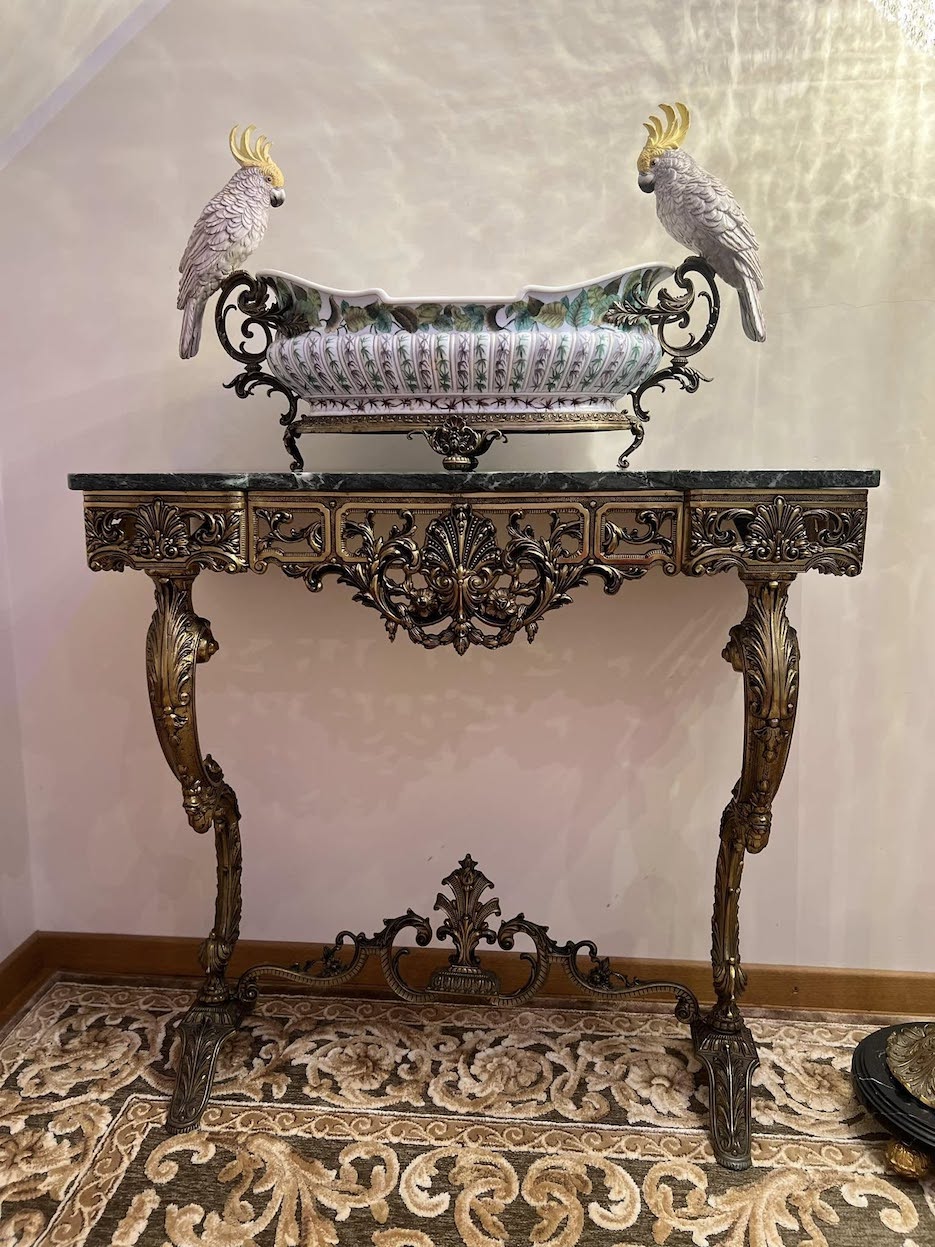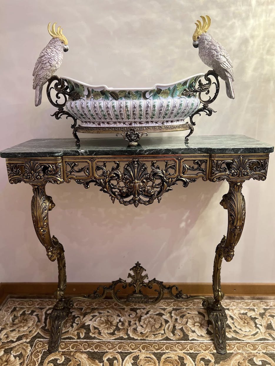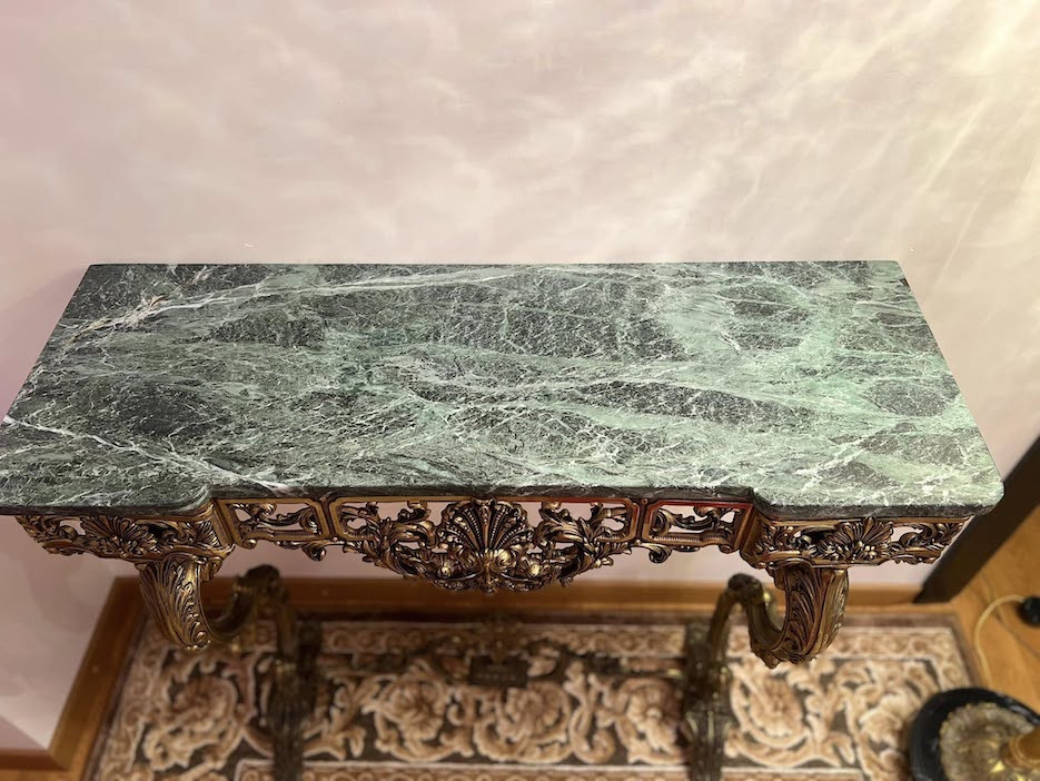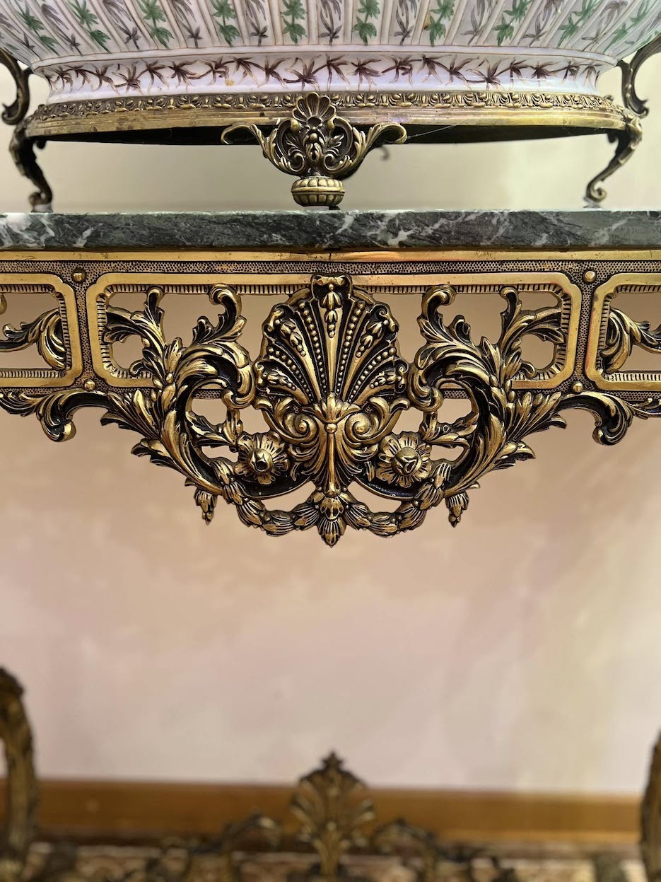 Solidi ir puošni bronzinė konsolė su žaliu marmuru – išraiškingas klasikinio interjero akcentas. Masyvi bronzinė konstrukcija dekoruota gausiais reljefiniais ornamentais, grakščiomis kojomis ir subtiliomis detalėmis.