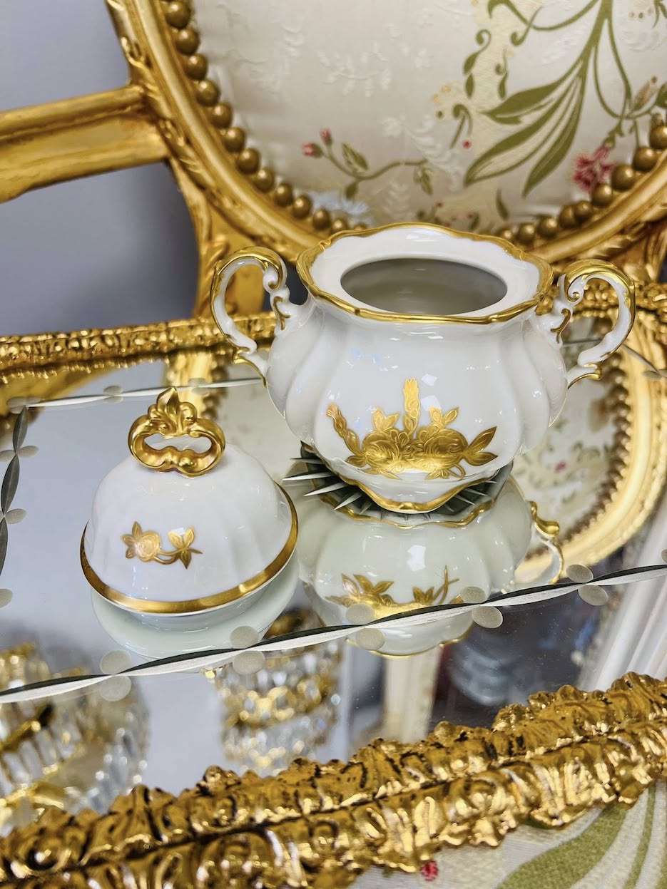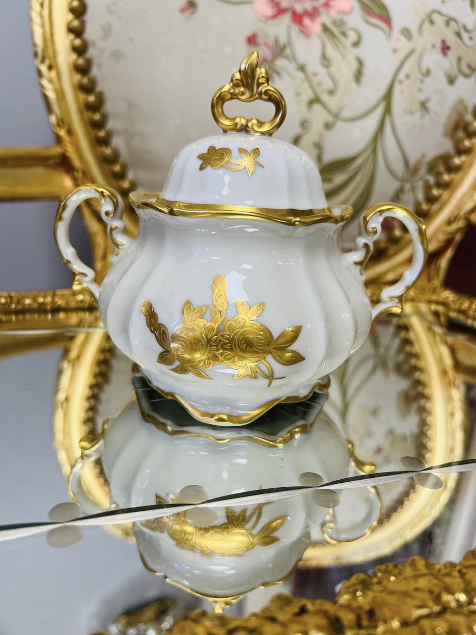 Hutschenreuther Selb Bavaria Germany vintažinė, dramblio kaulo spalvos cukrinukė. Dekoruota rankomis. Gamybos metai apie 1950m.