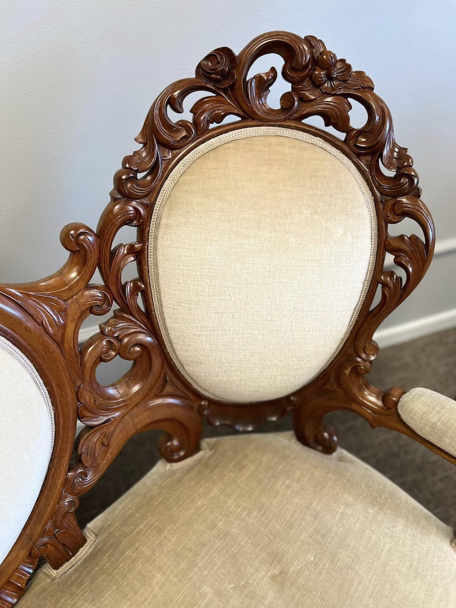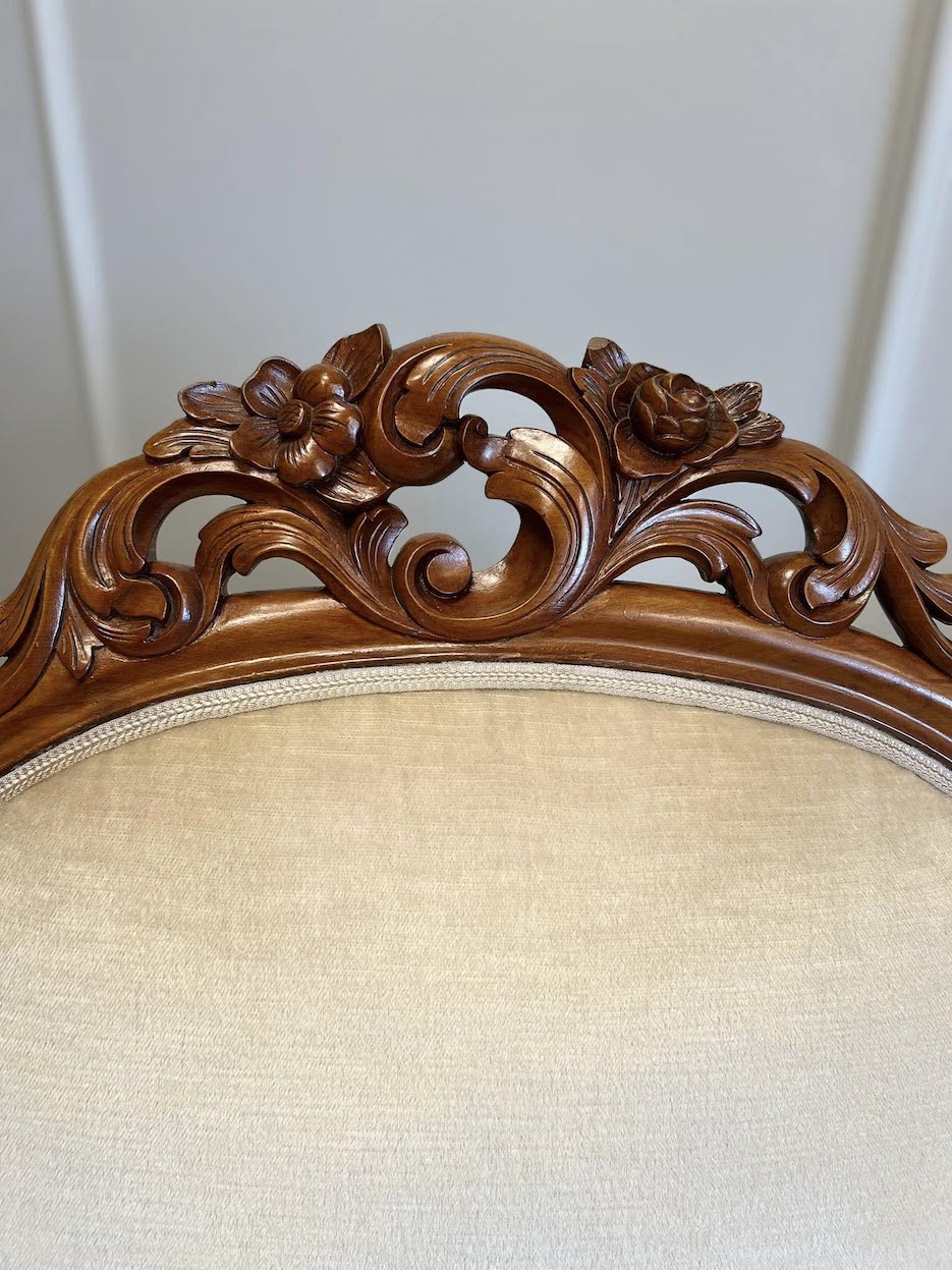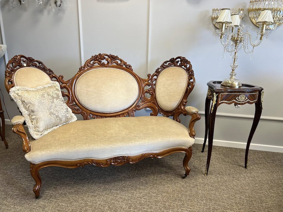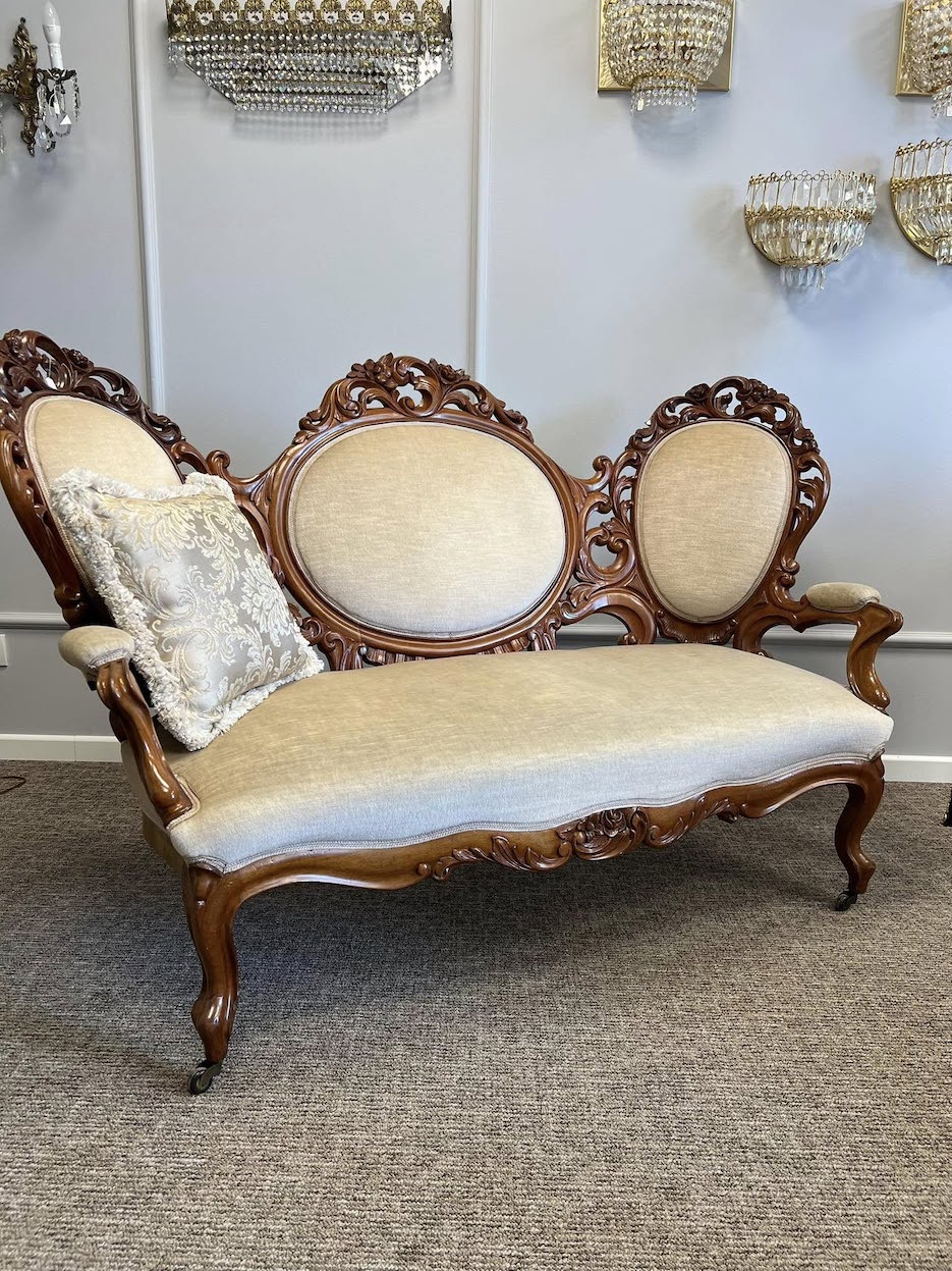 Labai graži, Viktorijos stiliaus sofa su išraiškingais, rankų darbo raižiniais ir subtilia, šviesaus atspalvio gobeleno apdaila. Šis baldas atspindi XIX a. vidurio estetiką – eleganciją, prabangą ir amžiną klasiką.
