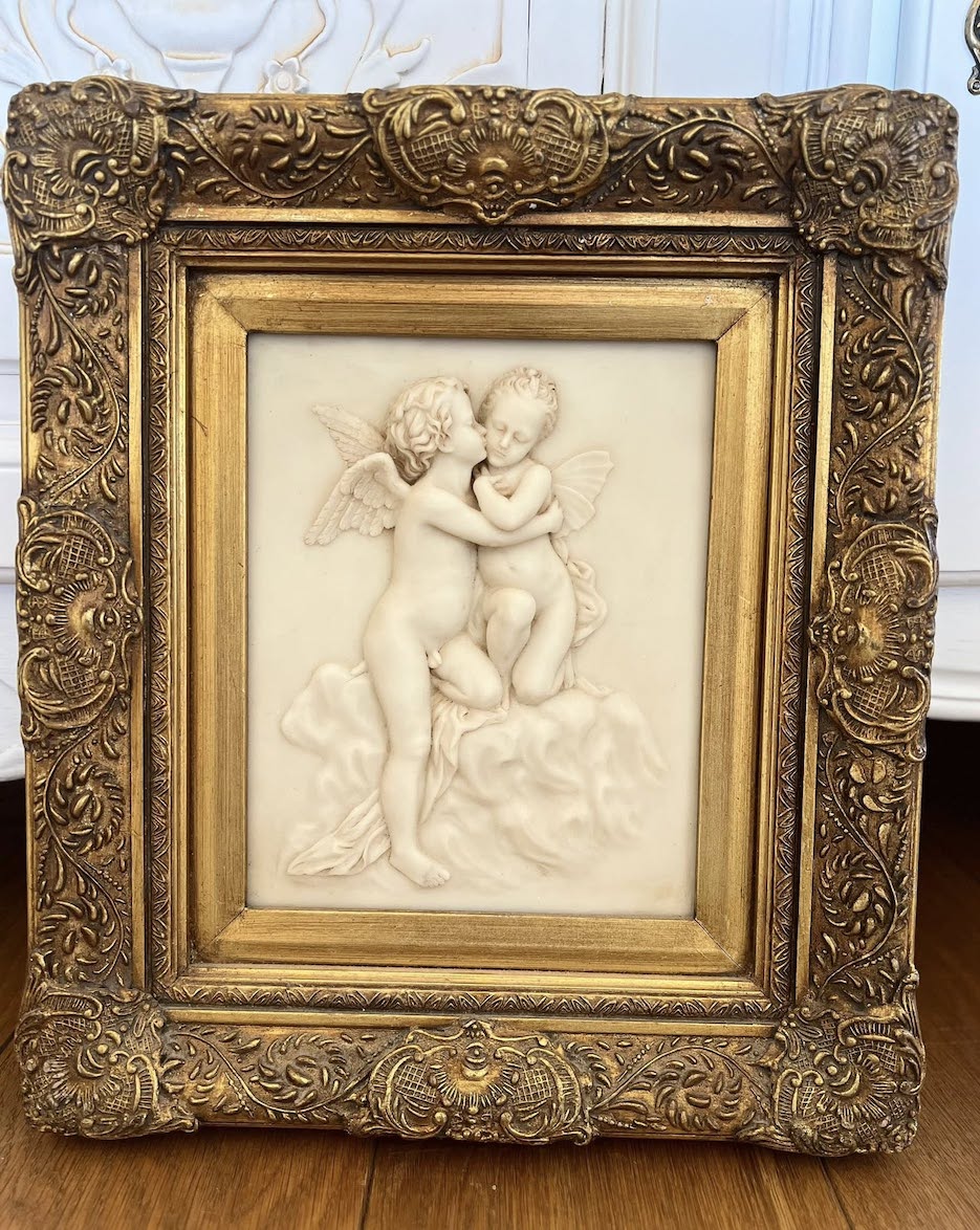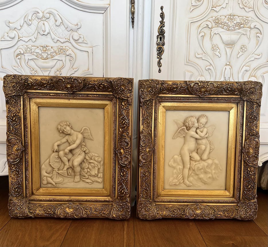 Du vintažiniai poriniai paveikslai, kabinami ant sienos. Angelų tematika – ramūs, klasikiniai motyvai, artimi senojo Europos interjero estetikai.