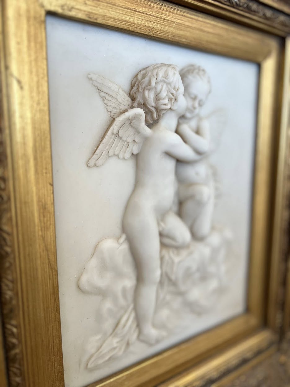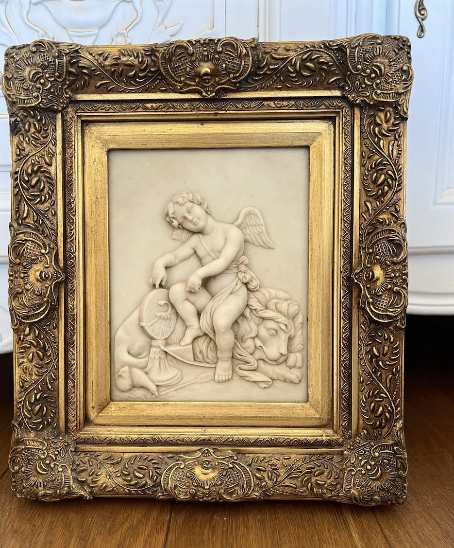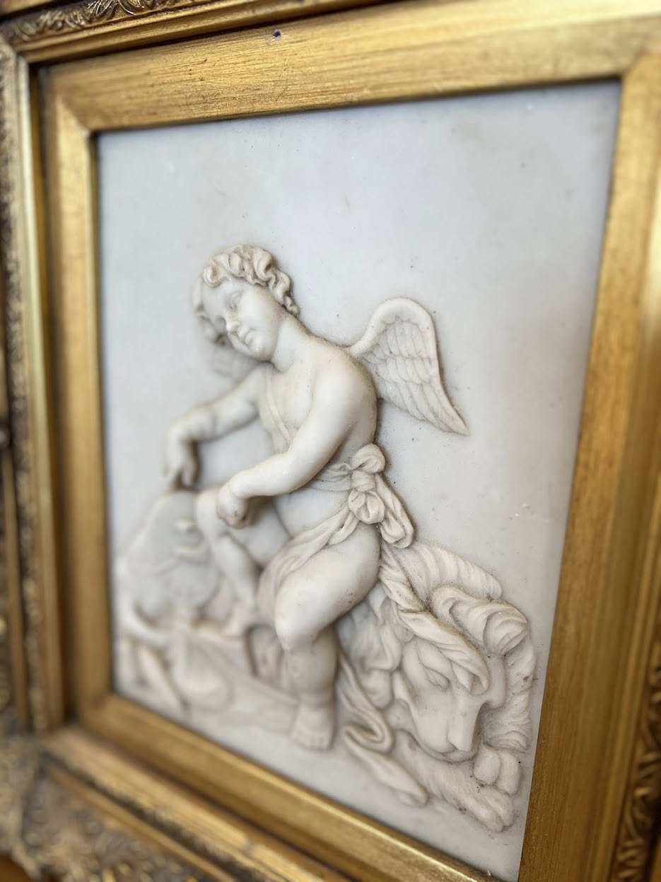 Reljefinės plokštelės (alebastro / kompozicinės masės) įkomponuotos į puošnius, aukso spalvos medinius rėmus.