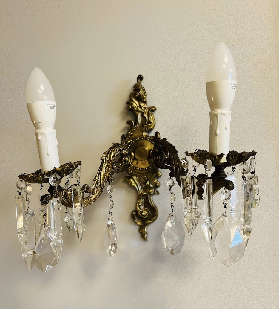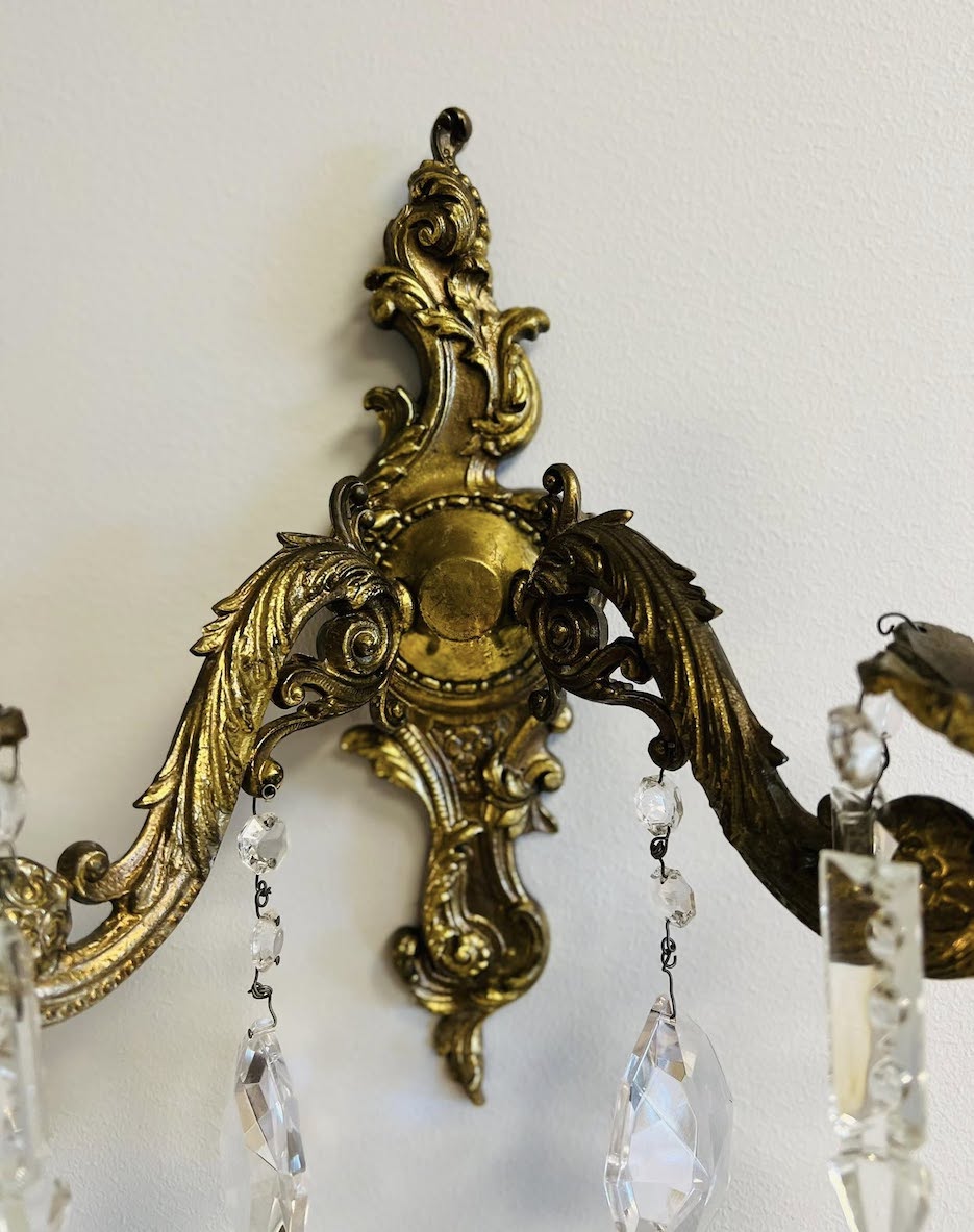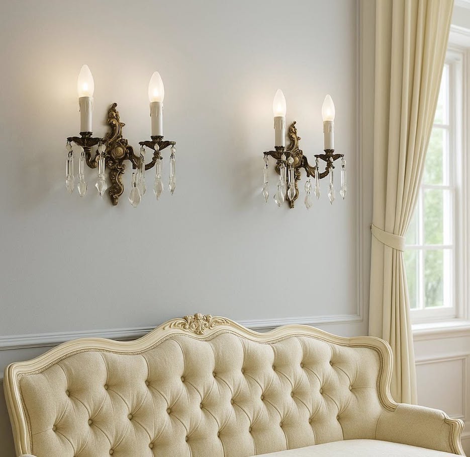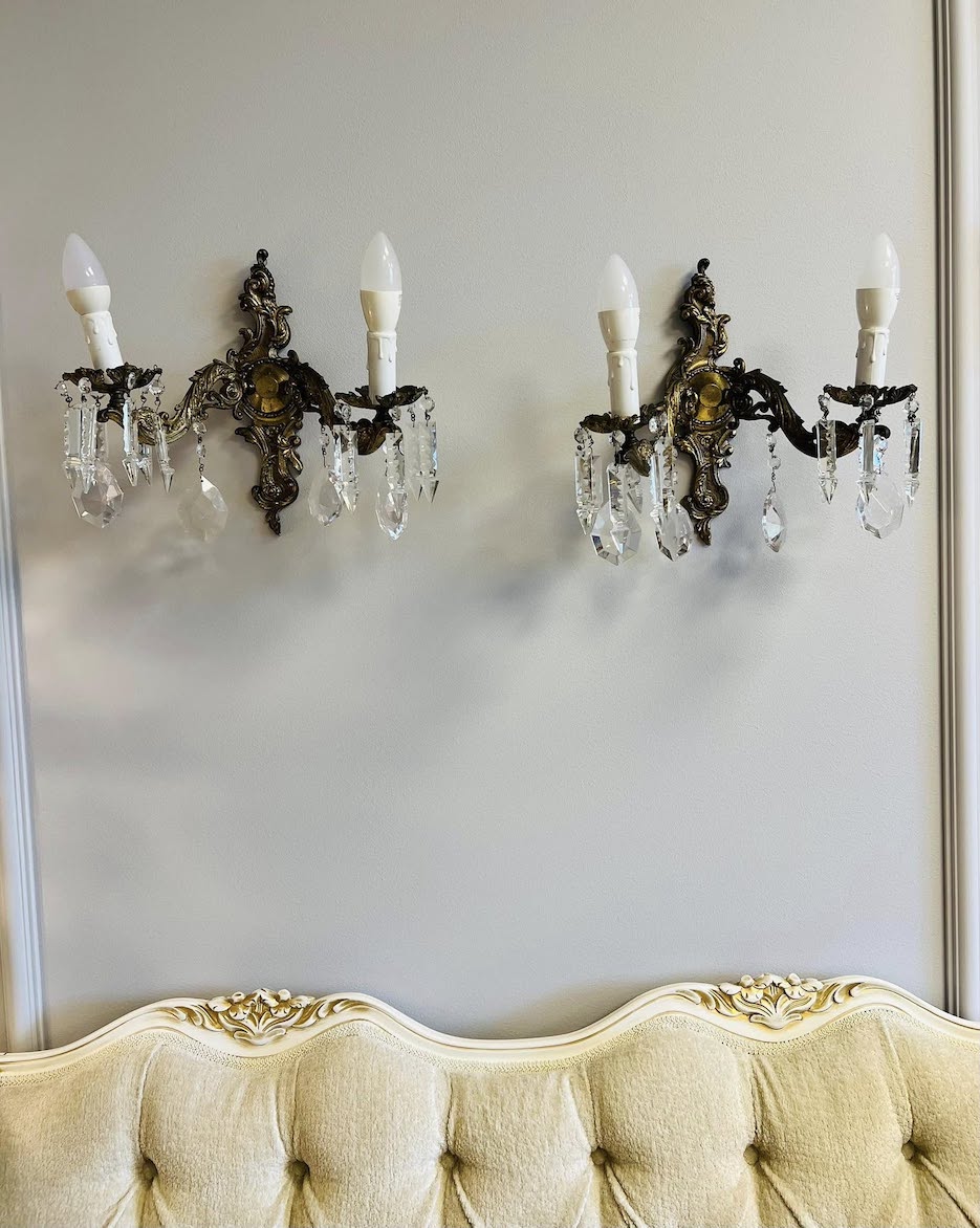 Vintažiniai ir dekoratyvūs, klasikinio dizaino sieniniai šviestuvai, pagaminti iš bronzos ir puošti prancūziško krištolo pakabukais.