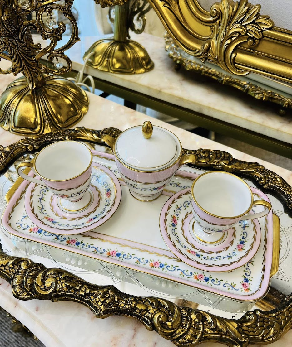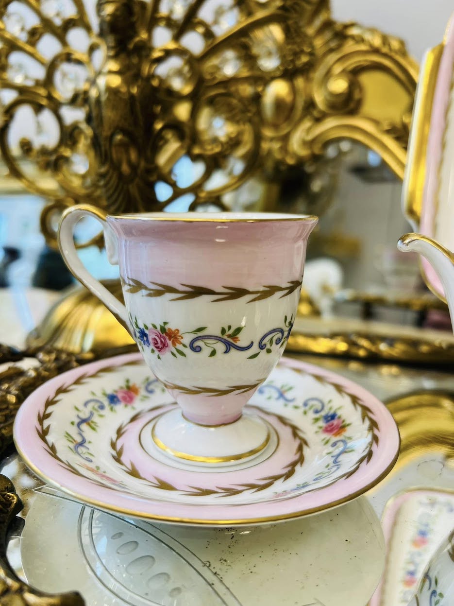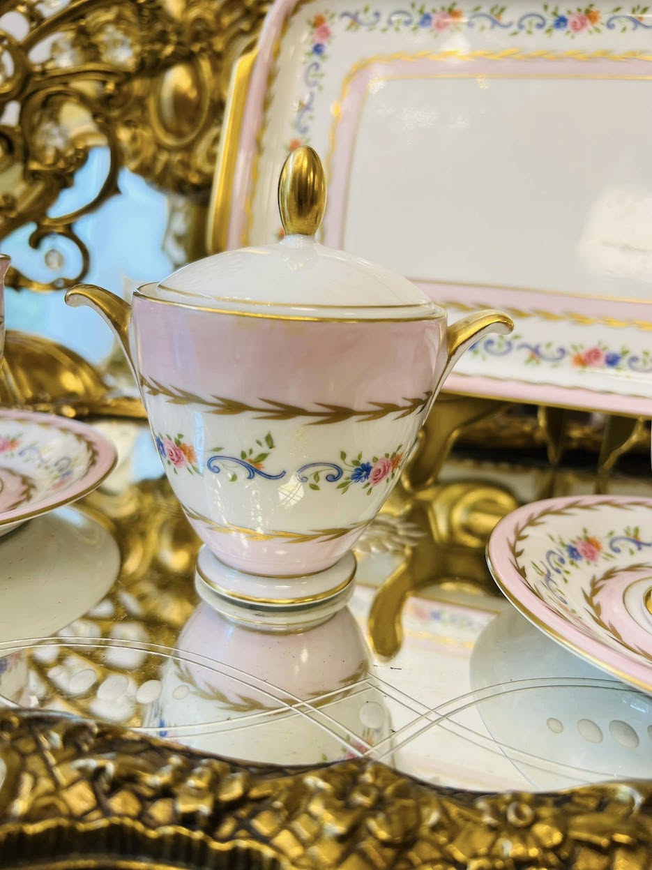 Labai gražutis Hertel Jacob Bavaria (1969 m.) rankų darbo porcelianas tiesiai iš Vokietijos! Švelniai rožinės spalvos, su aukso puošyba ir gėlių ornamentais – labai retas ir kerintis dizainas.