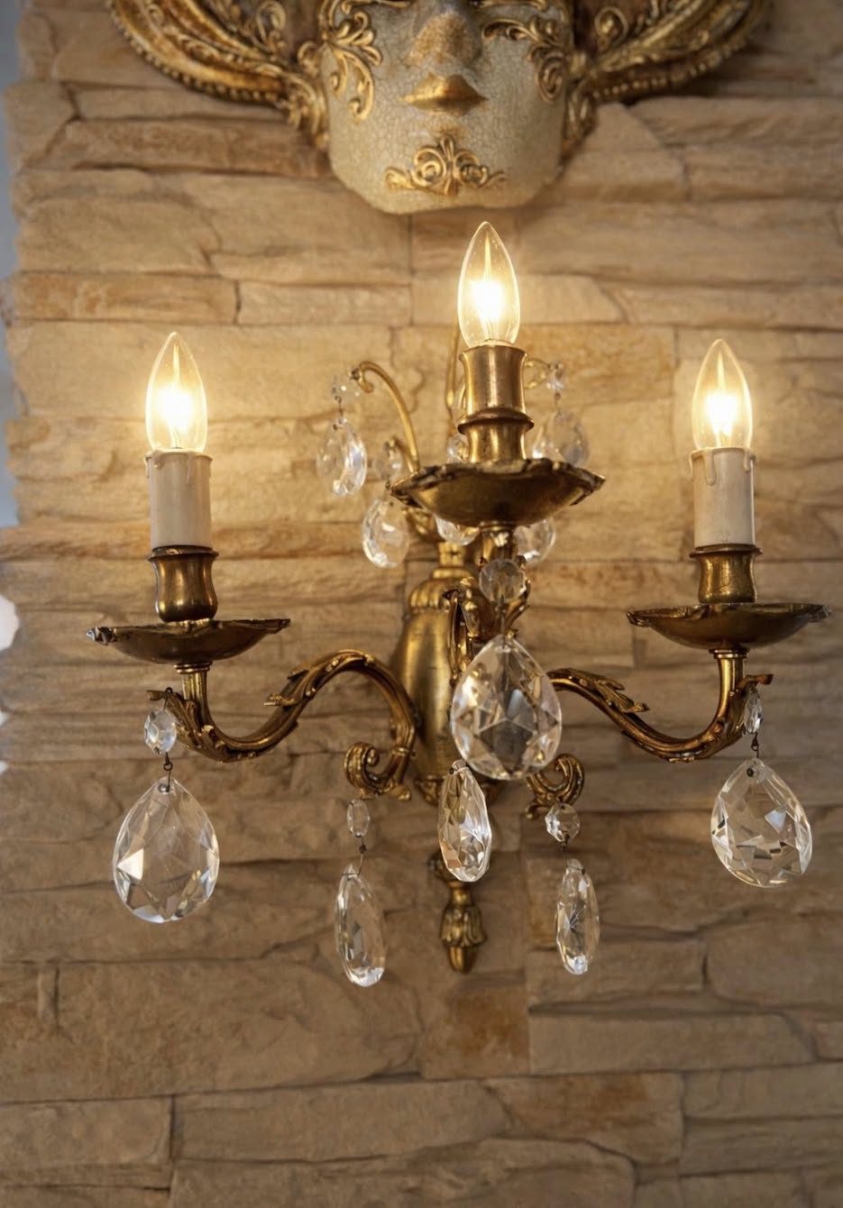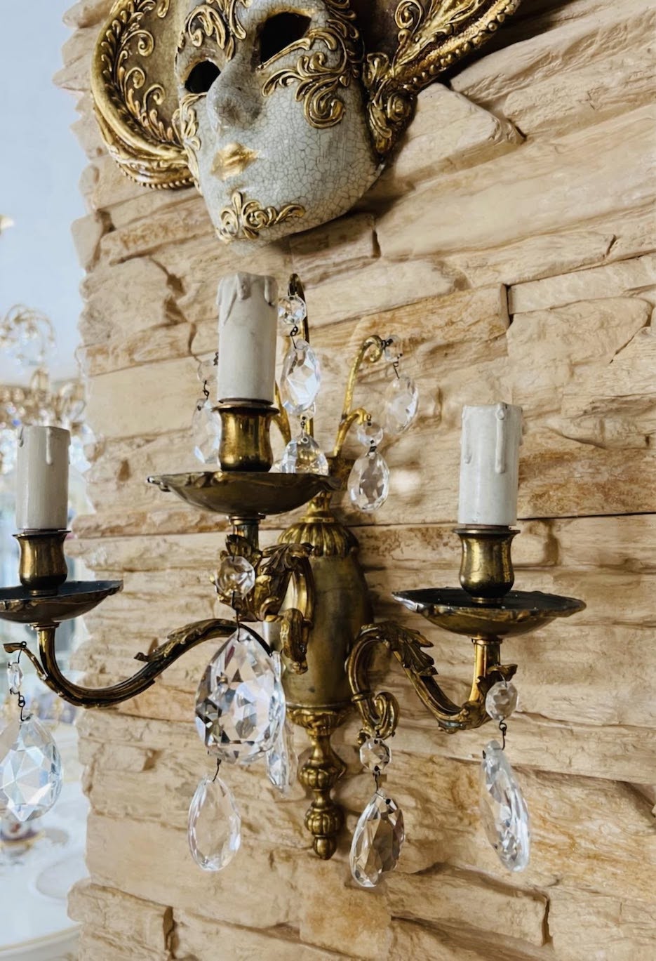 Autentiškas vintažinis sieninis bra iš žalvario – subtilus, bet išraiškingas interjero akcentas. Trys grakščiai išlenktos šakos, dekoruotos krištolo pakabukais.