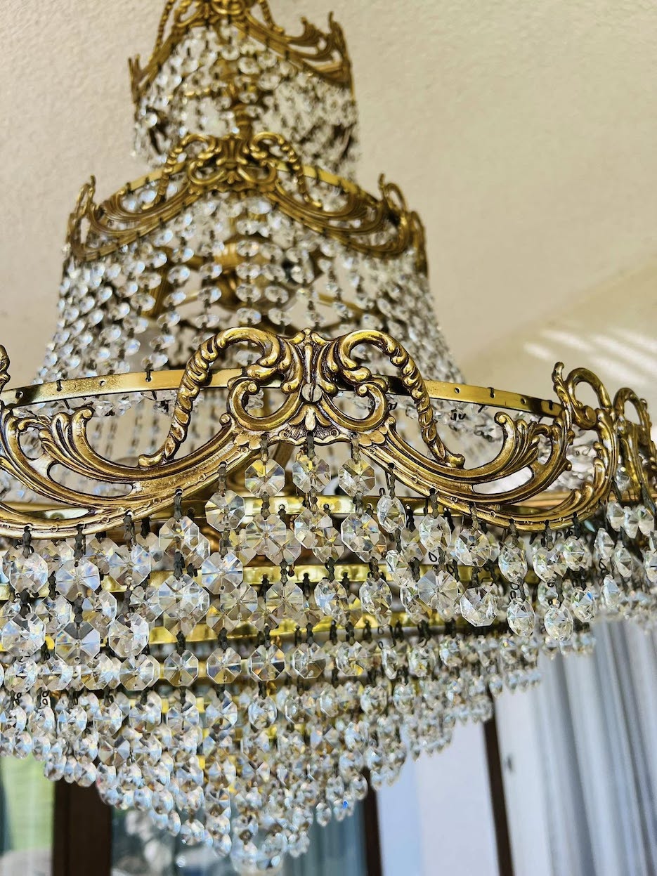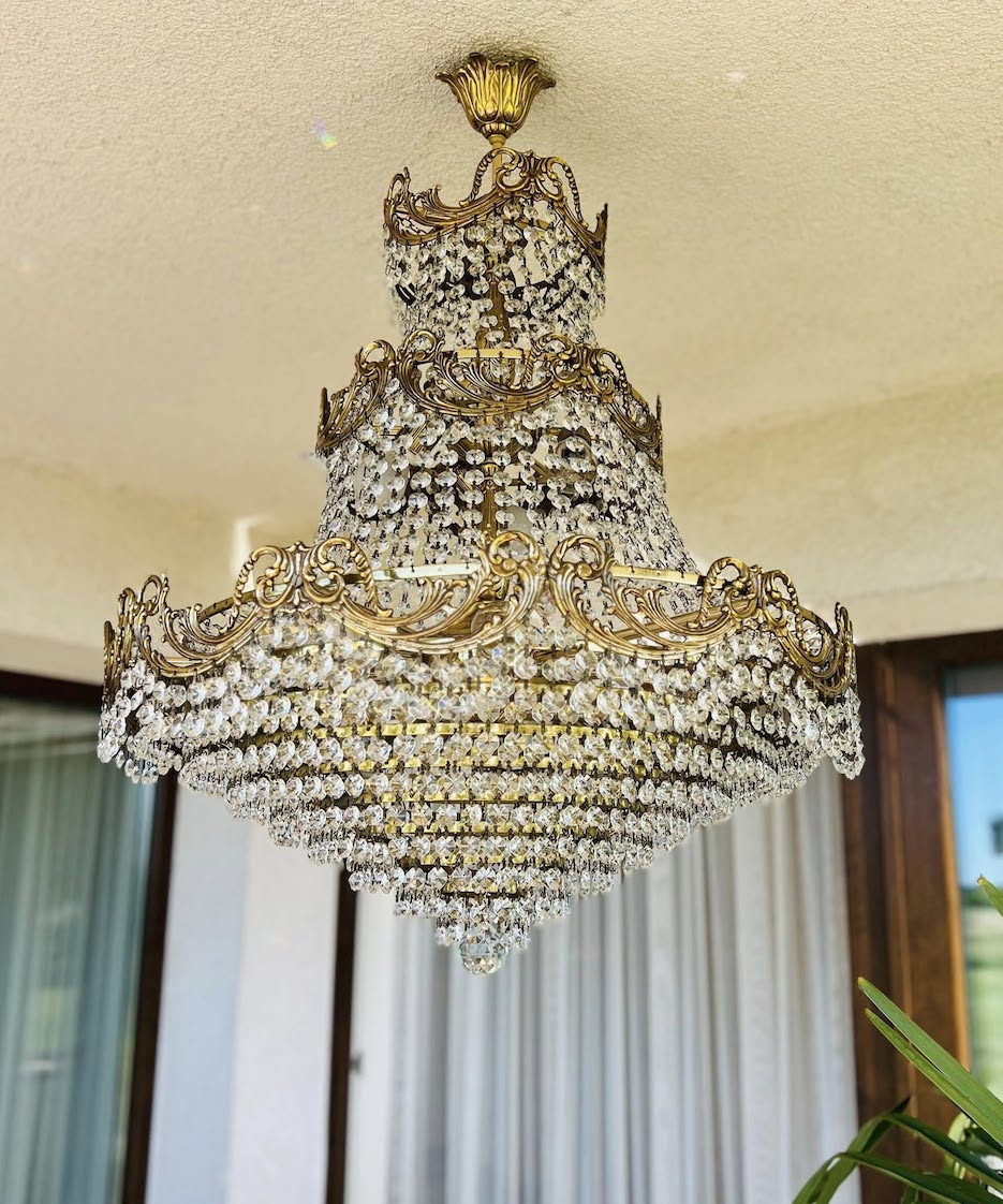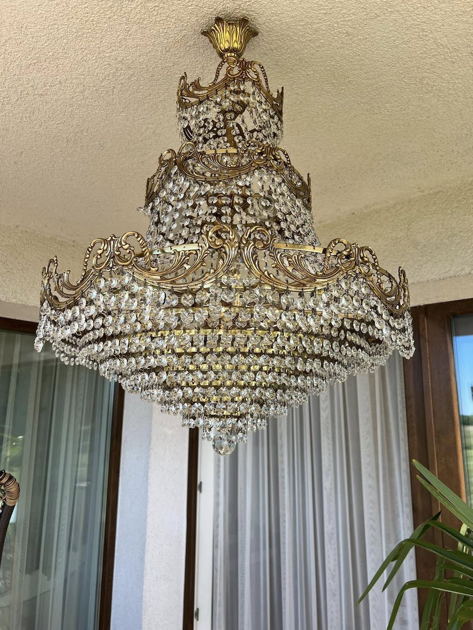 Didelis, trijų aukštų krištolo sietynas su dekoratyviu ažūriniu bronzos rėmu. Pagamintas XX a. viduryje, Louis XVI stiliaus interpretacija, būdinga simetrija ir klasikiniai ornamentai. Gausiai dekoruotas krištolo karoliukais.