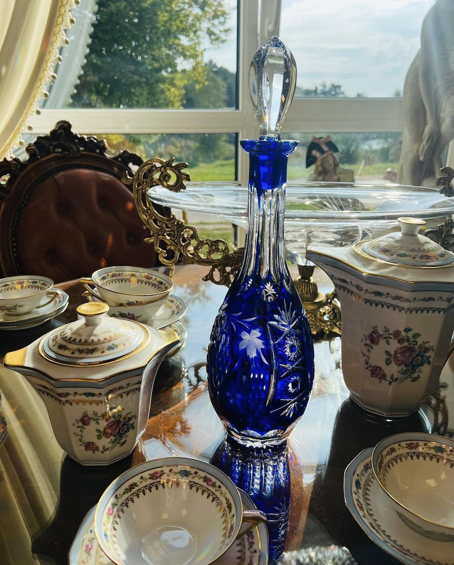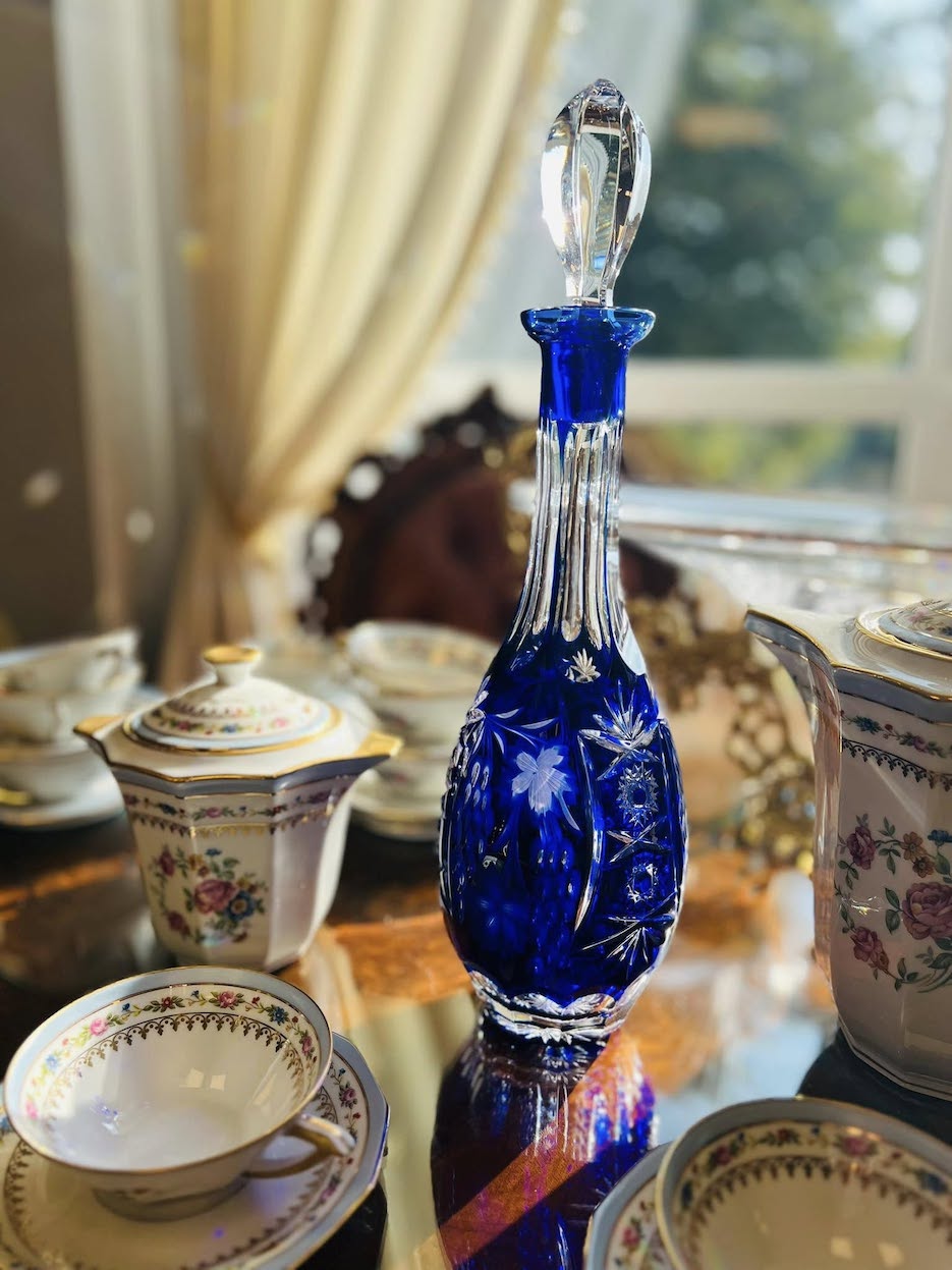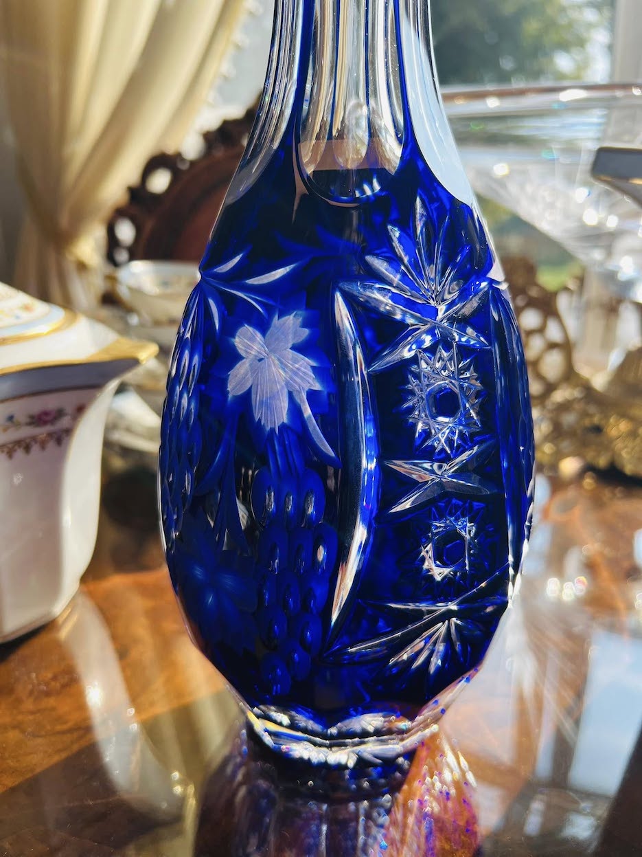 Vintažinis Nachtmann krištolo grafinas – dekanteris vynui. . Išskirtinis kobalto mėlio spindesys ir preciziškai išraižytos žvaigždžių kompozicijos – tai vokiško krištolo meistrystės pavyzdys.